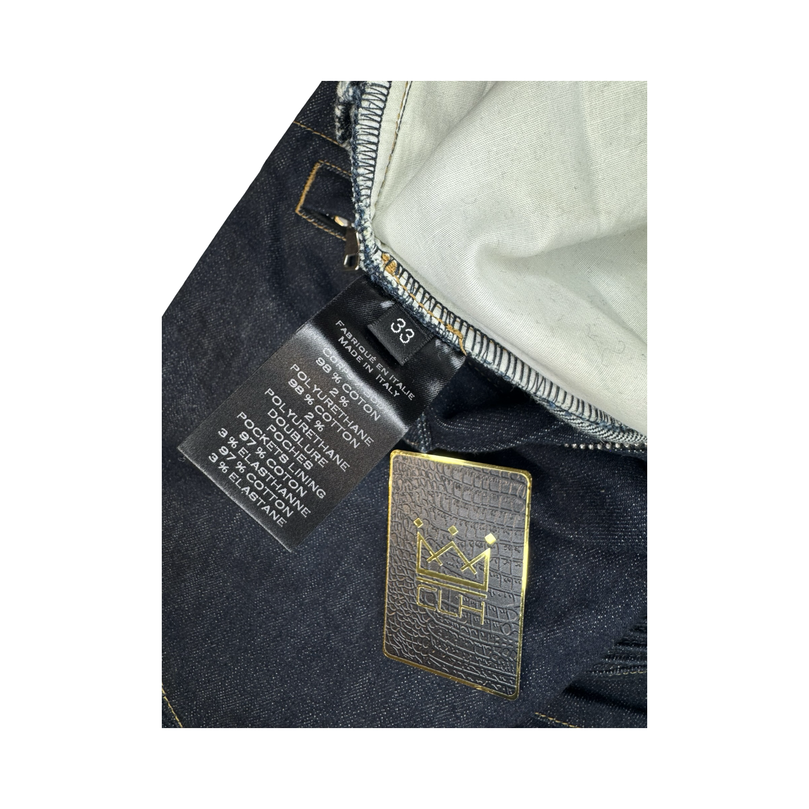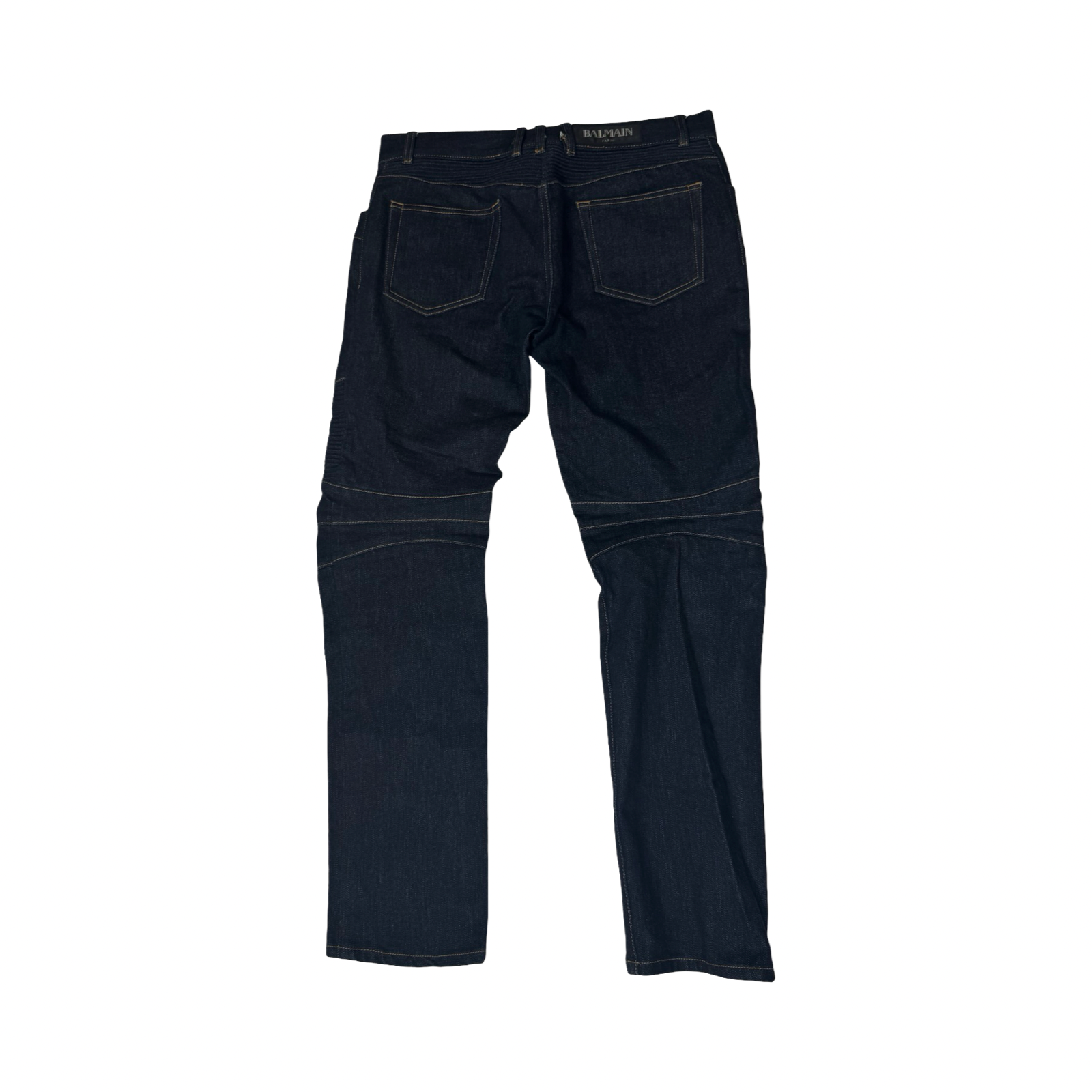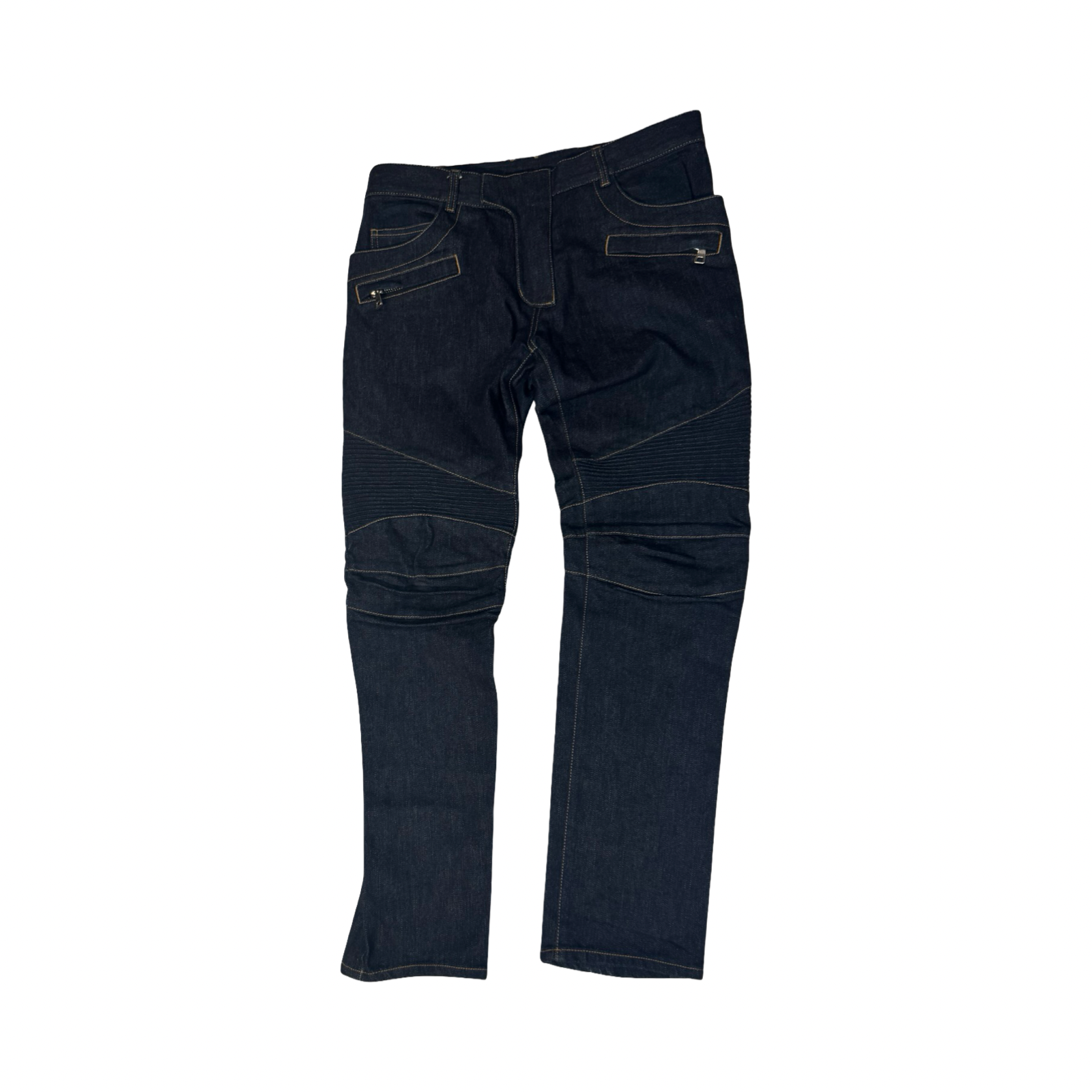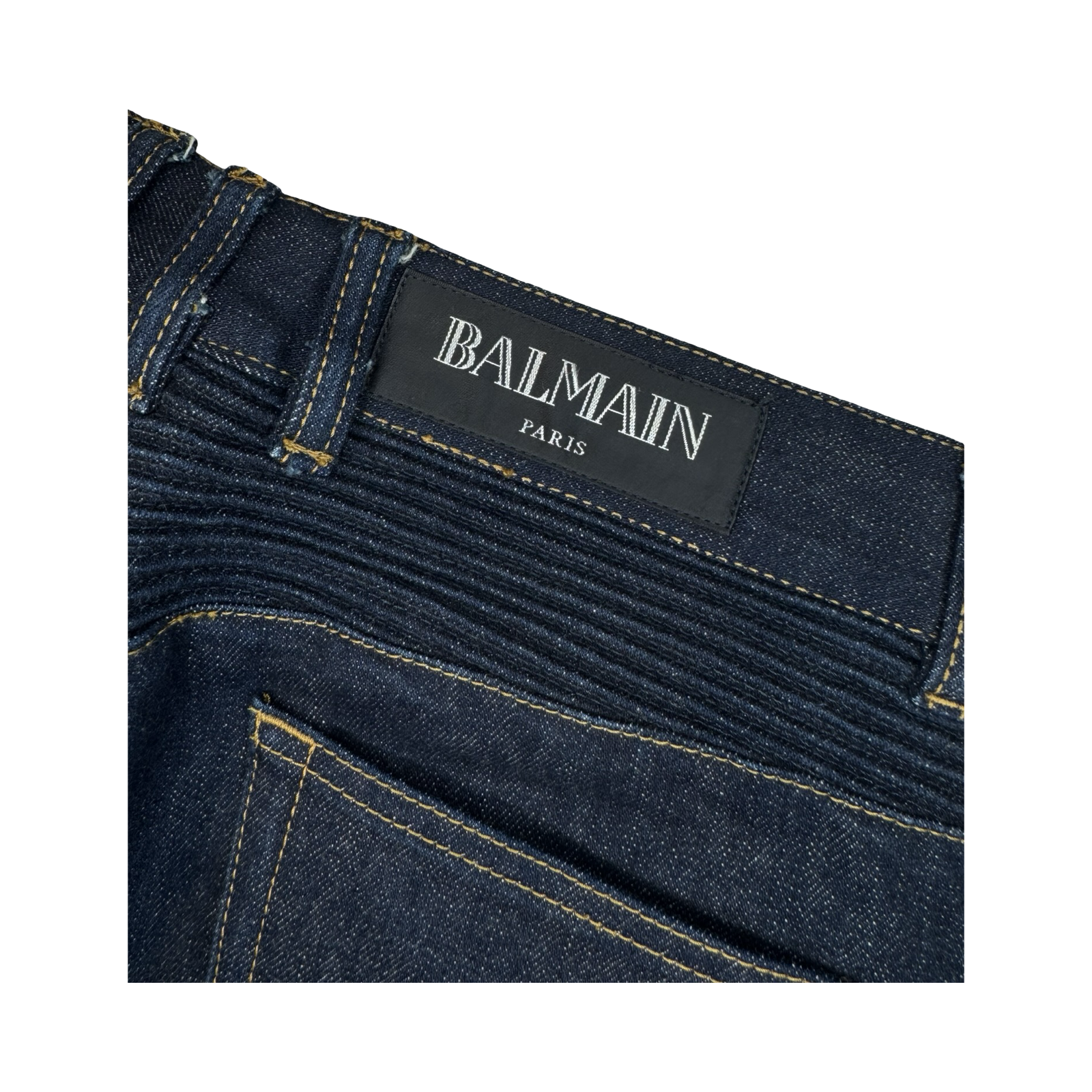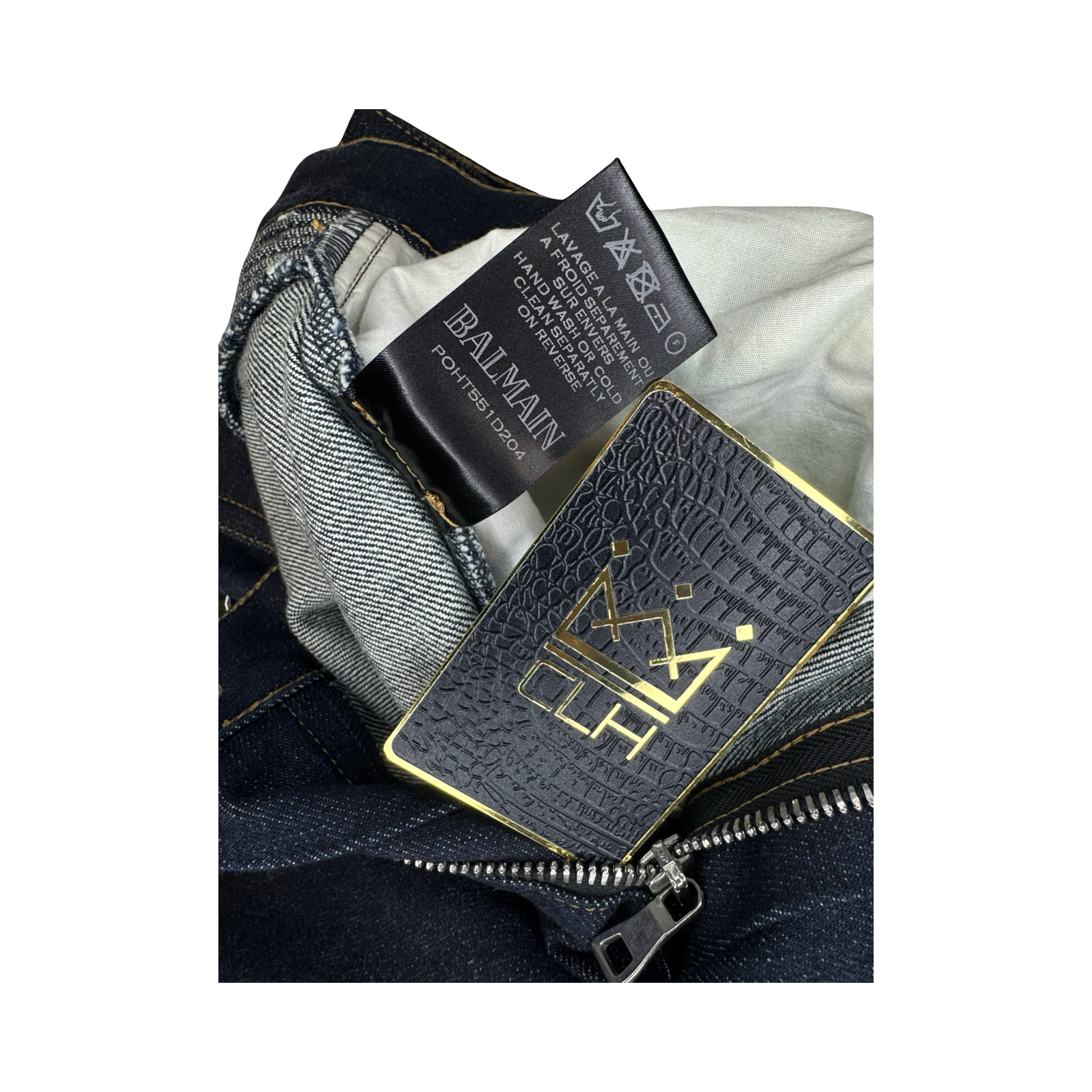 DETAILS: Balmain blue denim featuring the signature zippers with biker patches. Made in Italy.