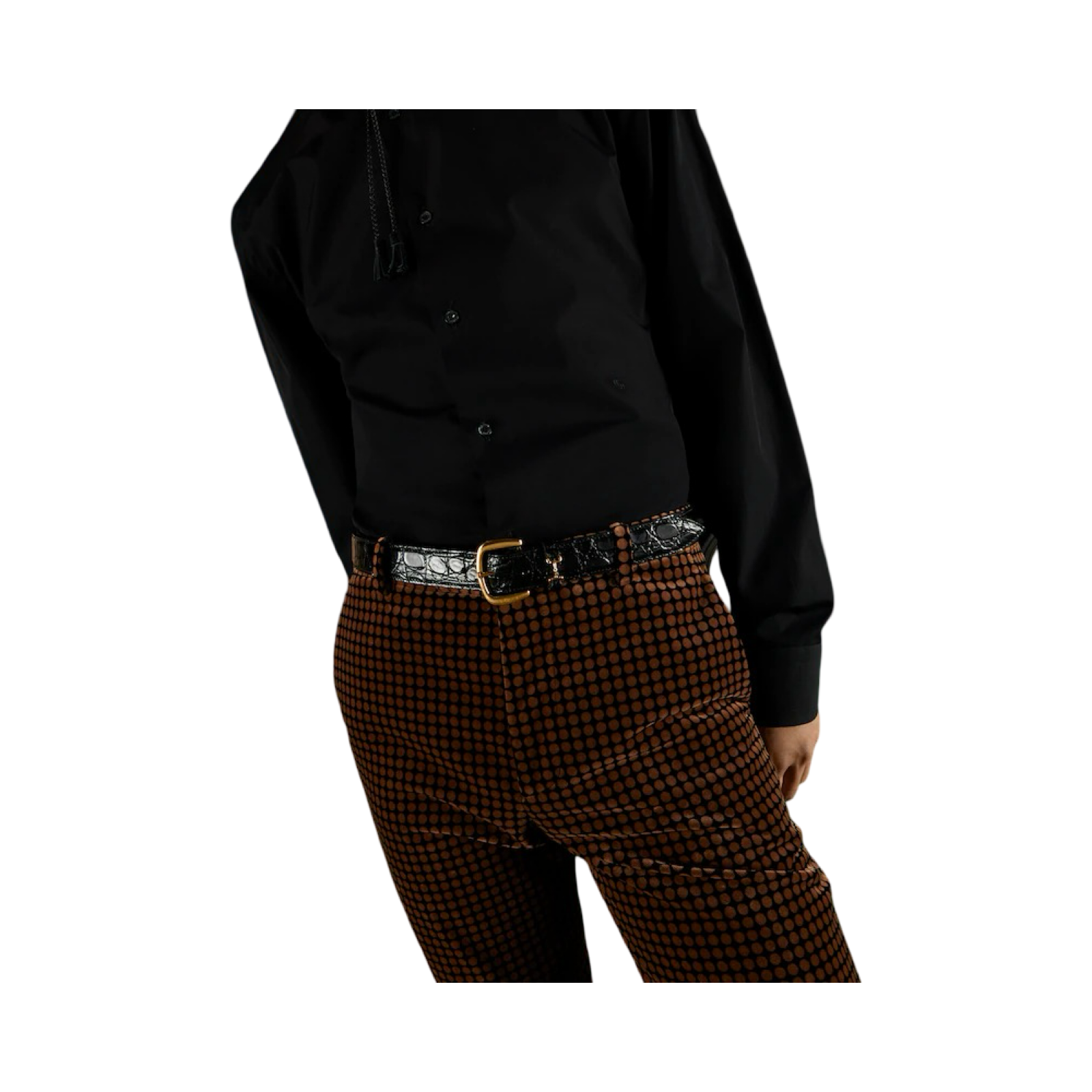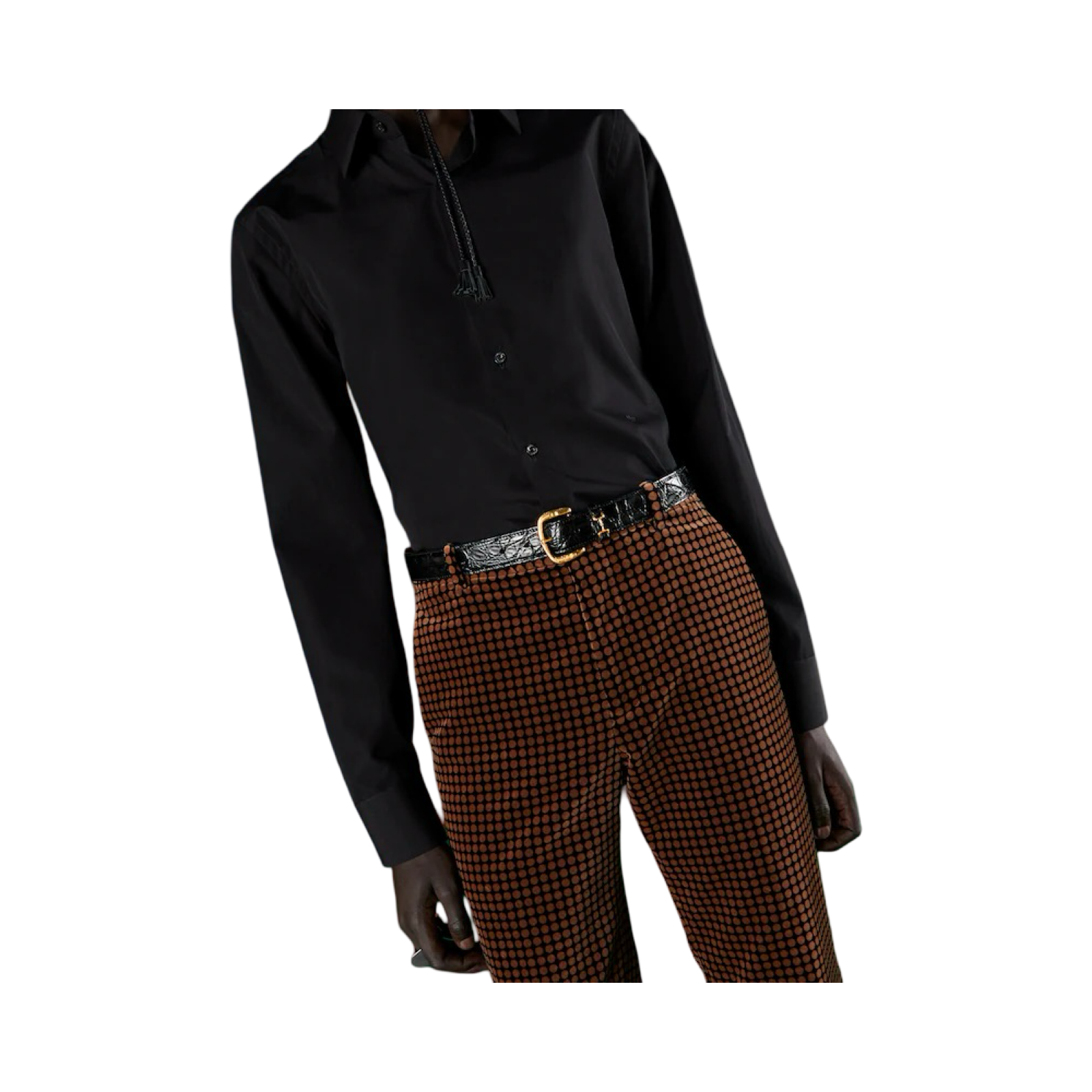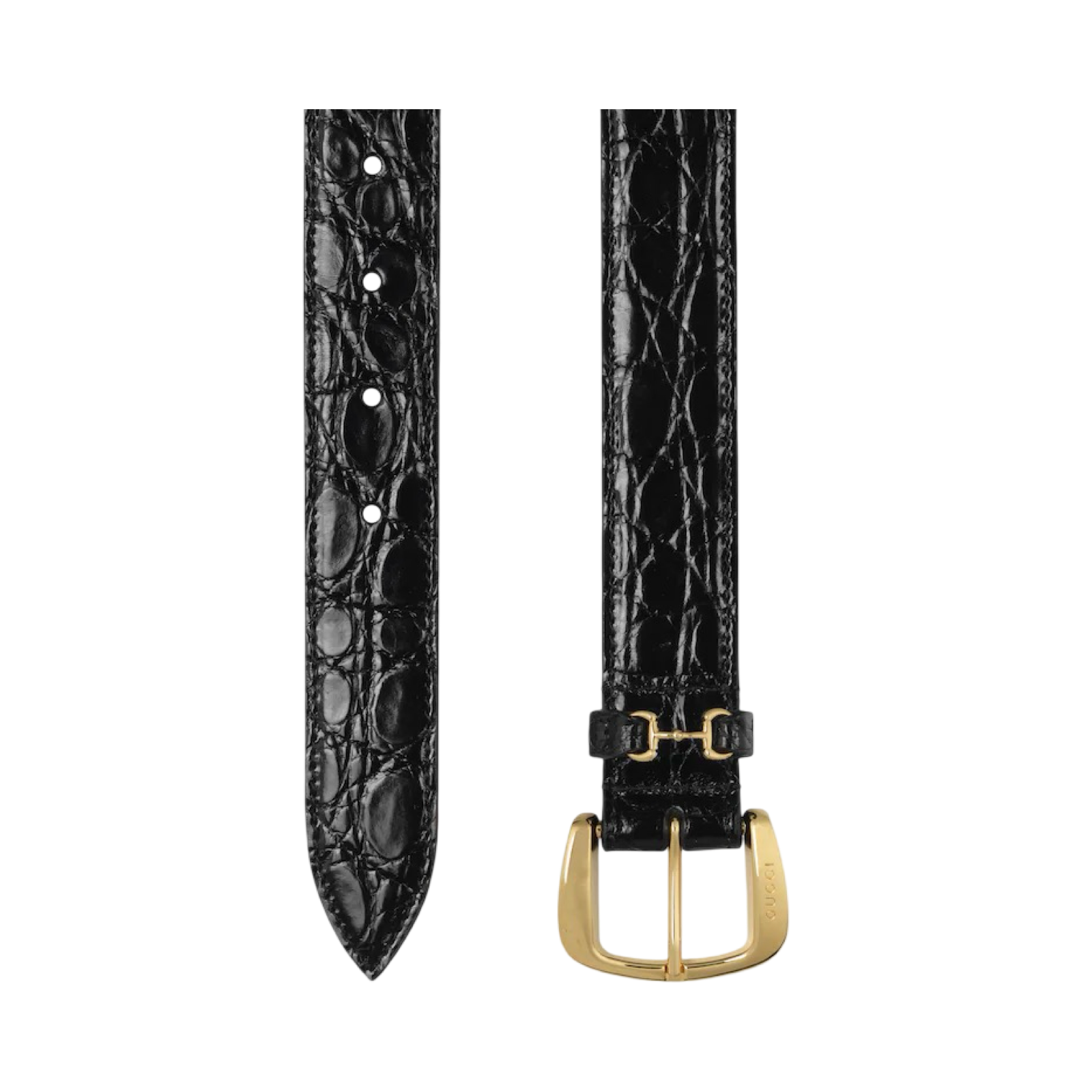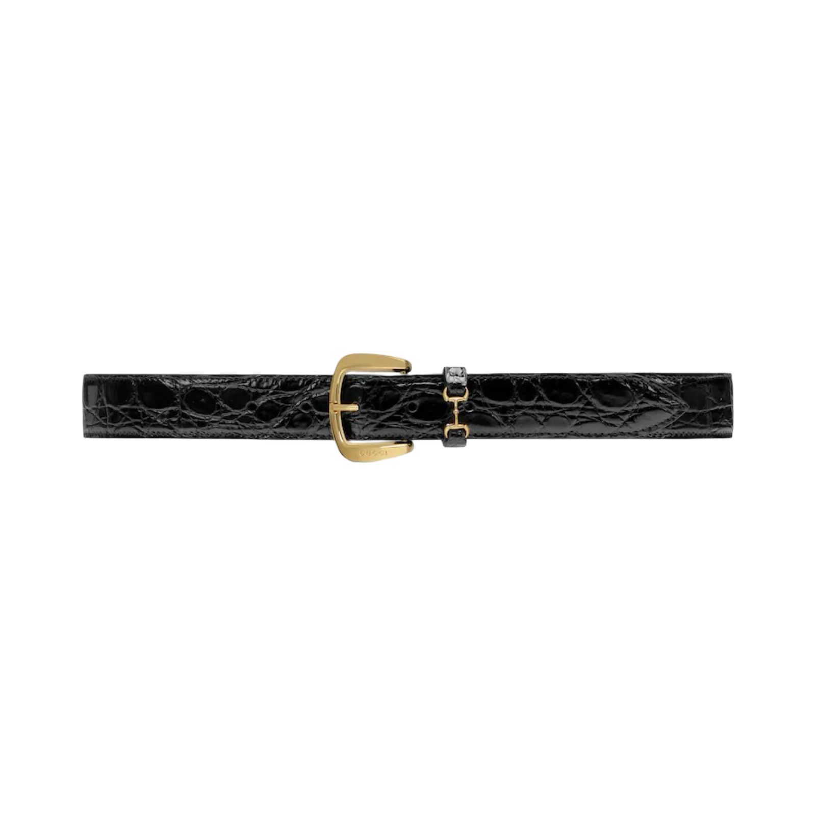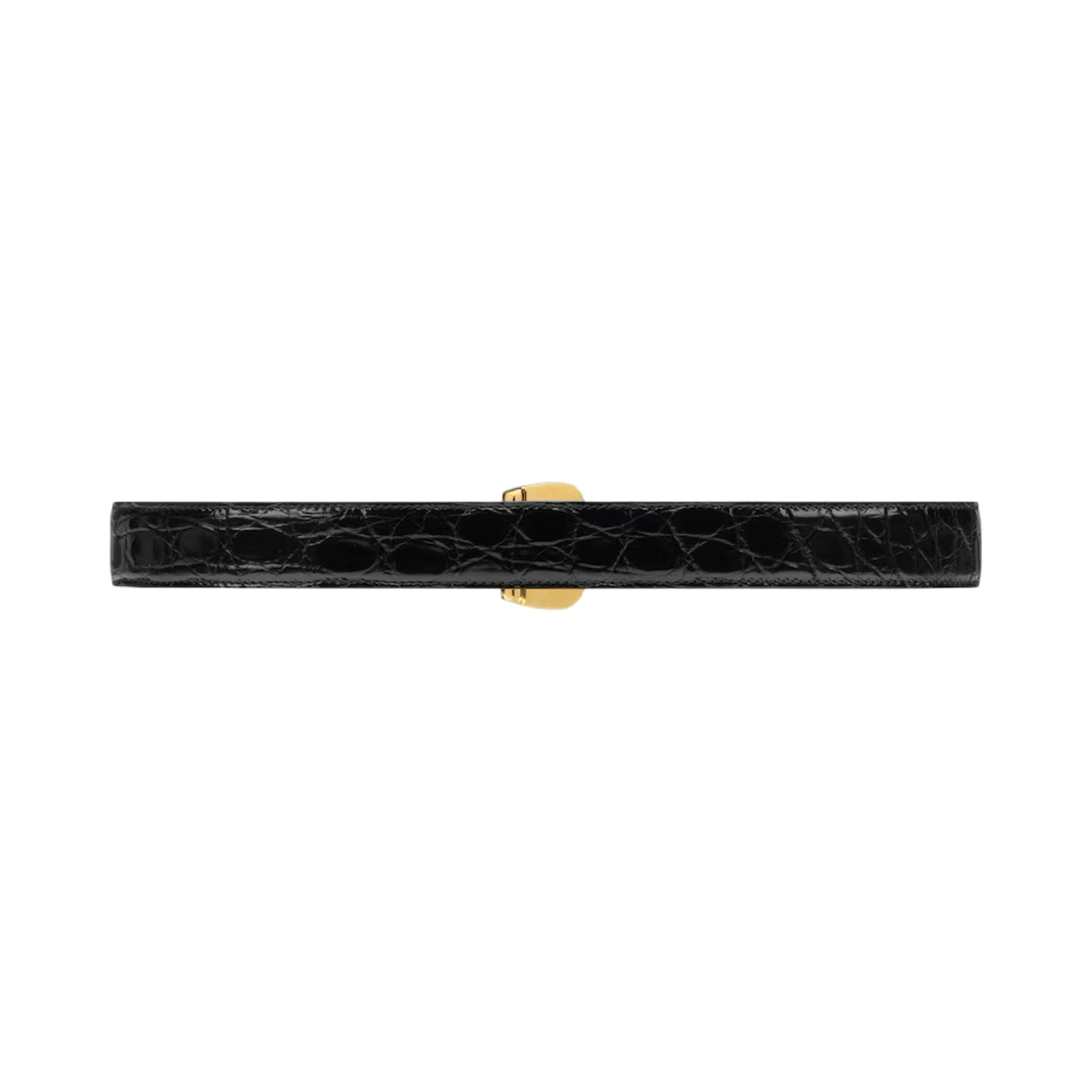 DETAILS: The Horsebit is part of Gucci’s genetic code and is one of the most distinctive elements among the House symbols borrowed from the equestrian world. The hardware appears in mini as part of this black crocodile leather belt, complete with a formal square buckle.
