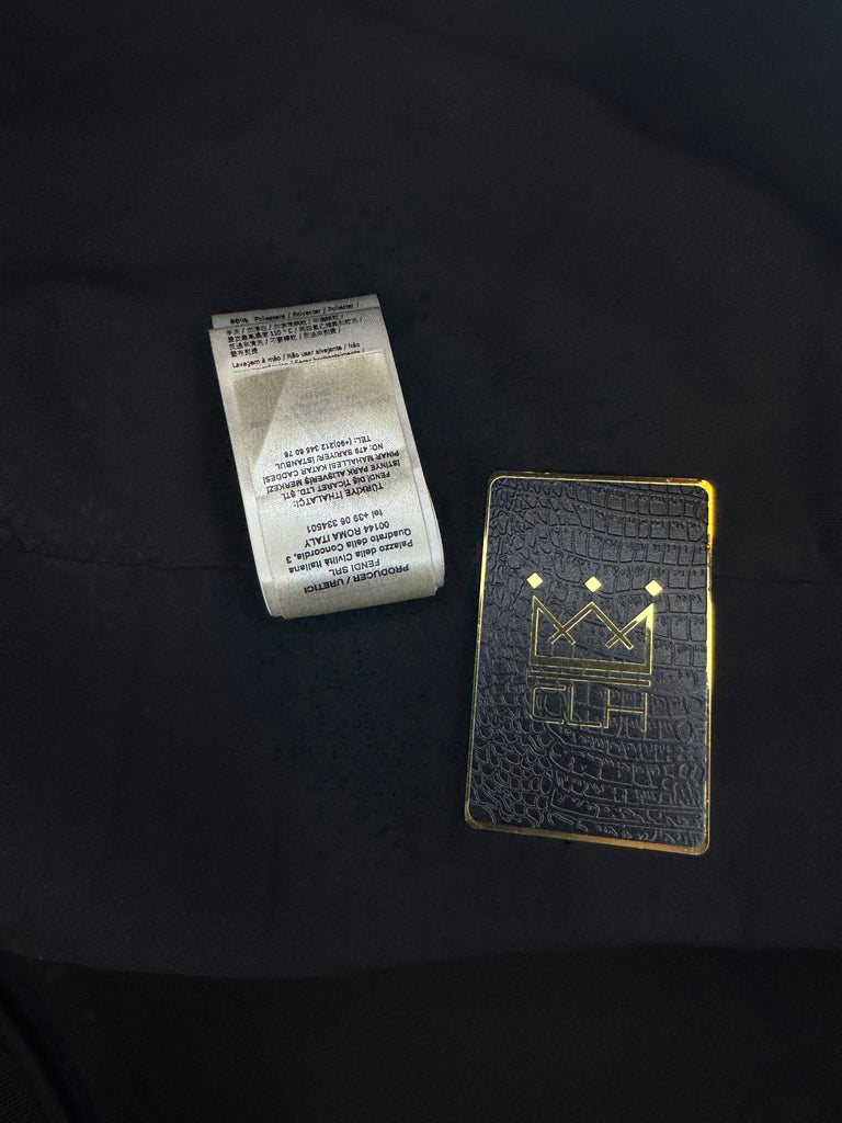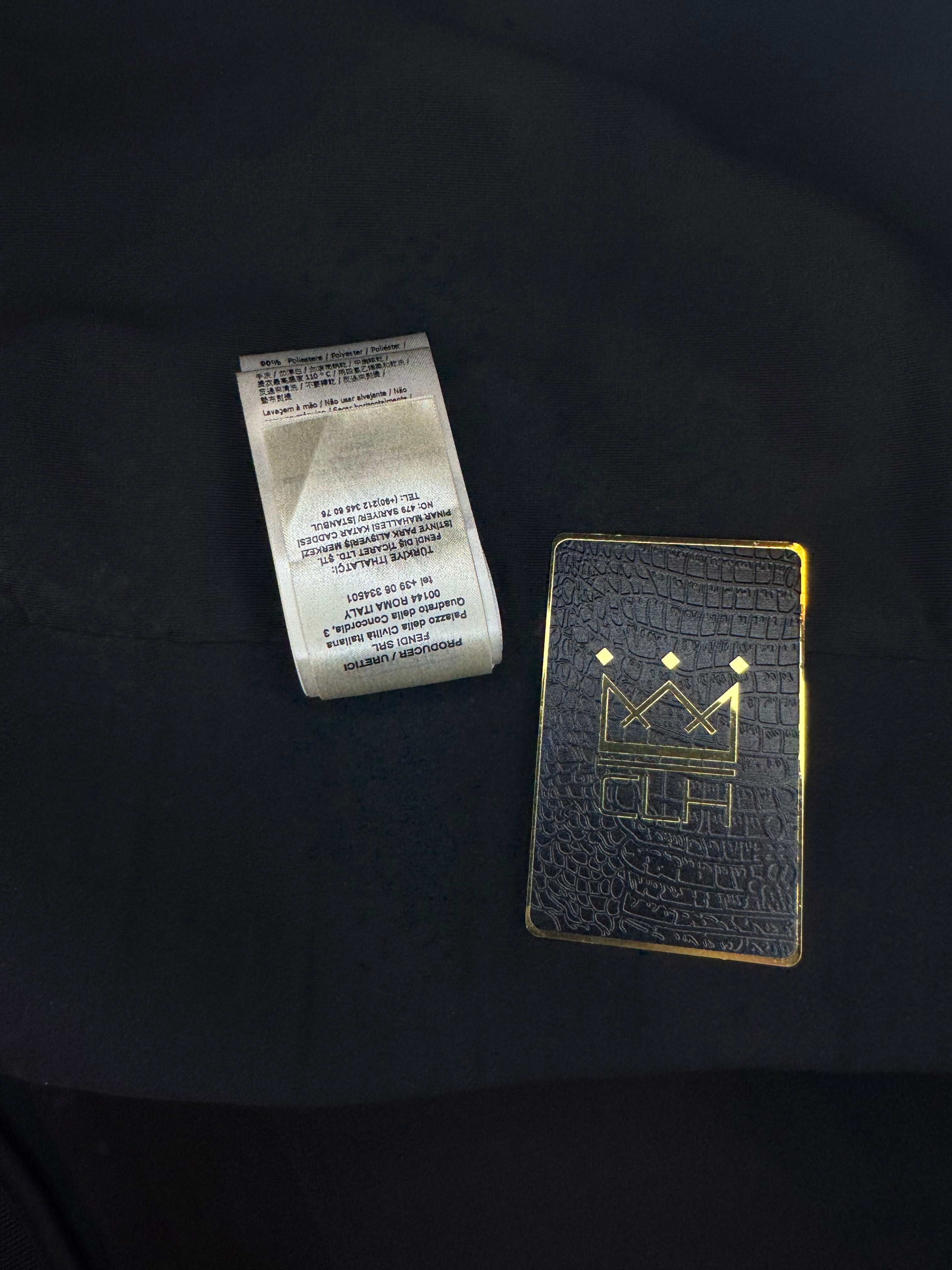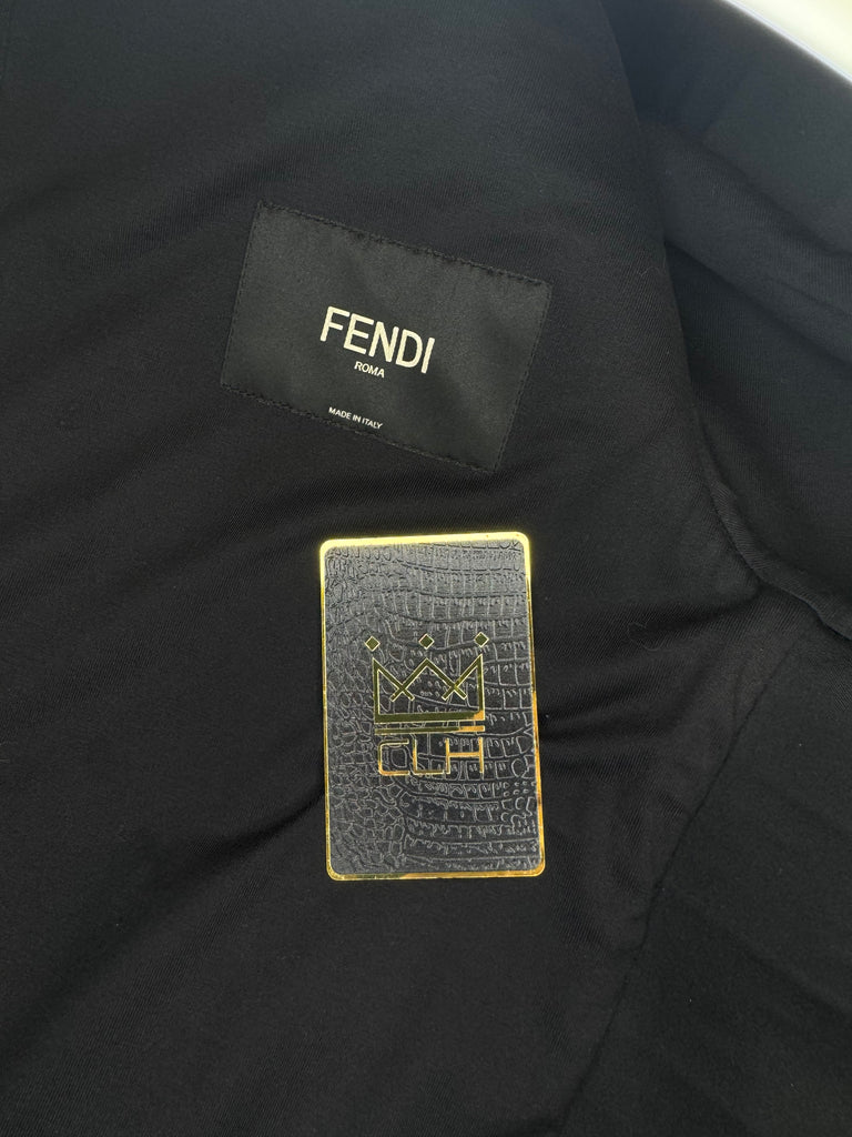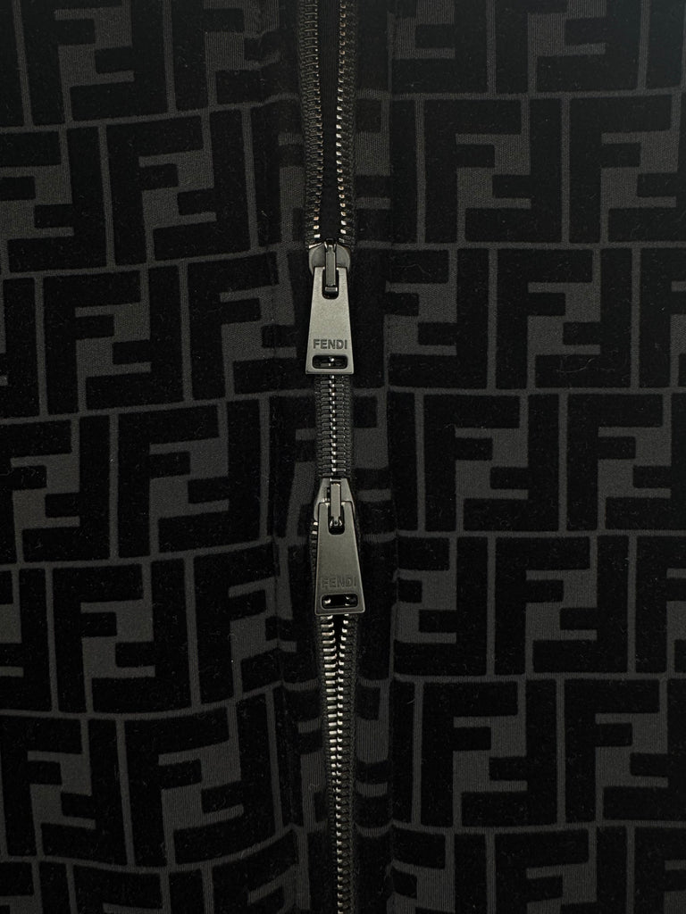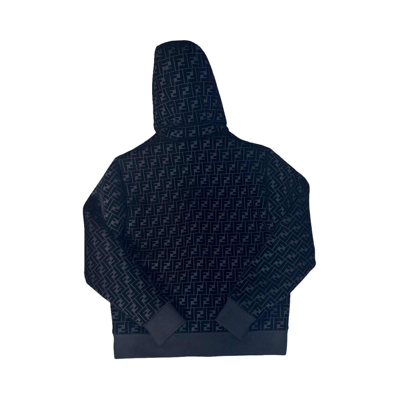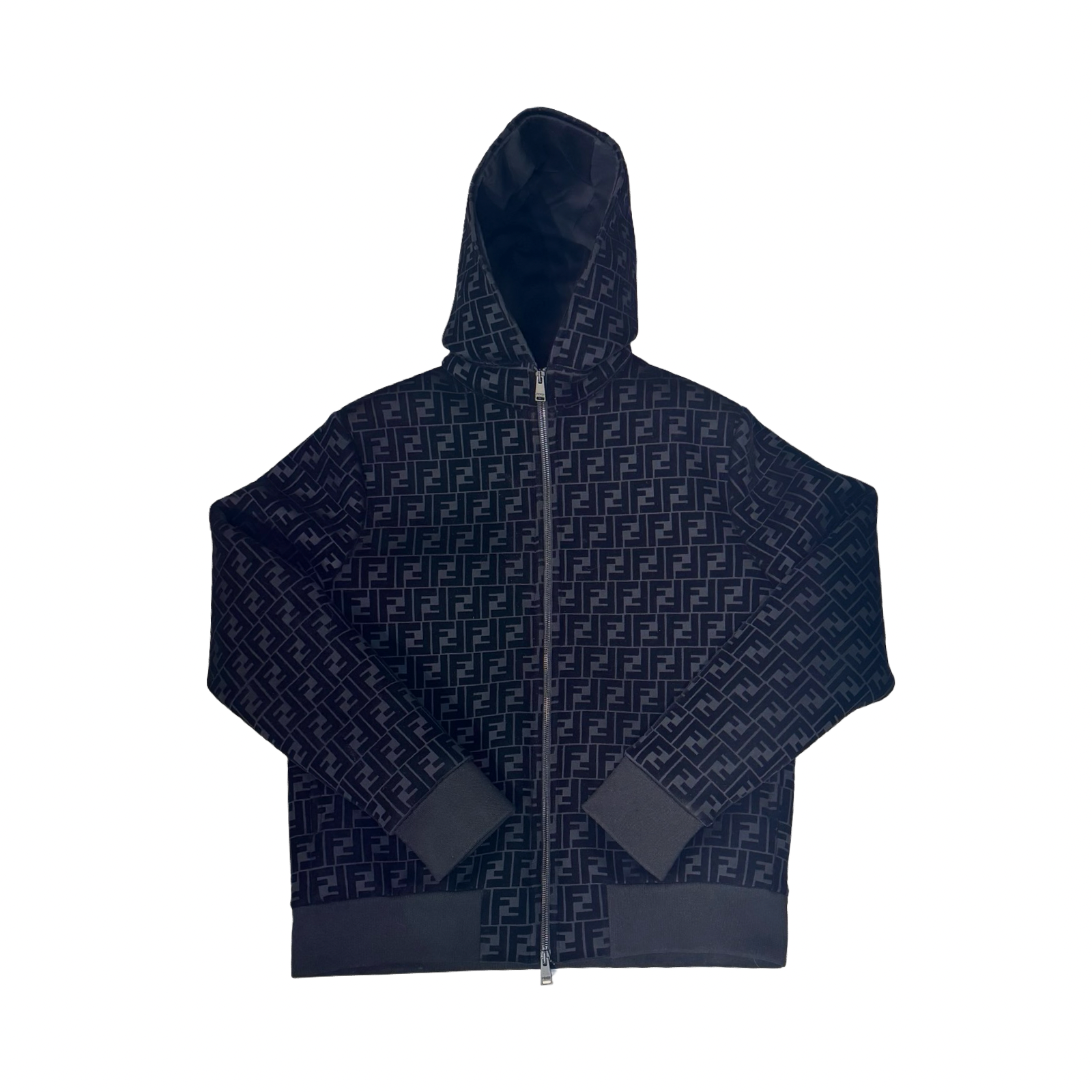 DETAILS: Hooded sweatshirt with double slider zip fastening. Stretch knit cuffs and hem. Made of black piqué jersey with tone on tone, all-over FF flocked print motif.