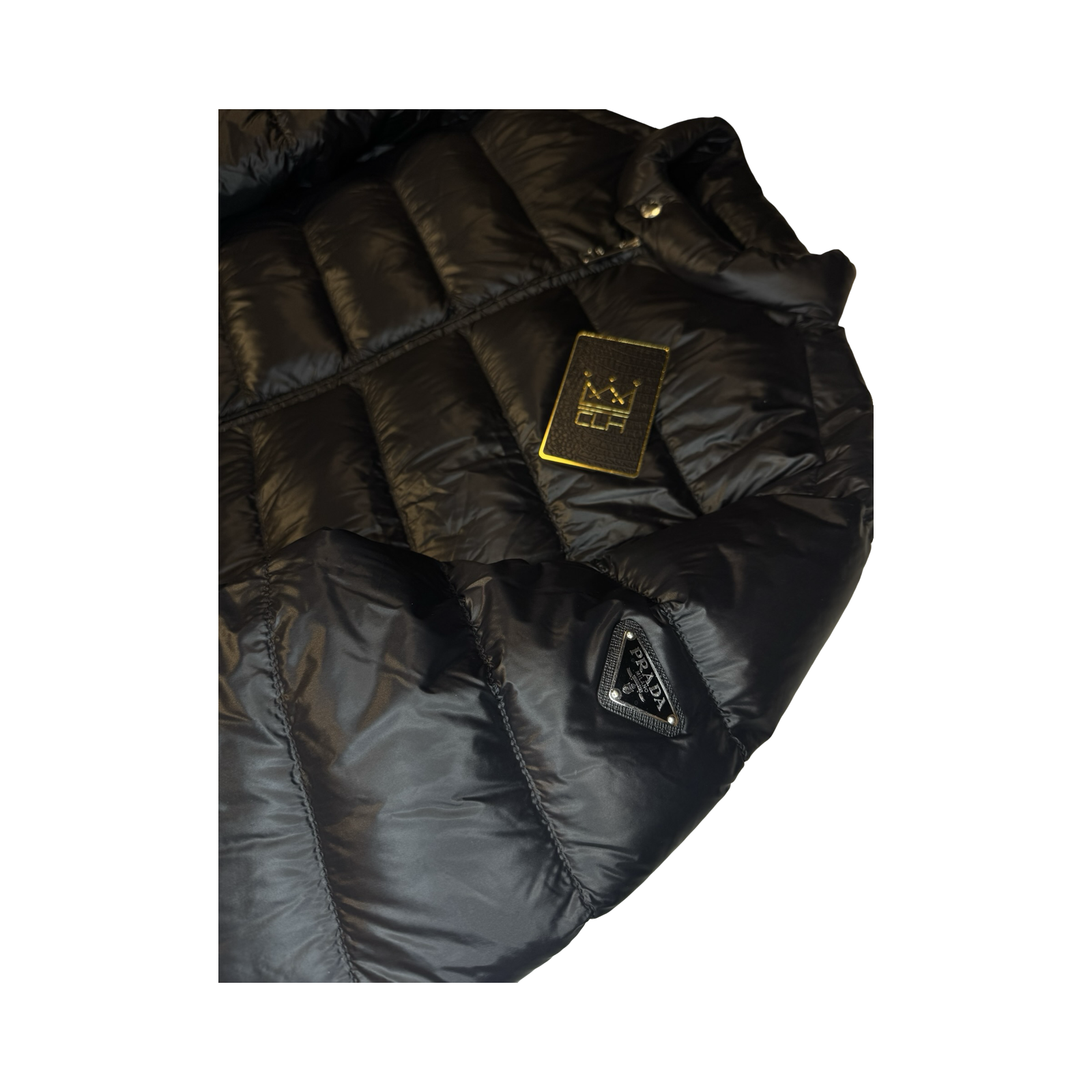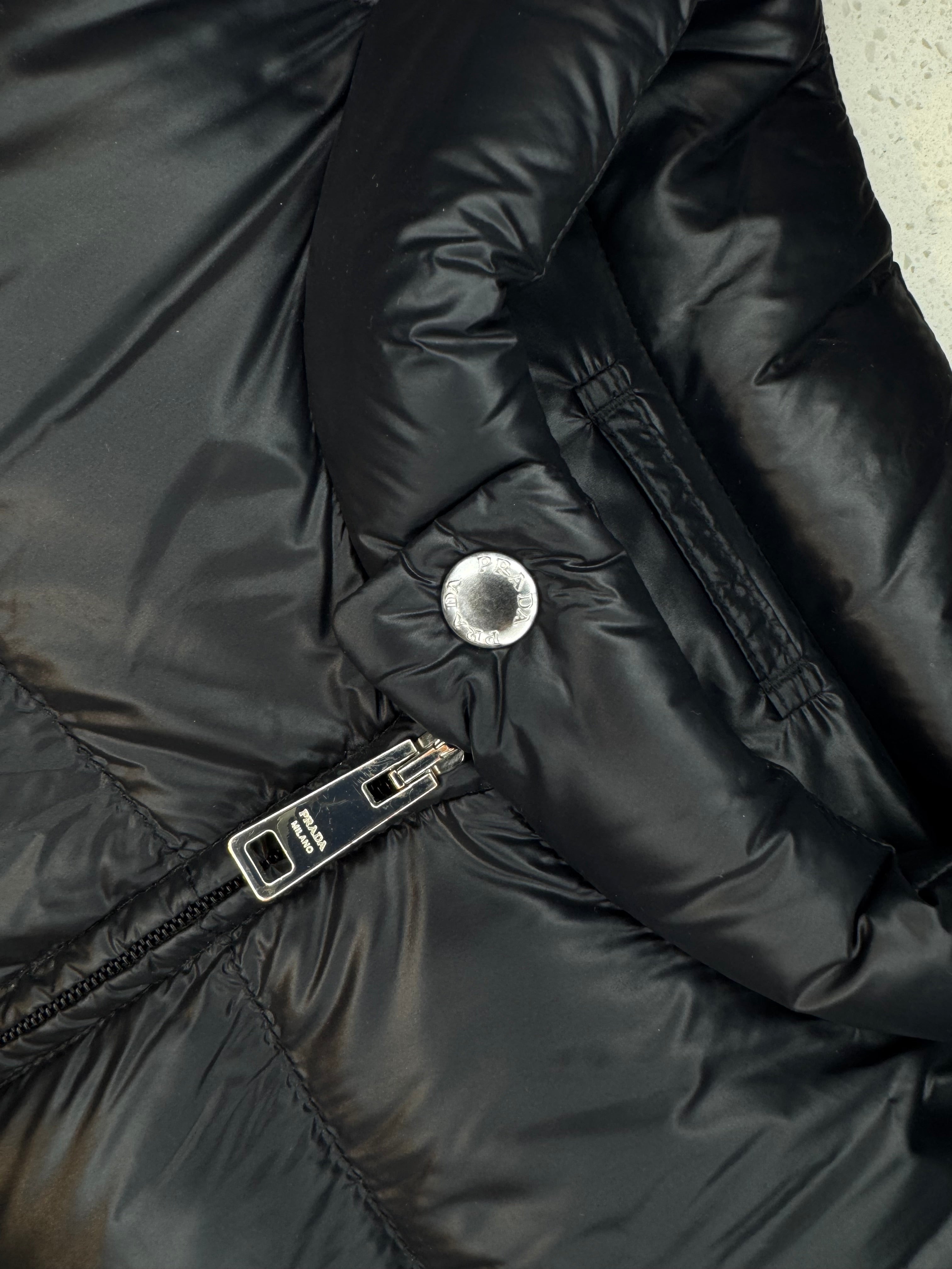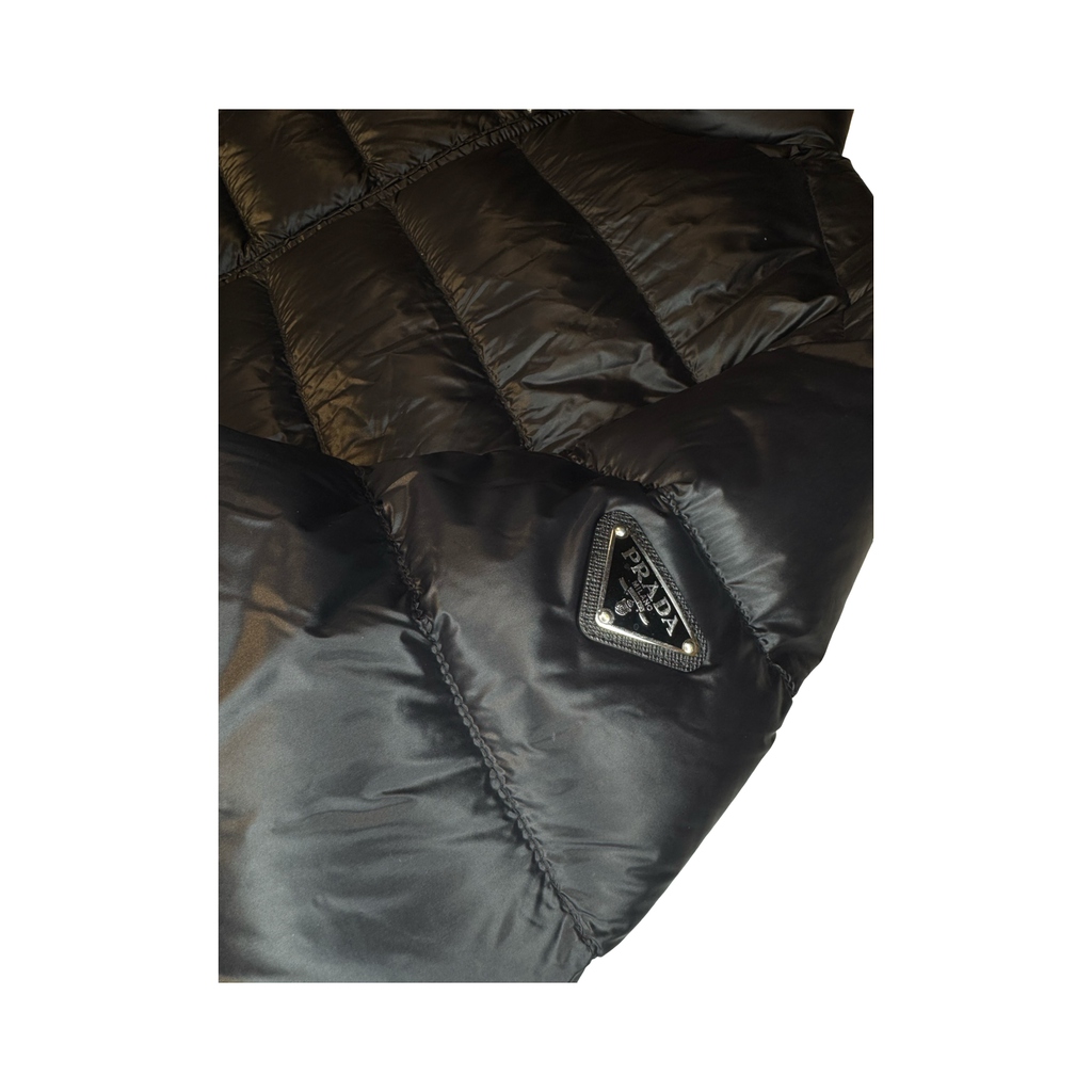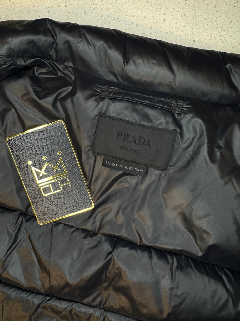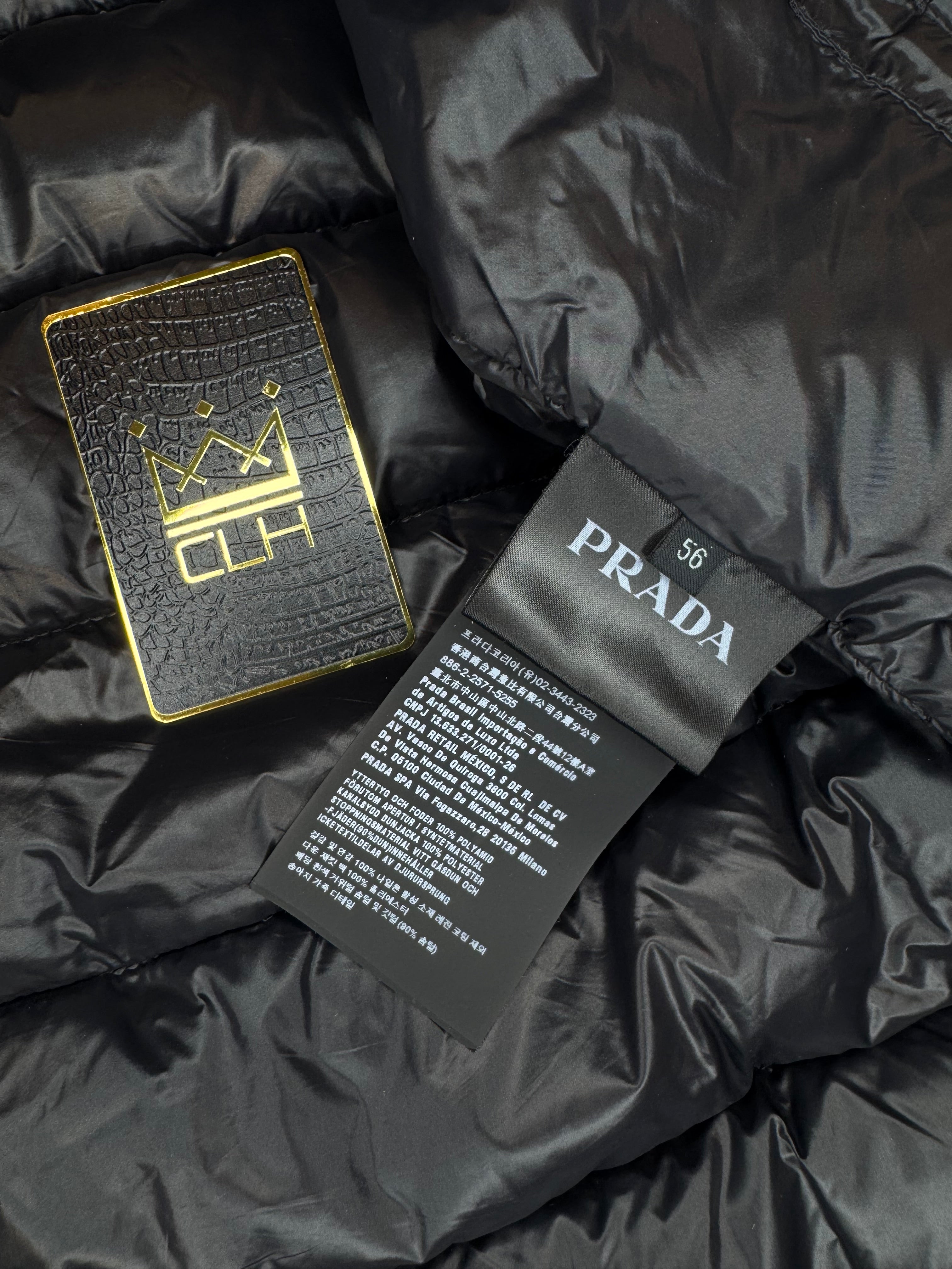 DETAILS: This down-filled jacket features the signature PRADA triangle emblem in nylon exterior. Detailed with side zip pockets and button closure at the top.