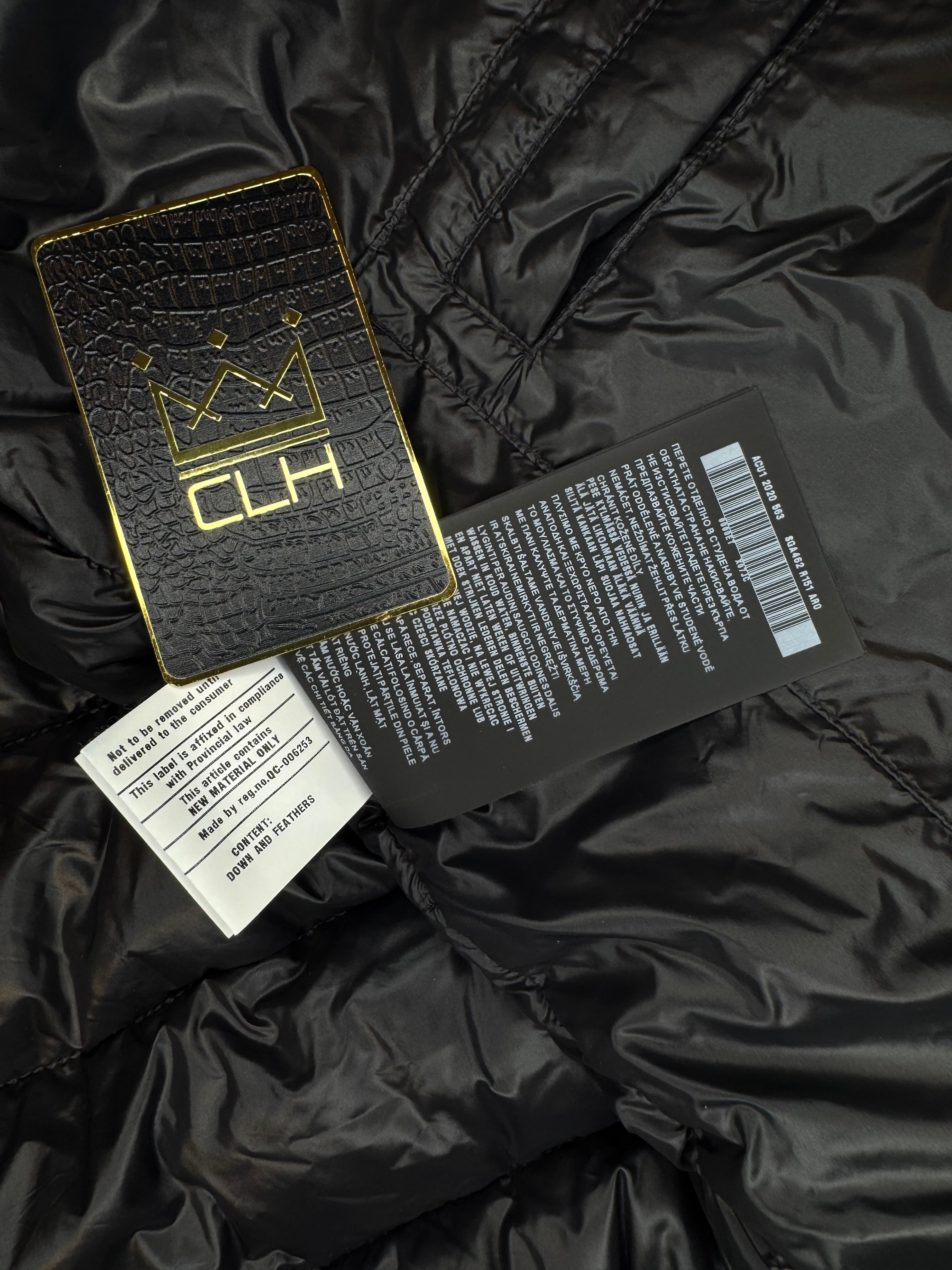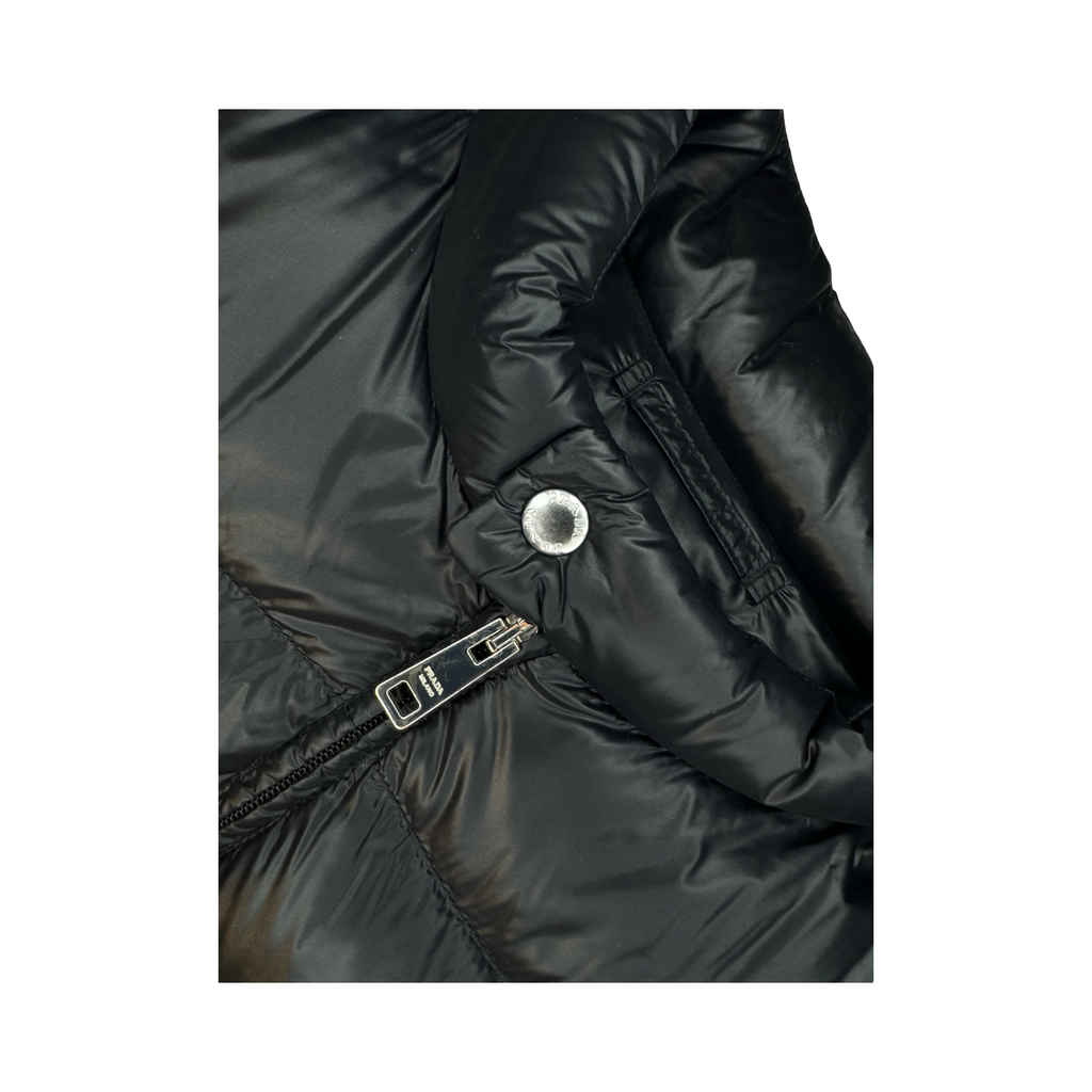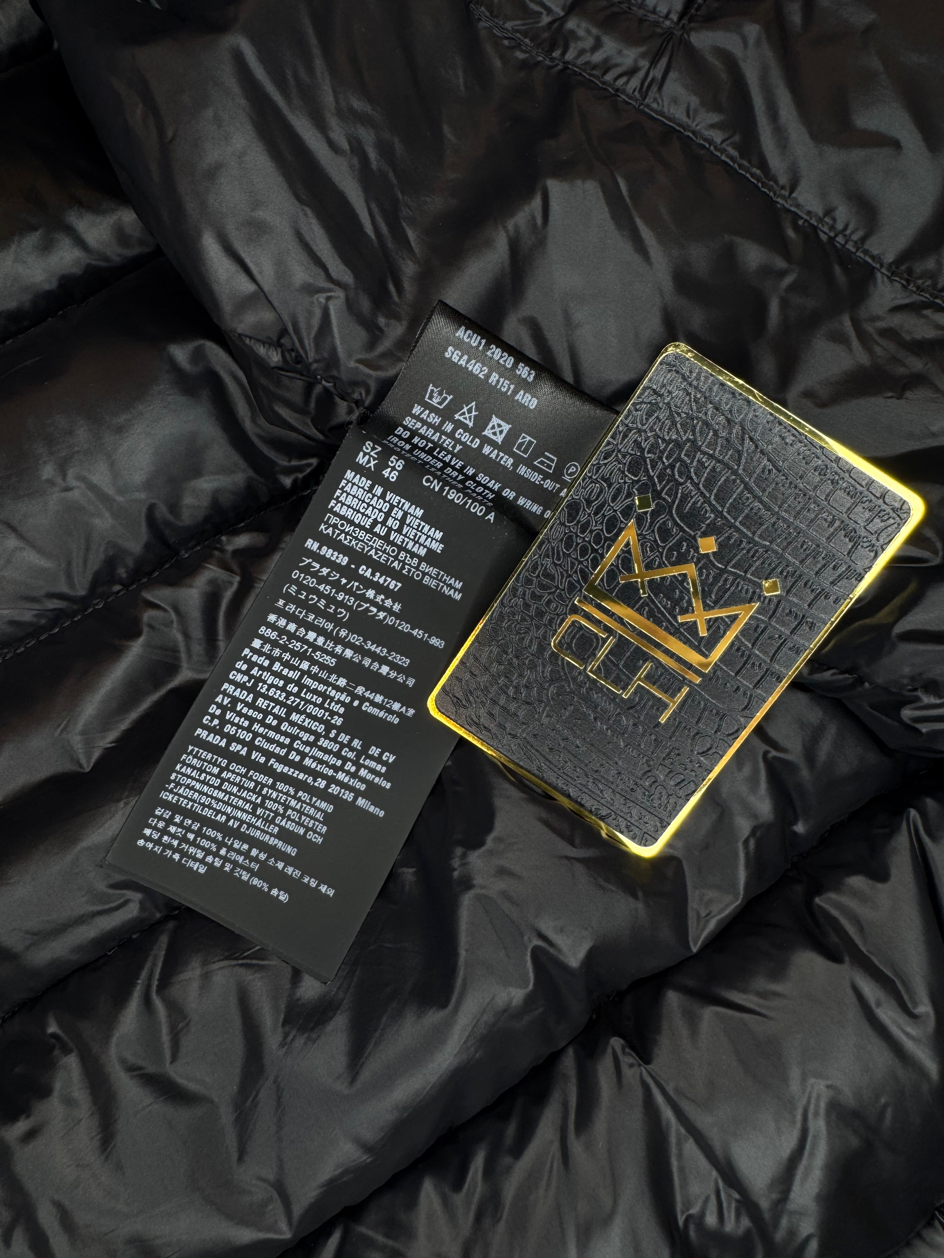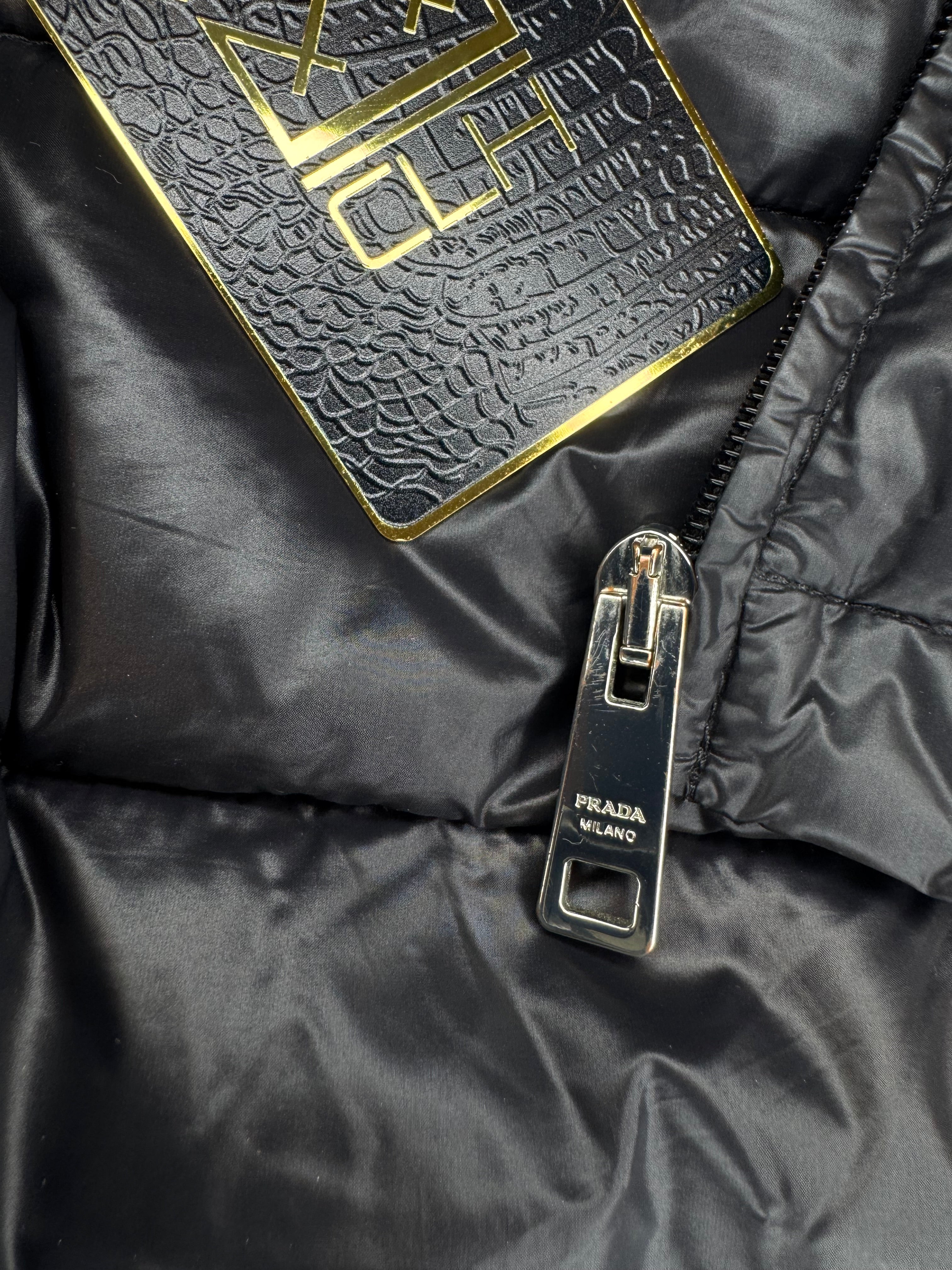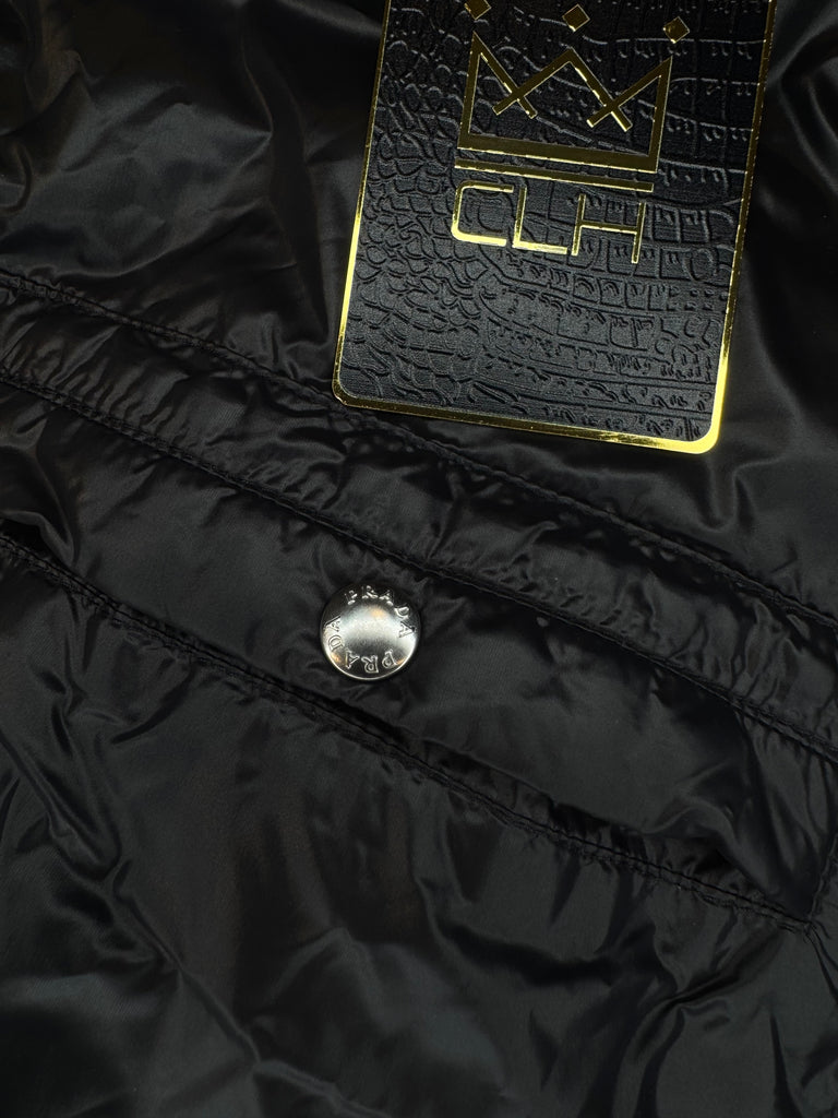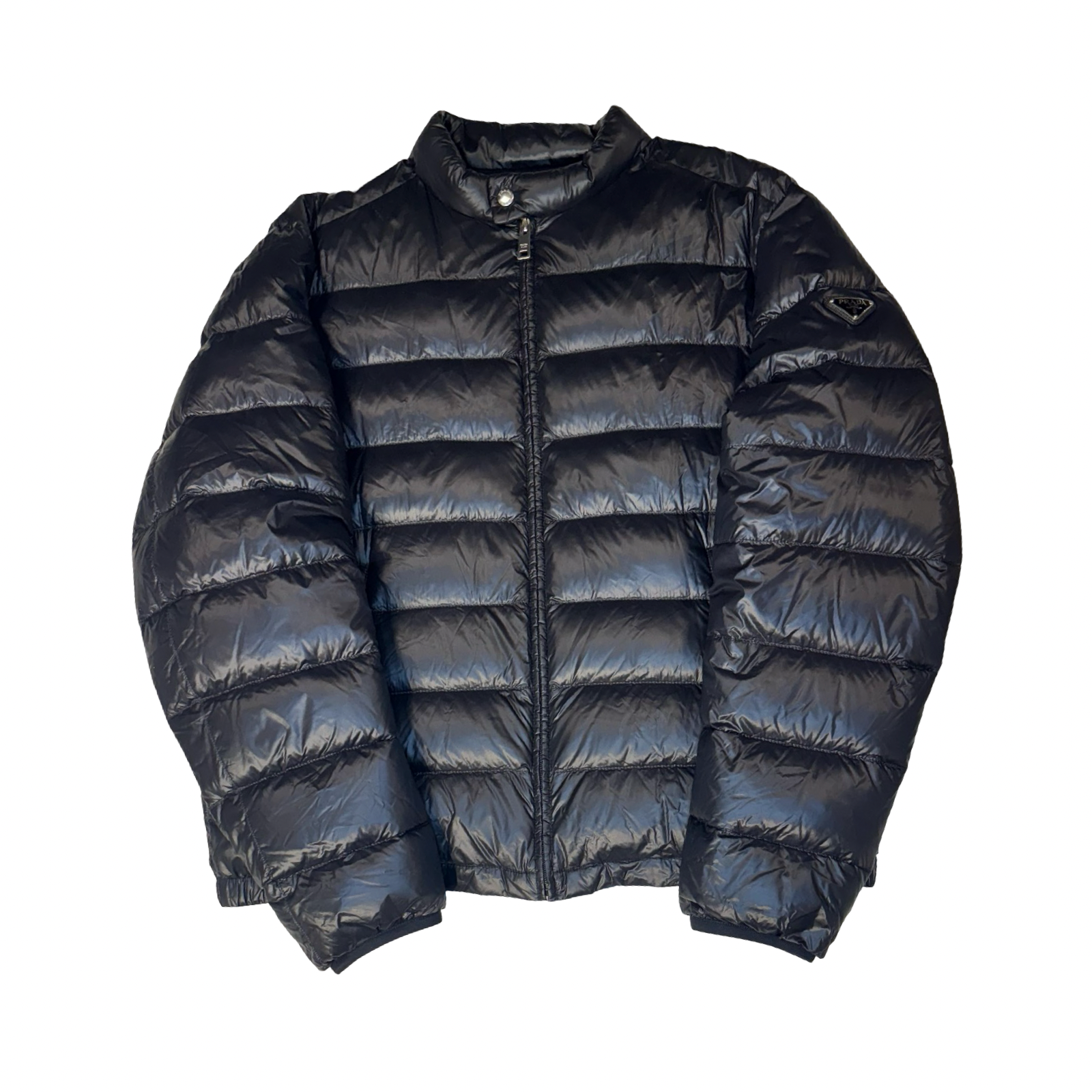 DETAILS: This down-filled jacket features the signature PRADA triangle emblem in nylon exterior. Detailed with side zip pockets and button closure at the top.