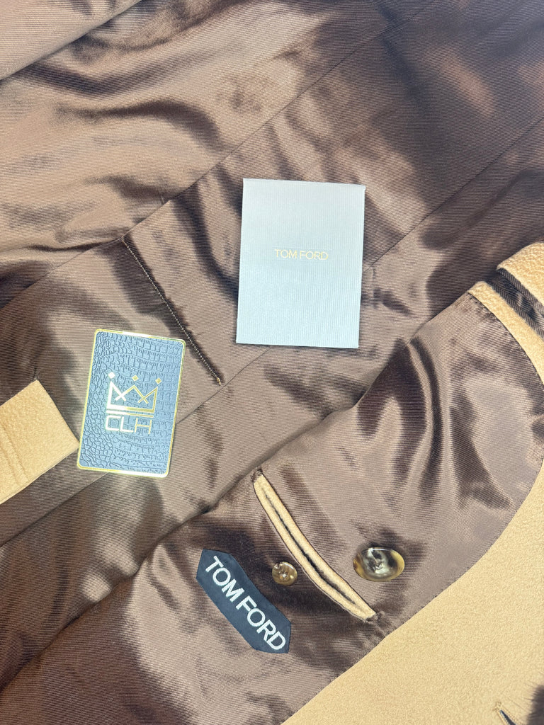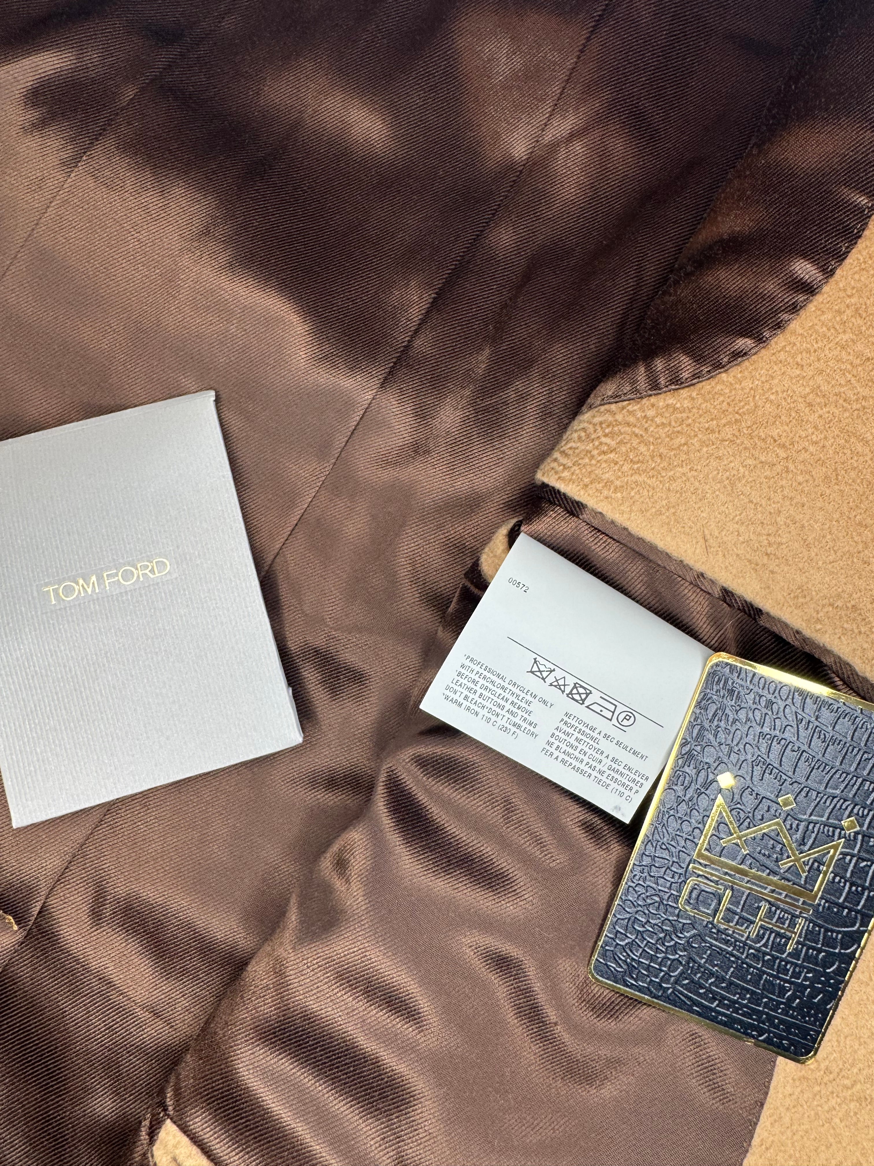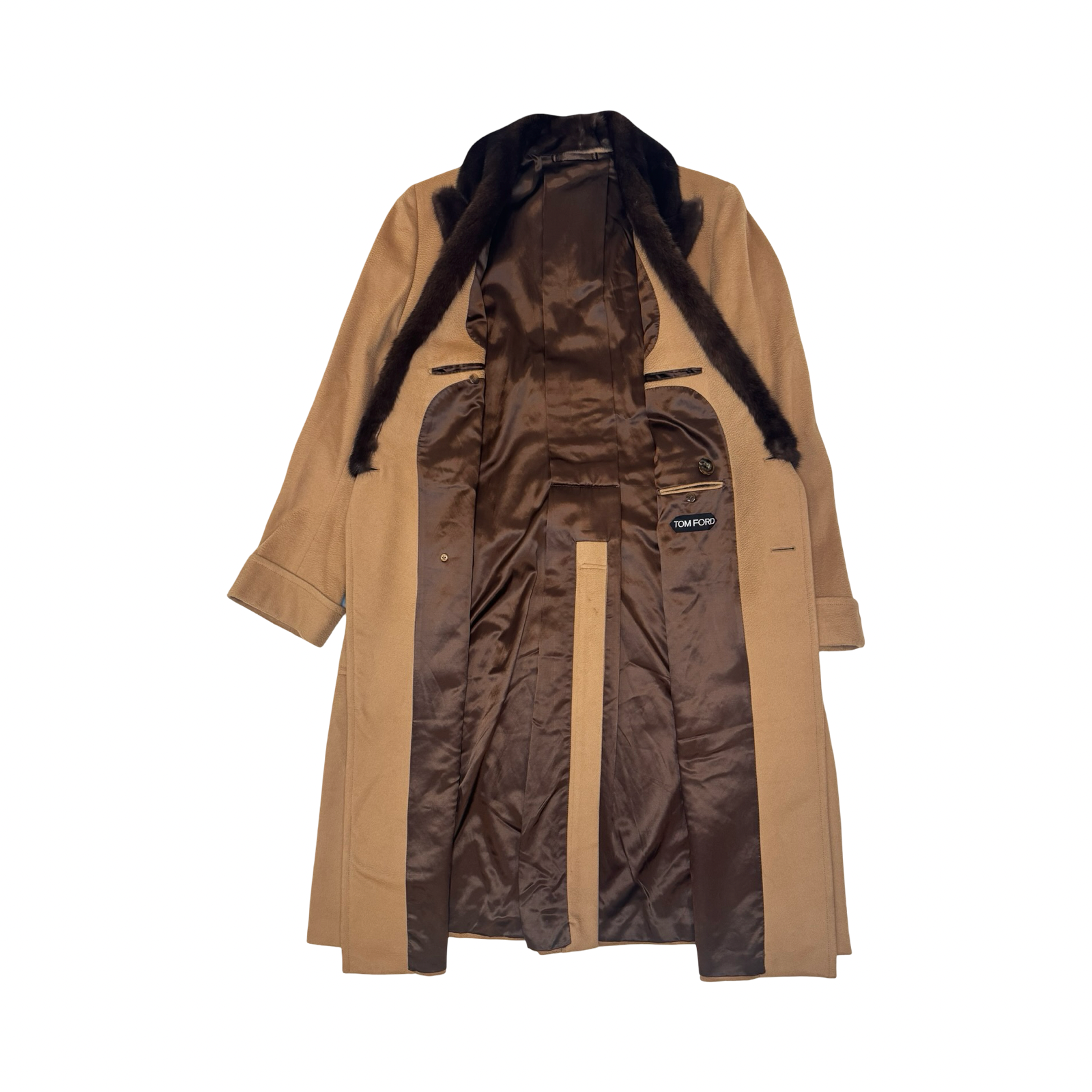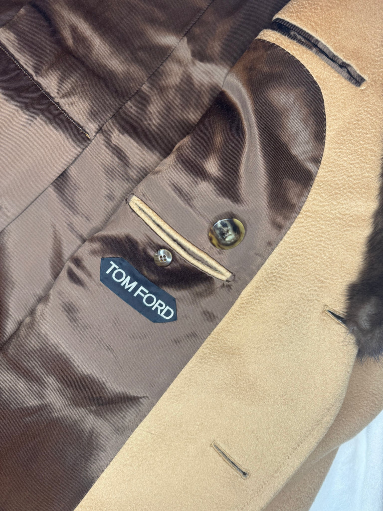 DETAILS: A true statement of sophistication, this Tom Ford jacket is expertly tailored from tanned cashmere and features a double-breasted silhouette that exudes timeless elegance. The design is elevated by a sumptuous mink fur collar, adding a touch of opulence and warmth. Finished with a silky satin lining for effortless comfort and refined structure, this piece embodies Tom Ford’s signature balance of luxury, power, and impeccable craftsmanship. Made in Italy.