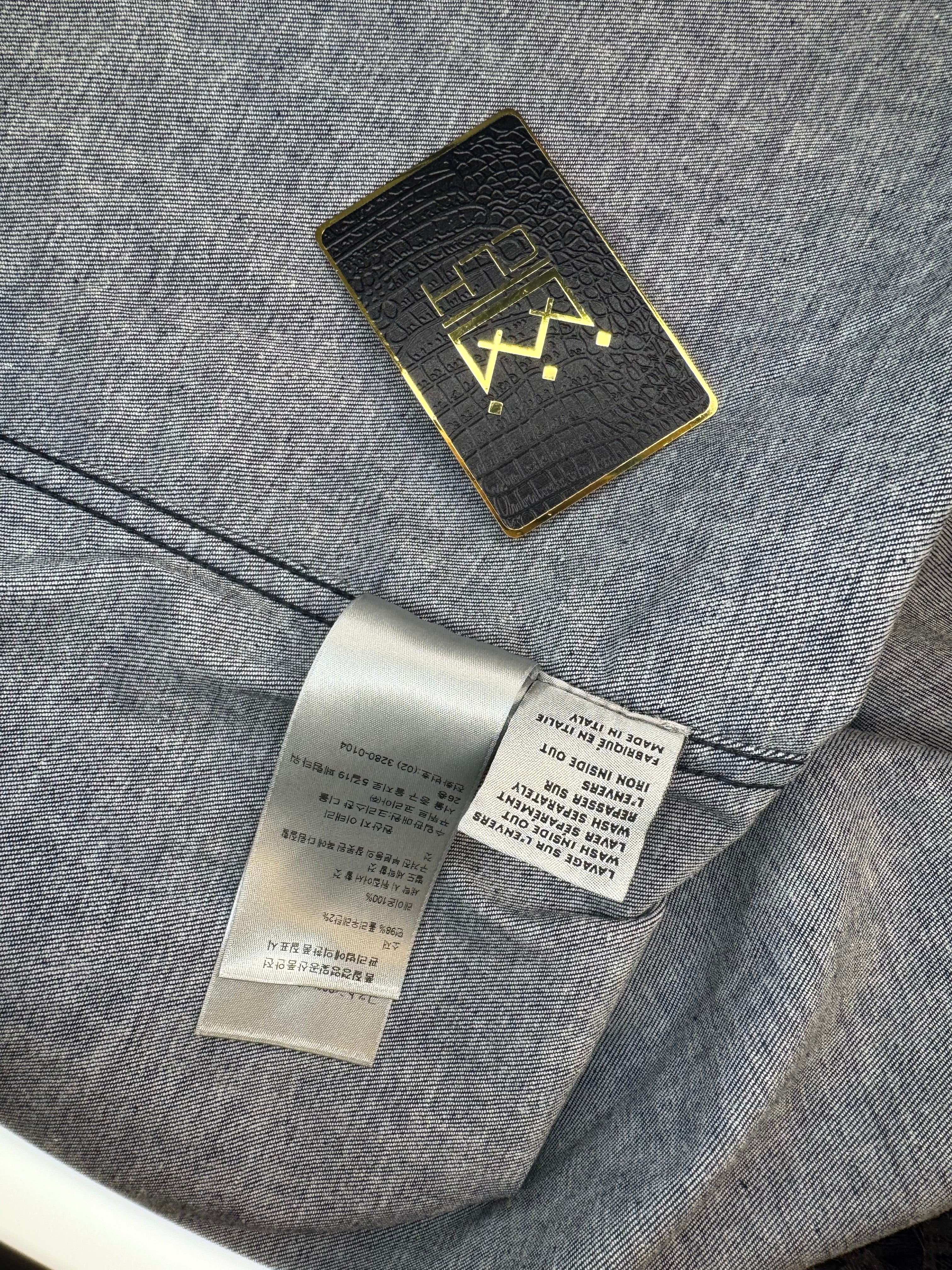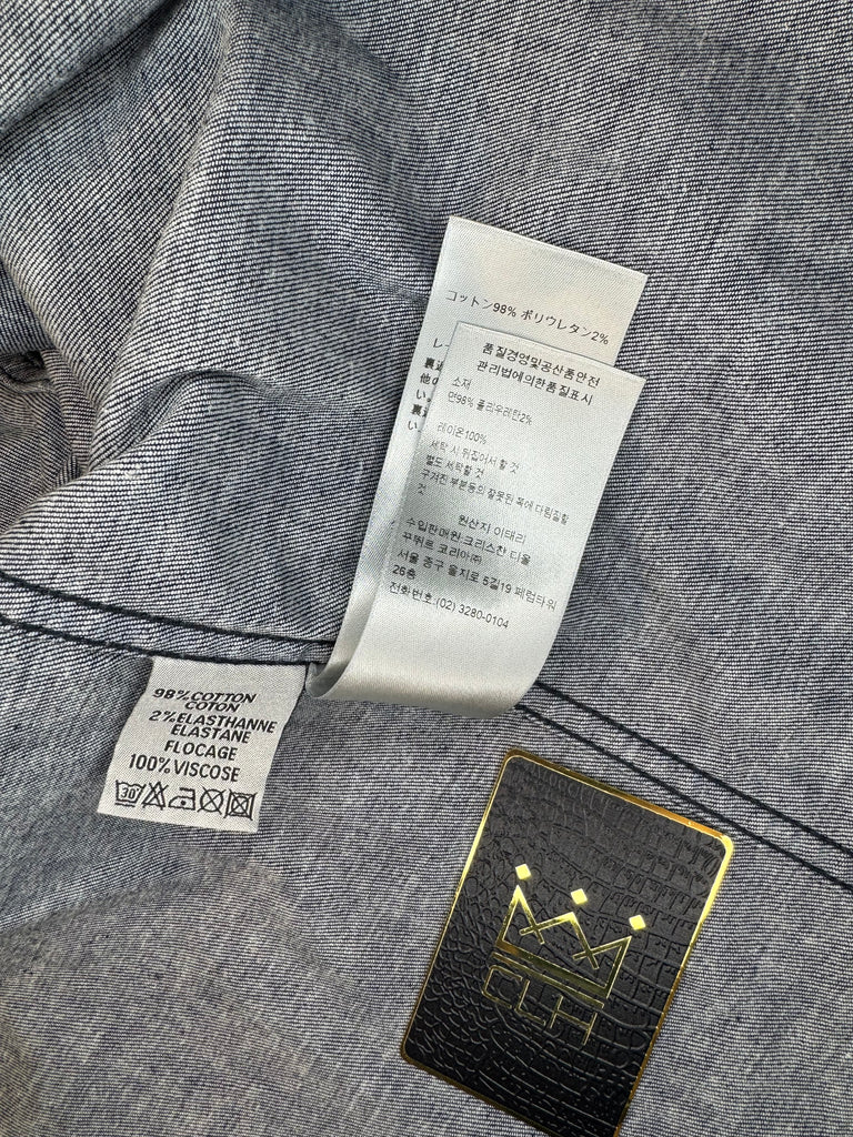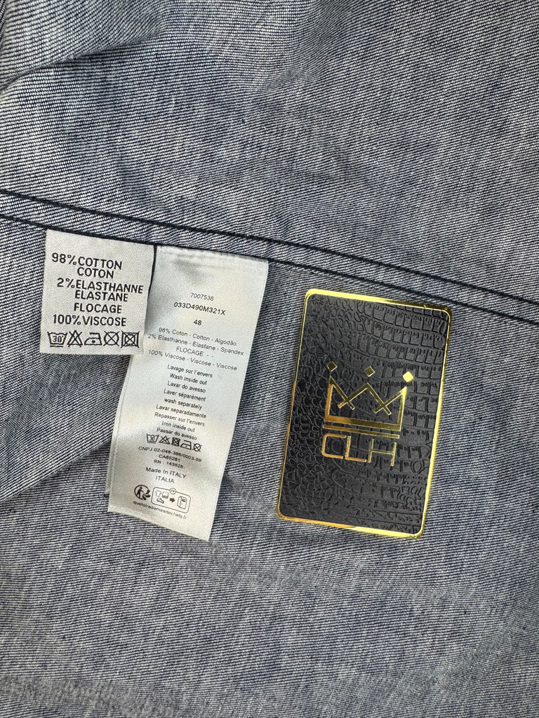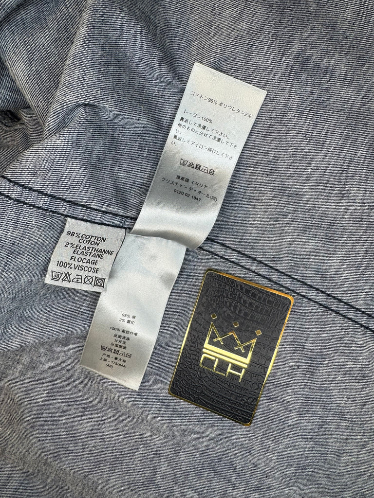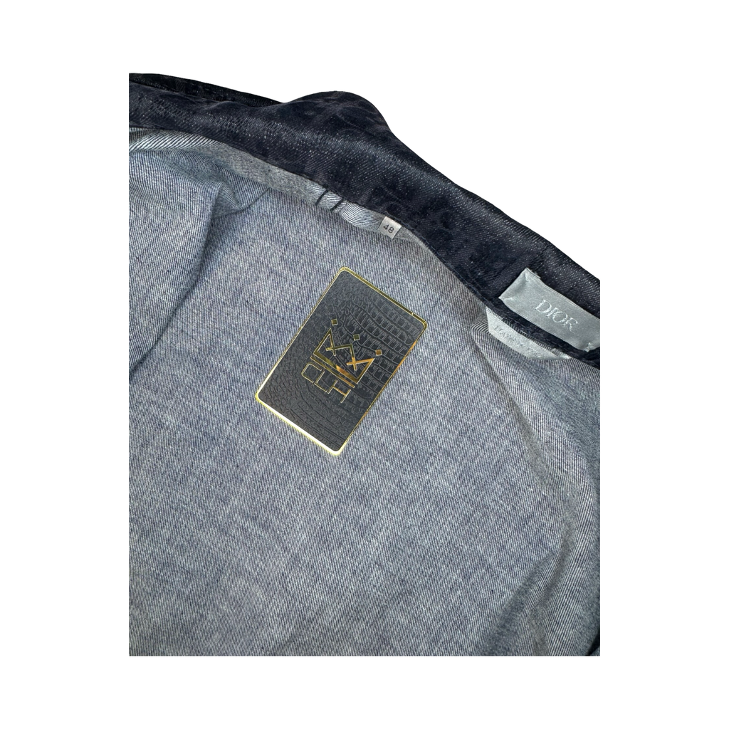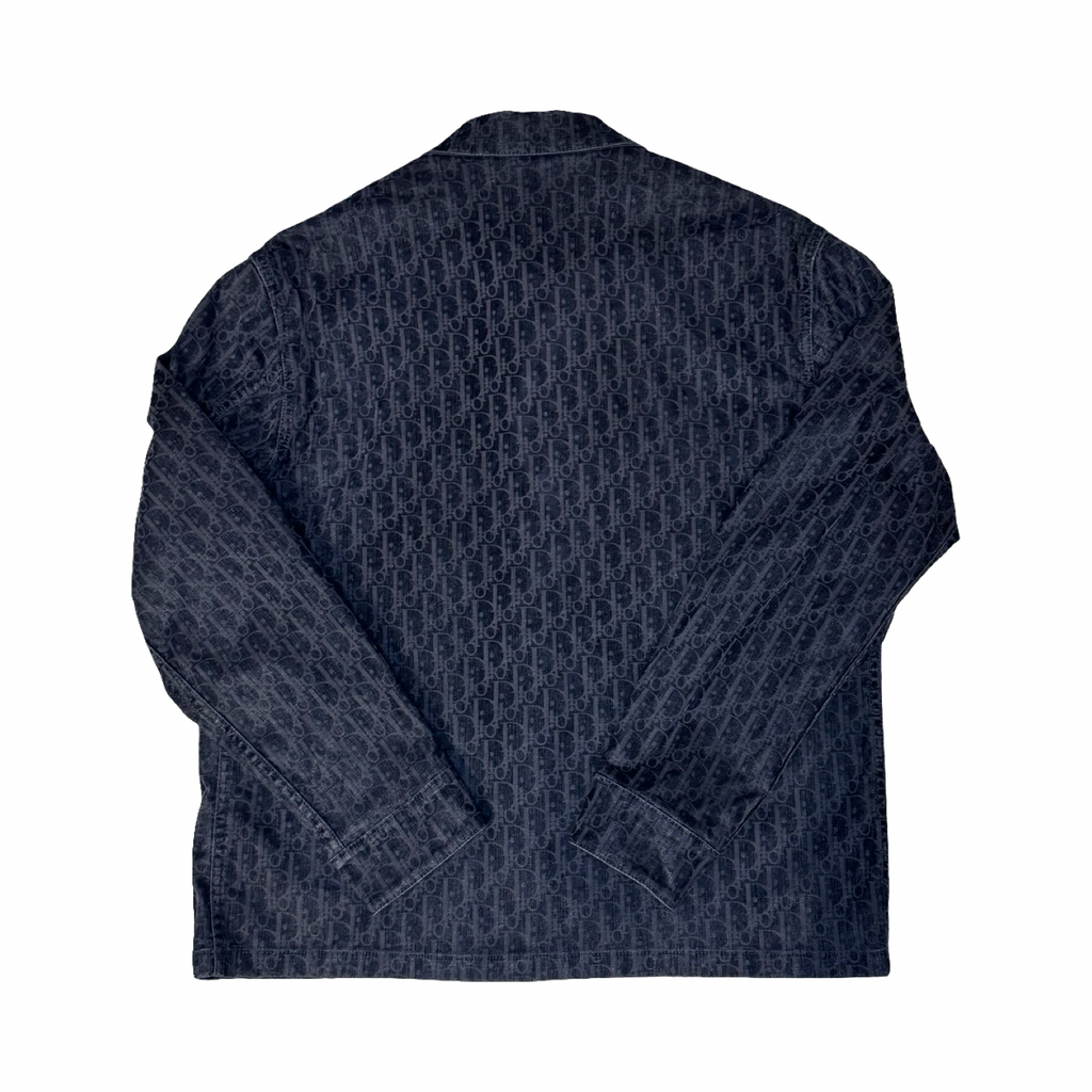 DETAILS: The overshirt highlights the hallmark Dior Oblique motif in a laser-printed flocked allover variation. Crafted in blue cotton-blend twill, it features a timeless and comfortable cut. Possessing a practical interior pocket, the overshirt can be paired with matching jeans or any seasonal pants.