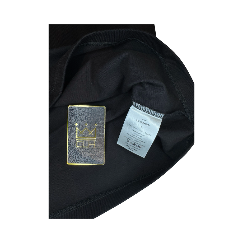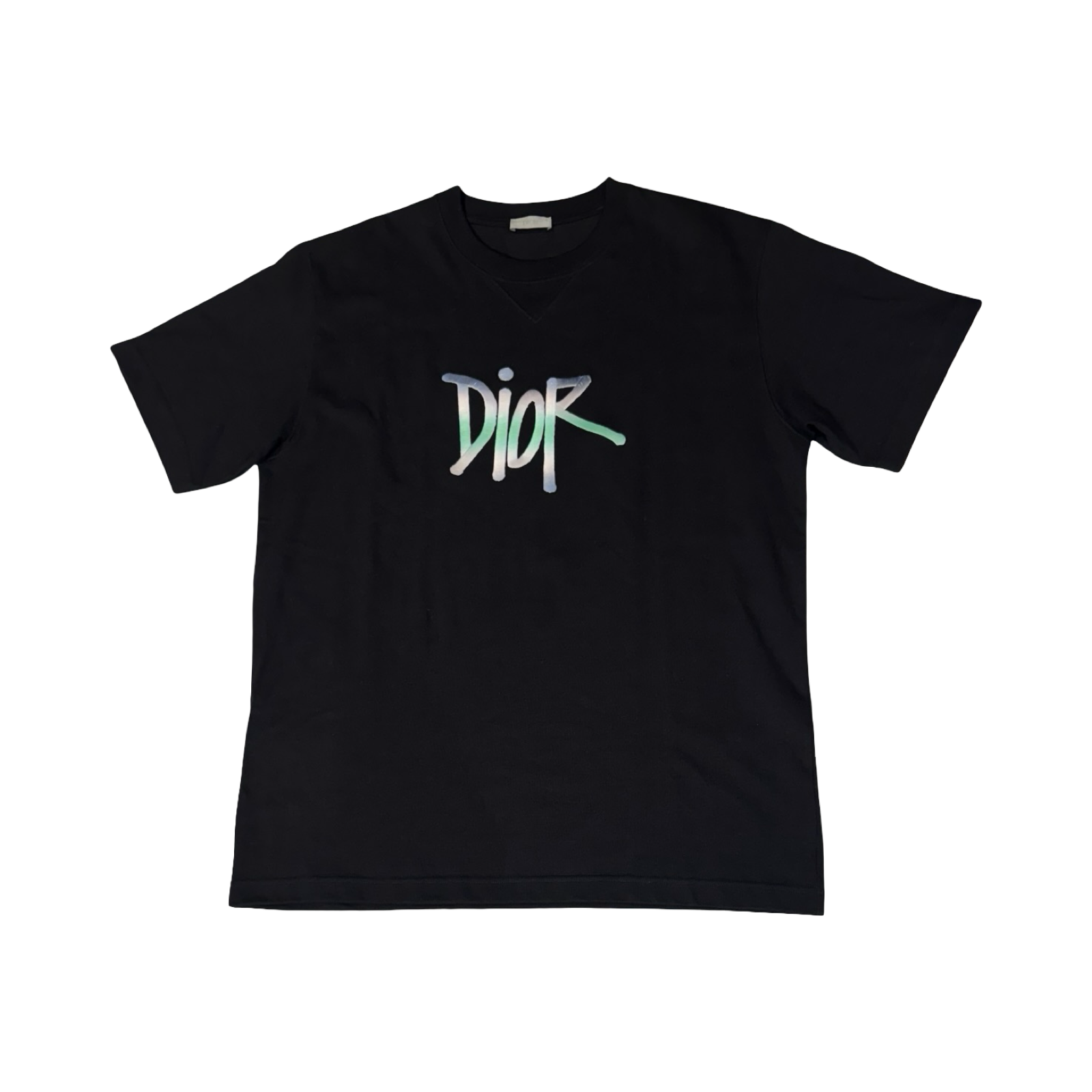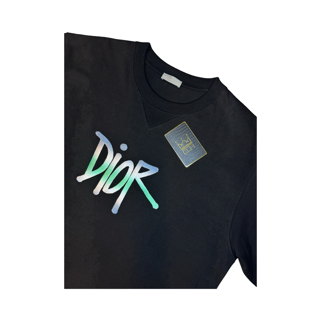 DETAILS: This Dior x Shawn Stussy collab offers Rib knit collar short sleeve tee in black. Item features signature logo embroidered at front chest in green gradient. Made of cotton. Relaxed fit. Made in Italy.