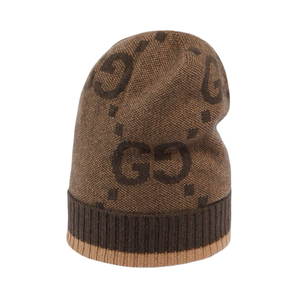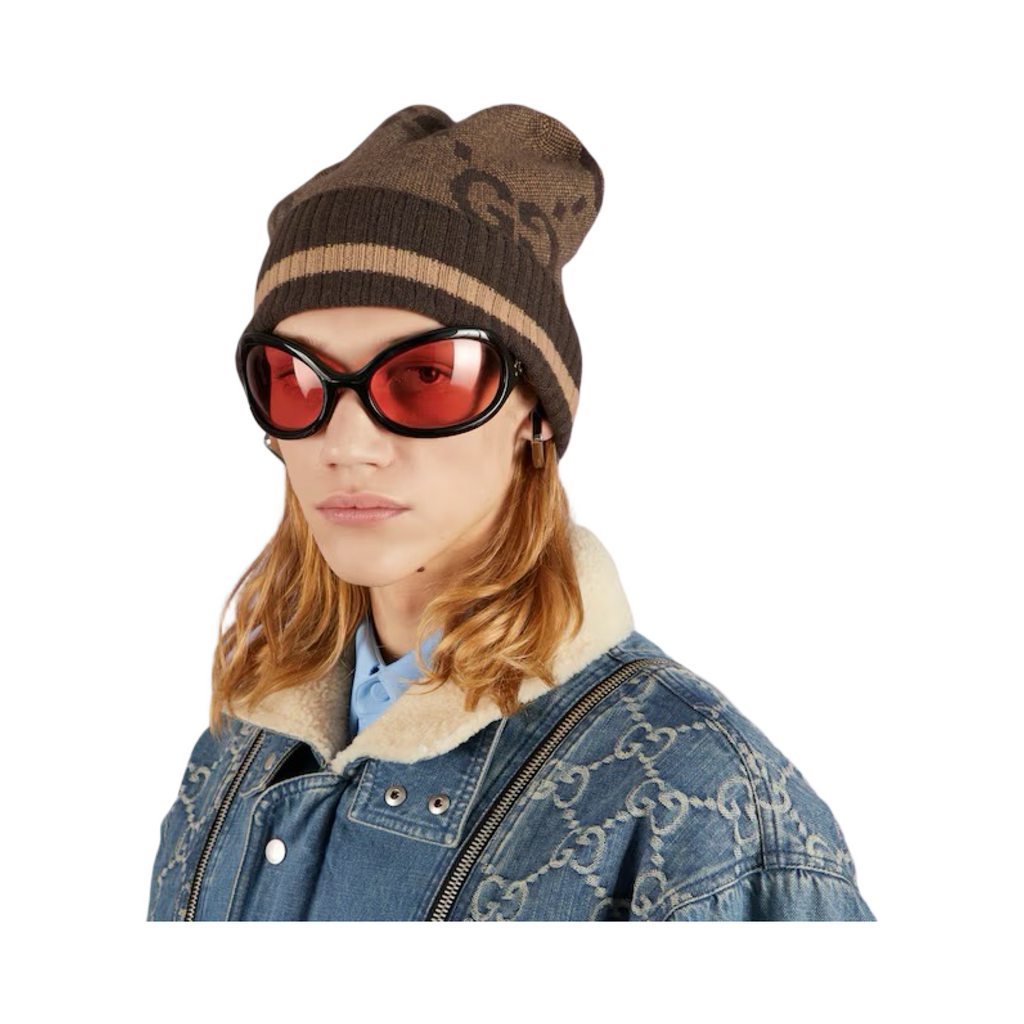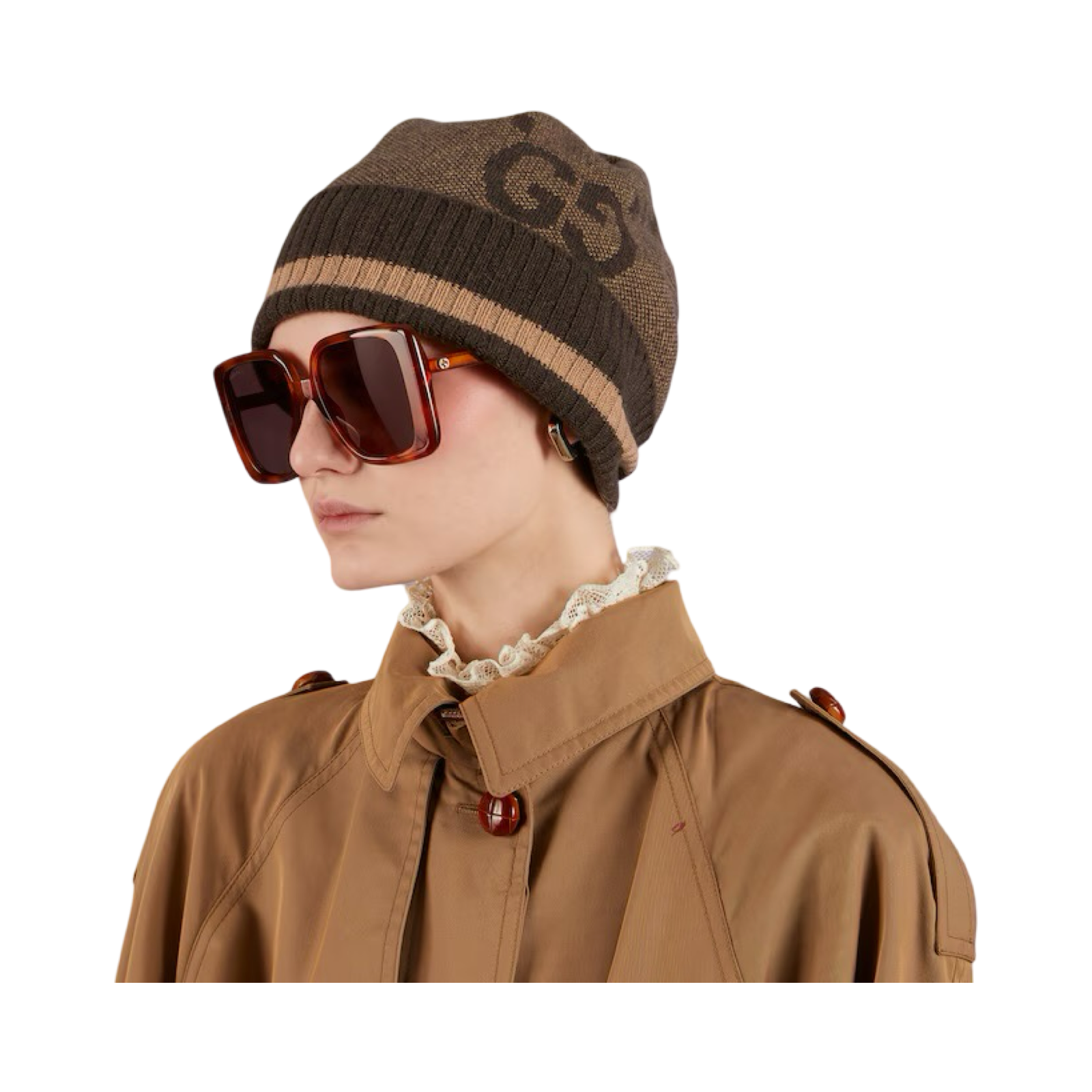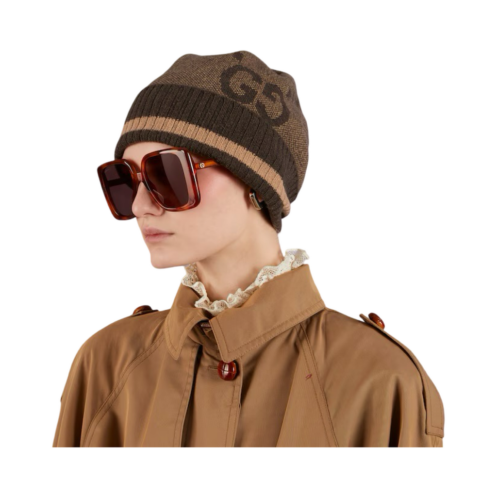 DETAILS: Inspired by the original Gucci rhombi motif, the House’s monogram is revisited and reimagined in new variations each season. Here, the GG motif enriches this soft dark brown cashmere hat, while a ribbed trim and contrasting stripe complete the style.