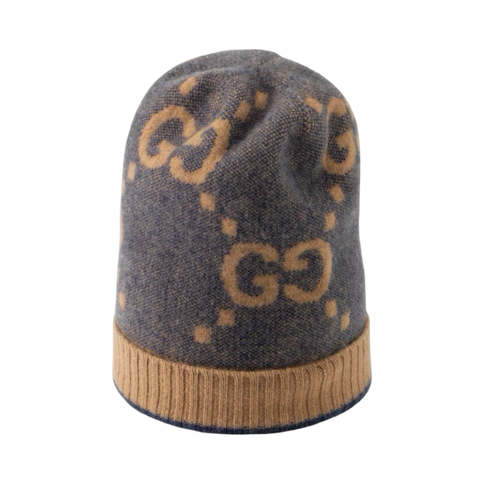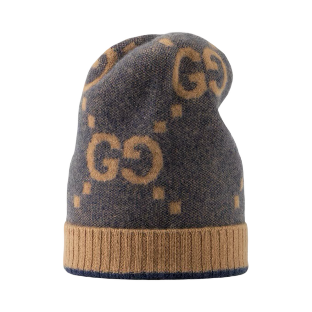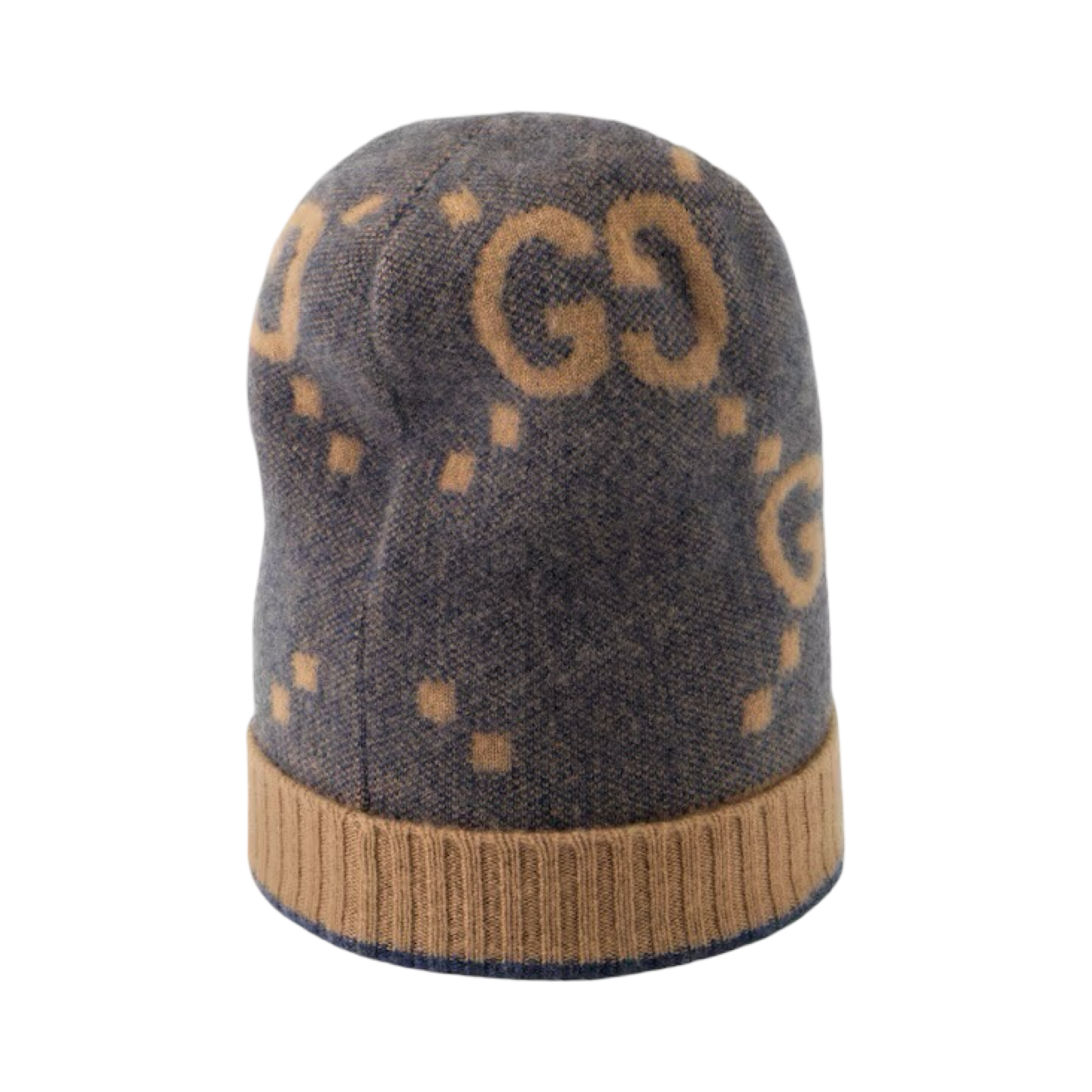 DETAILS: An evolution of the original rhombi design first used in the ’30s, the GG logo has become an established symbol of Gucci’s heritage. Here the motif enriches this soft grey & brown cashmere hat, while a beige ribbed trim and contrasting stripe completes the style.