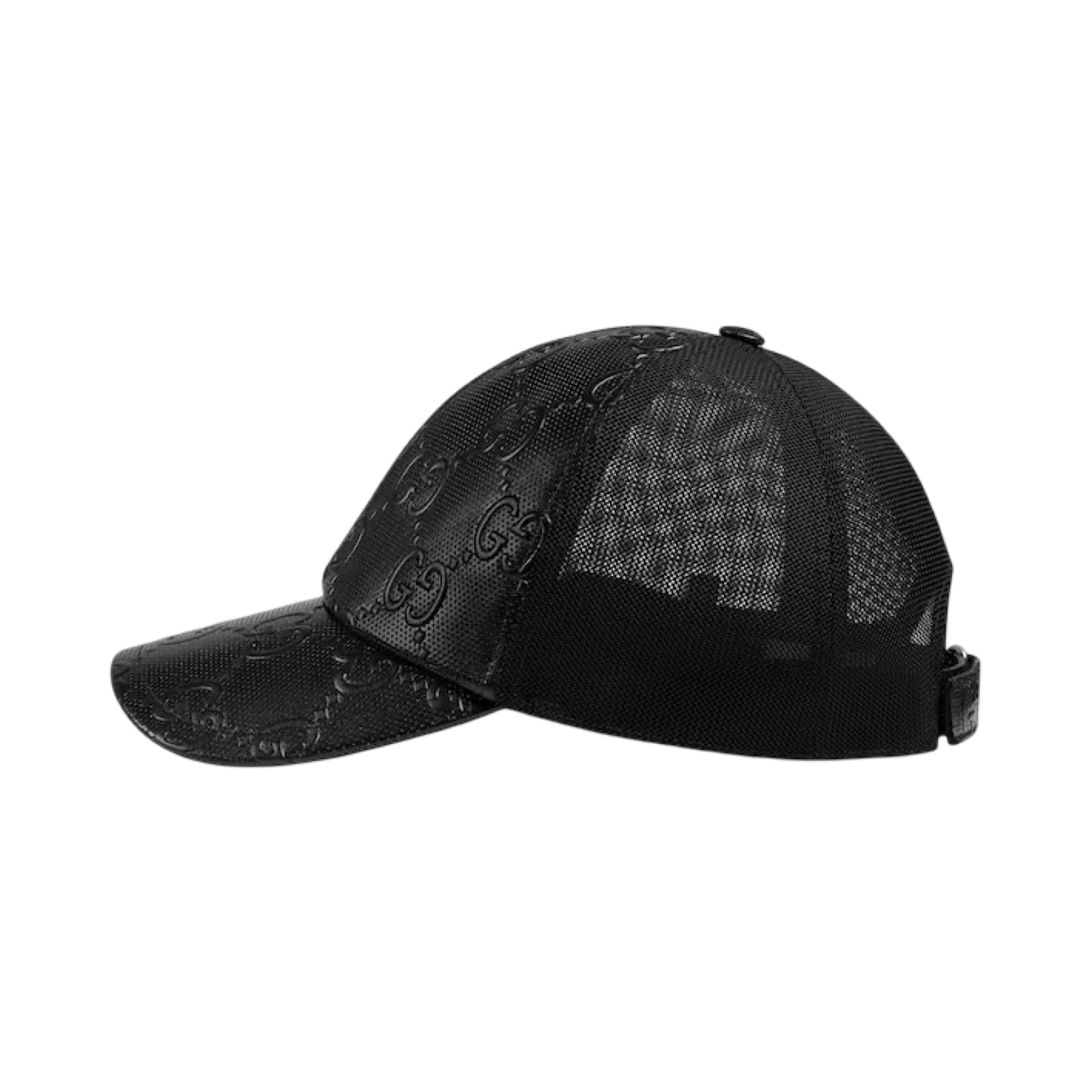 DETAILS: A new introduction of the GG motif presented collection plays with texture, embossing the House emblem onto a perforated leather base. Noted for its softness and slightly shiny finish, the GG leather is presented as a baseball hat with a mesh back.