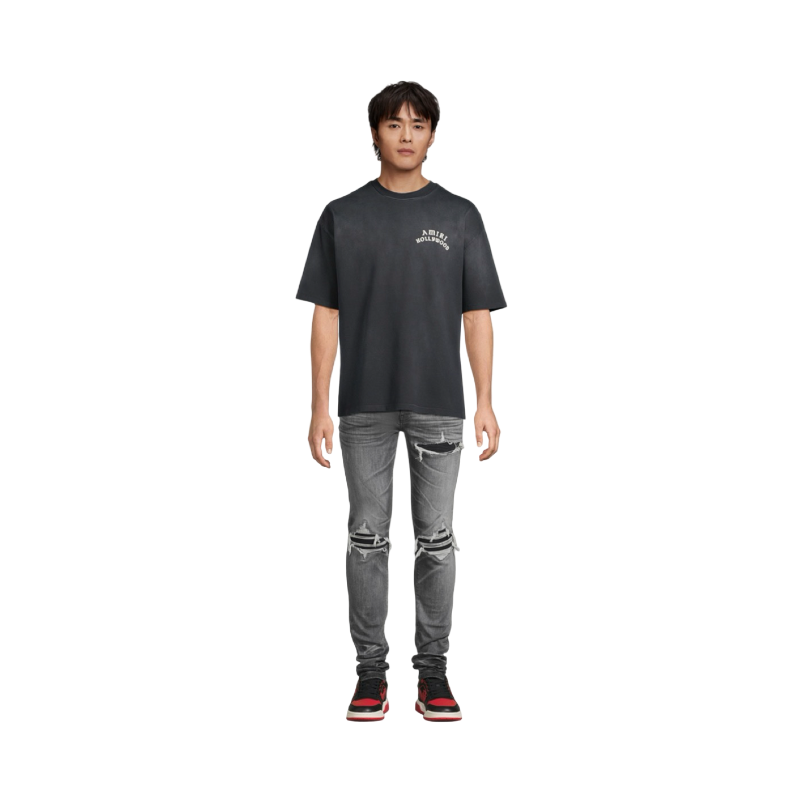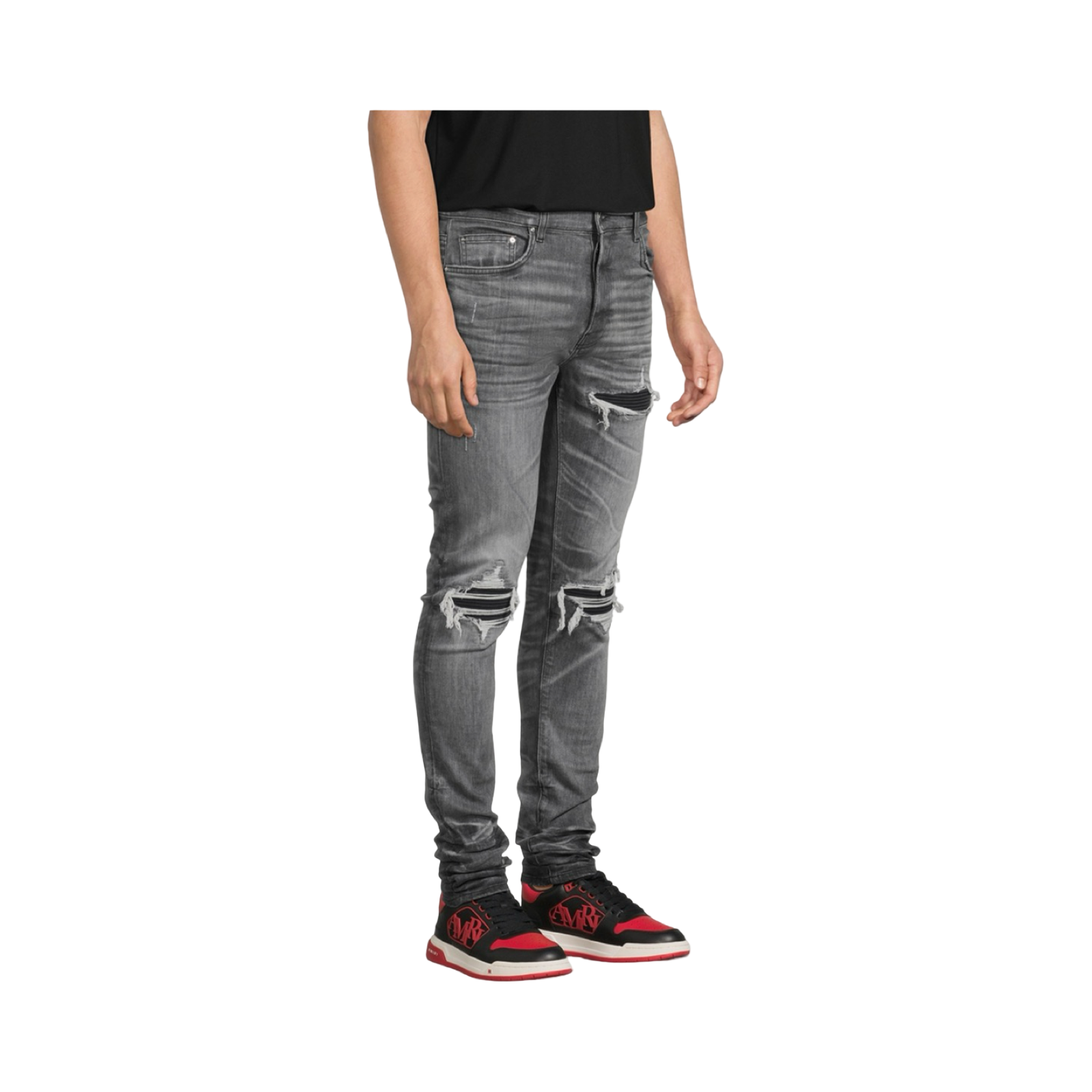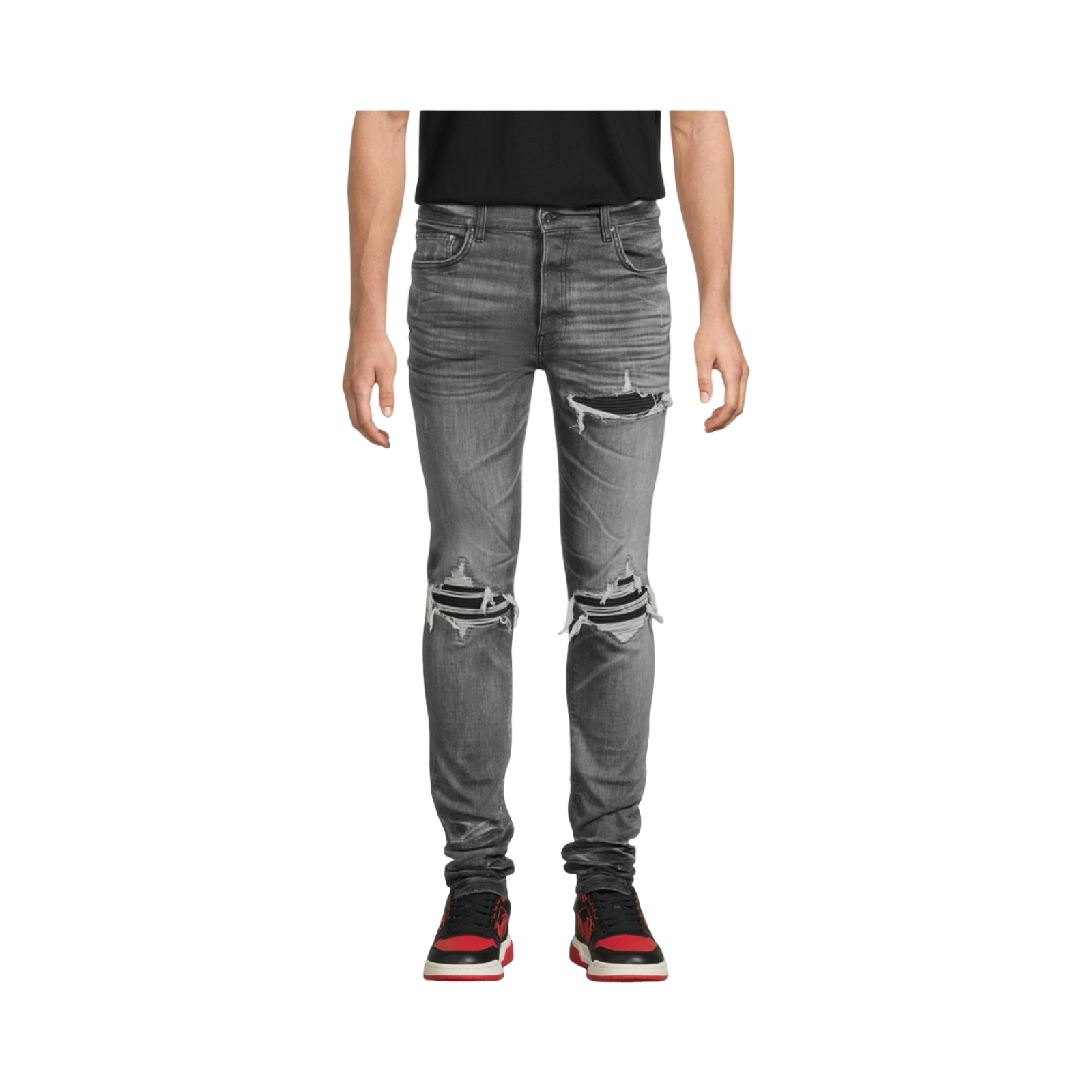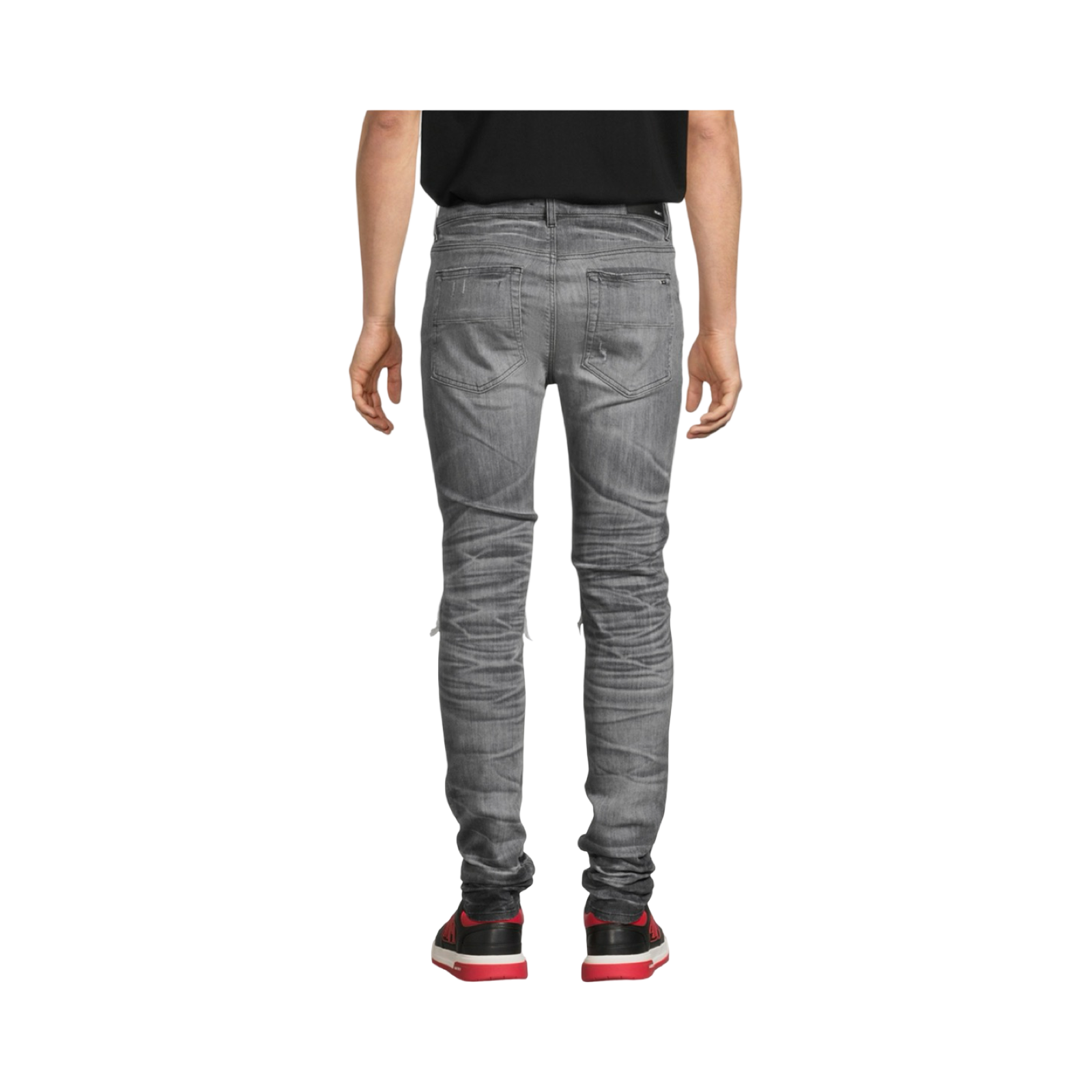 DETAILS: Cut with a skinny-fit silhouette, these five-pocket jeans are detailed with a buttoned fly fastening and ripped holes on the front, filled with signature ribbed accents in black colour. Finished with hand-distressing and abrading throughout.