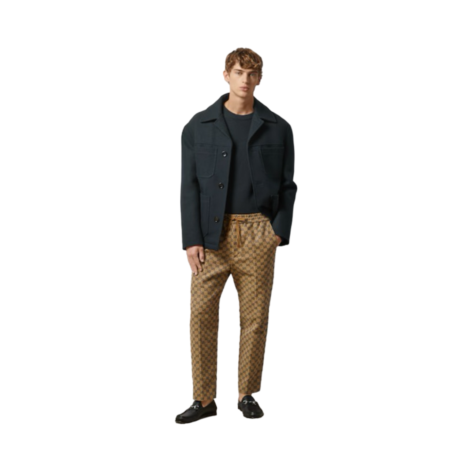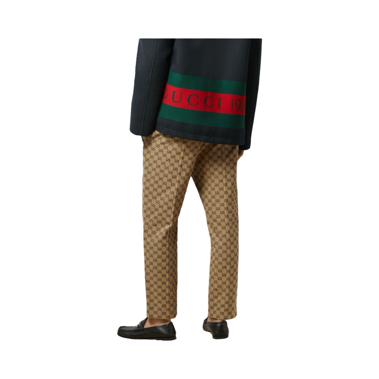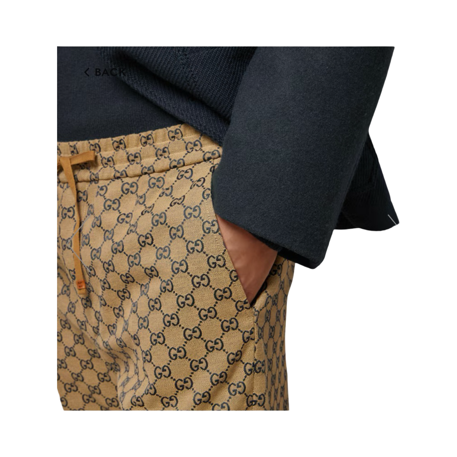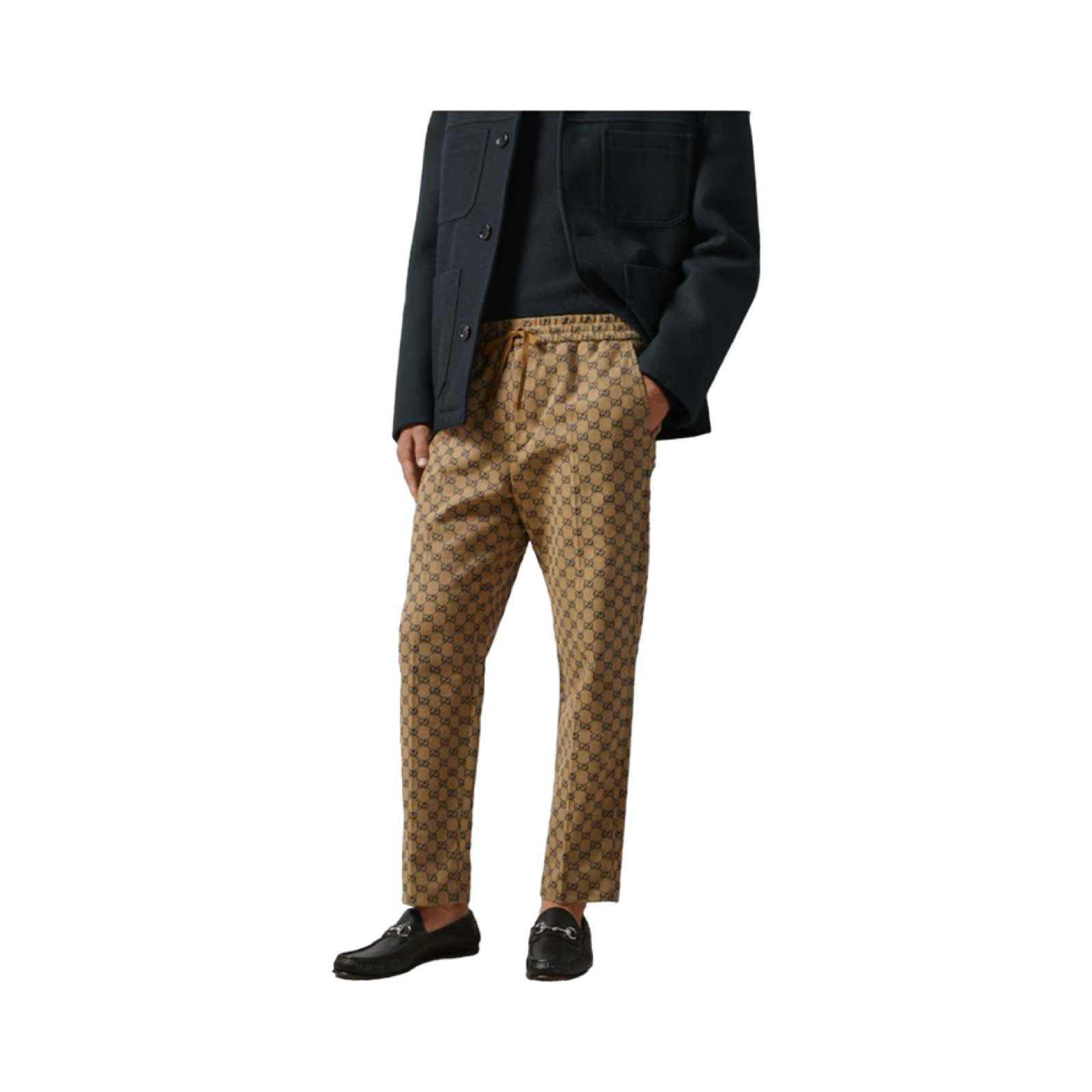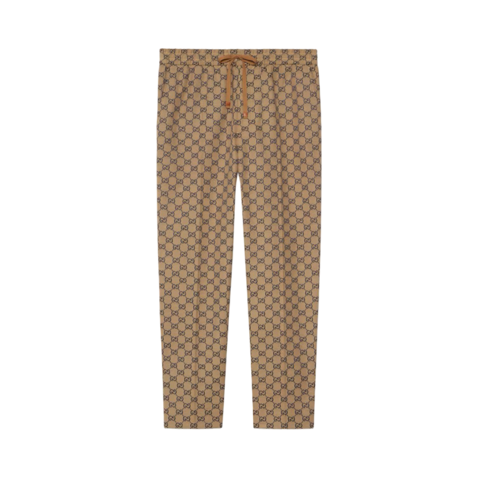 DETAILS: Part of the concept of hybridization permeating the House's narrative universe, this jogging pant is crafted from GG cotton canvas, in a classic combination of beige and ebony, a material often used in tailoring pieces and traditional silhouettes.