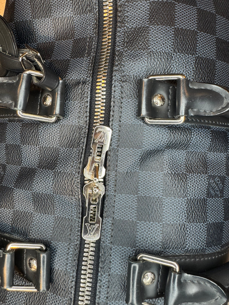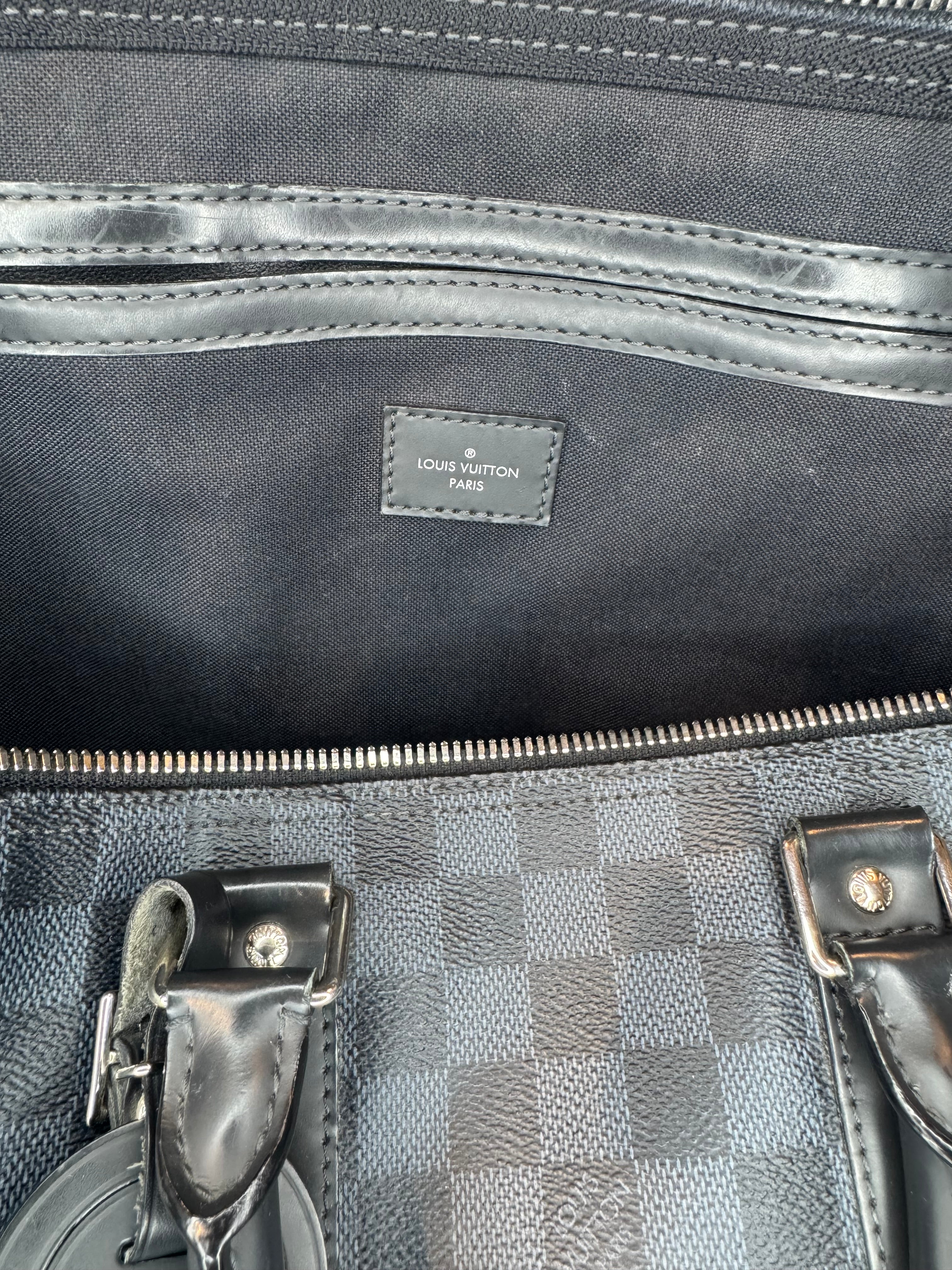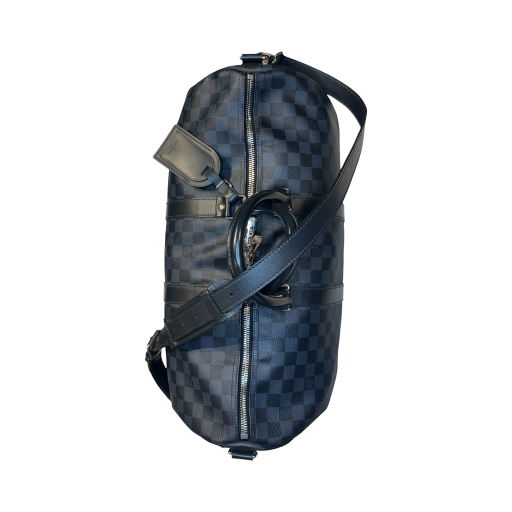 DETAILS: The classic and iconic Louis Vuitton Keepall Bandoulière 45 in a beautiful Damier Cobalt canvas. The geometric pattern delivers an understated elegance and a touch of sophistication.