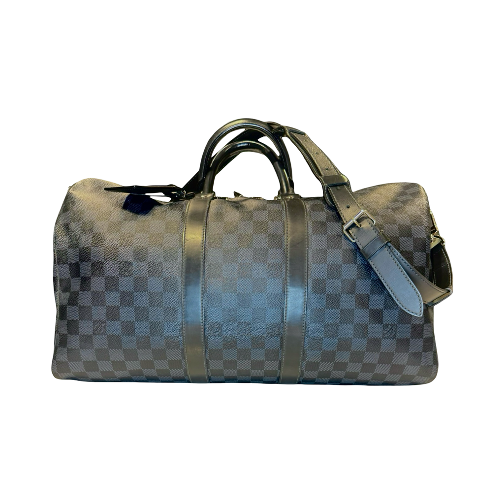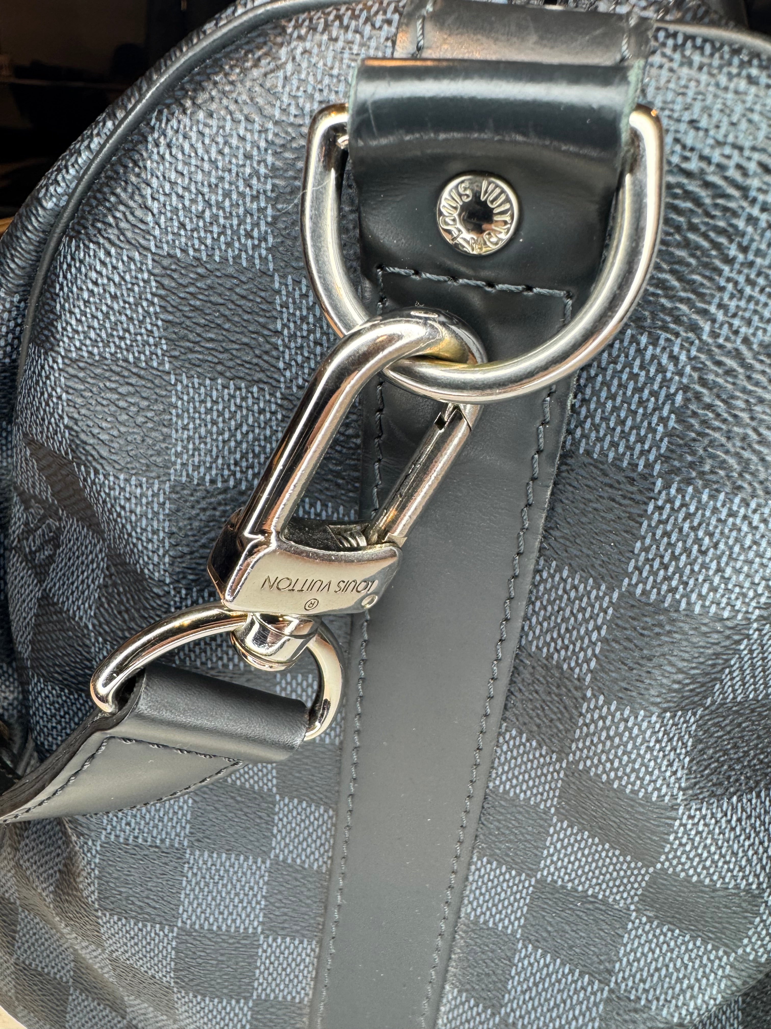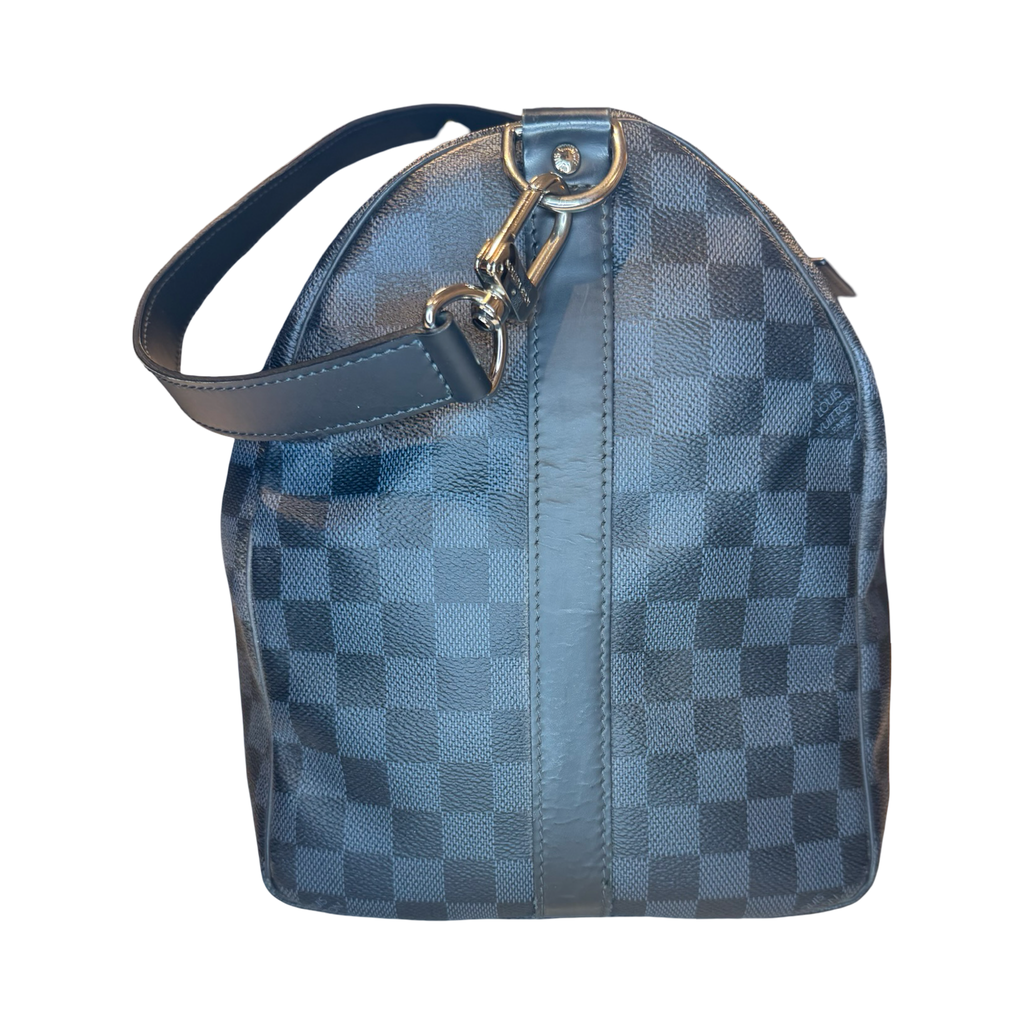 DETAILS: The classic and iconic Louis Vuitton Keepall Bandoulière 45 in a beautiful Damier Cobalt canvas. The geometric pattern delivers an understated elegance and a touch of sophistication.