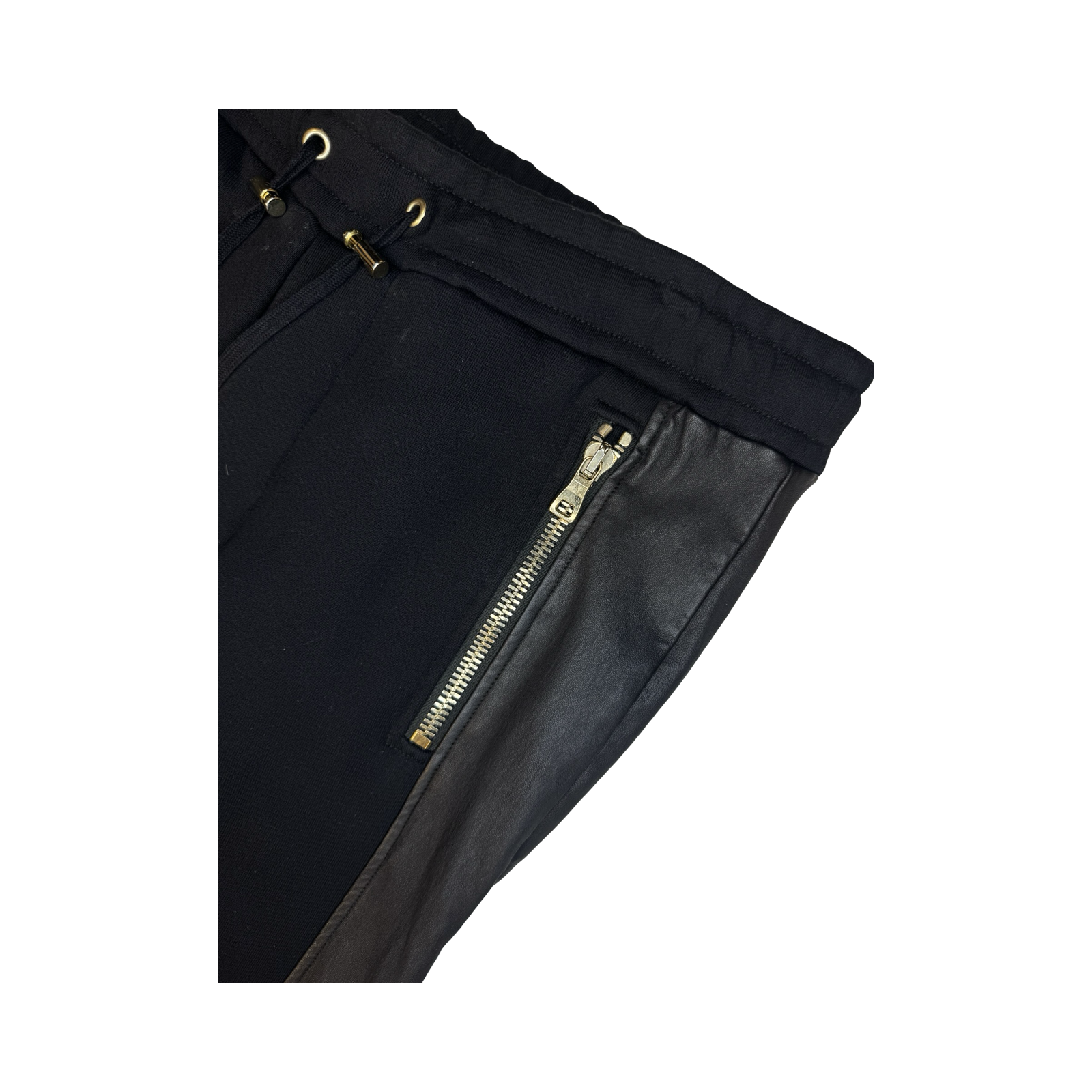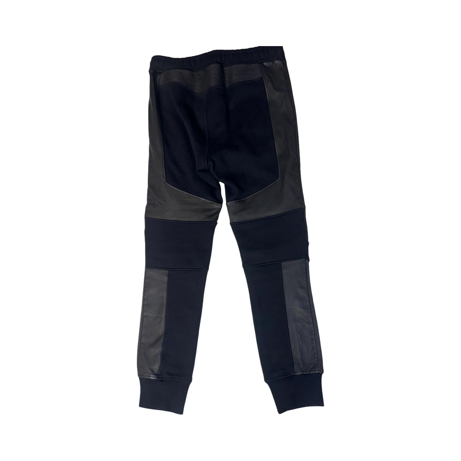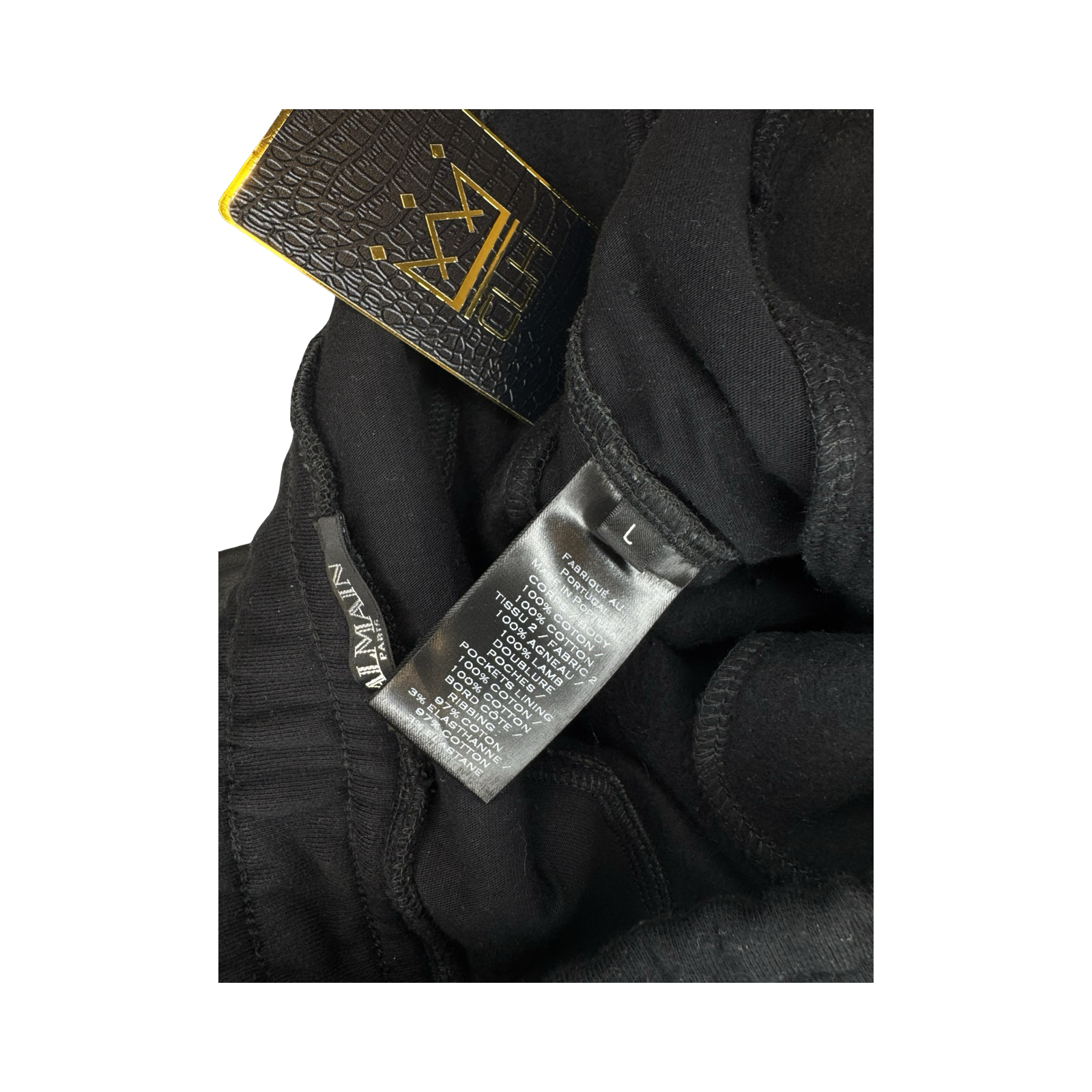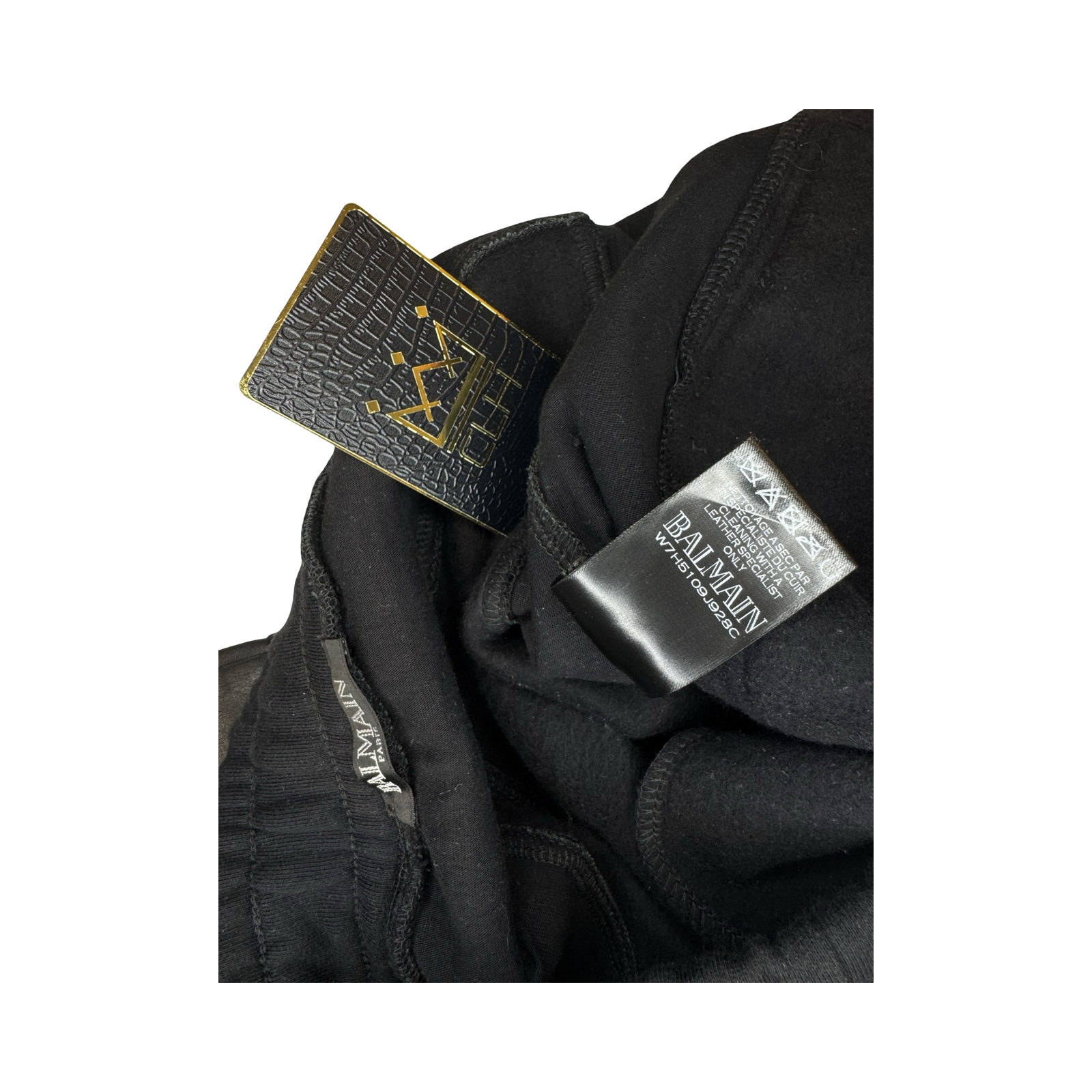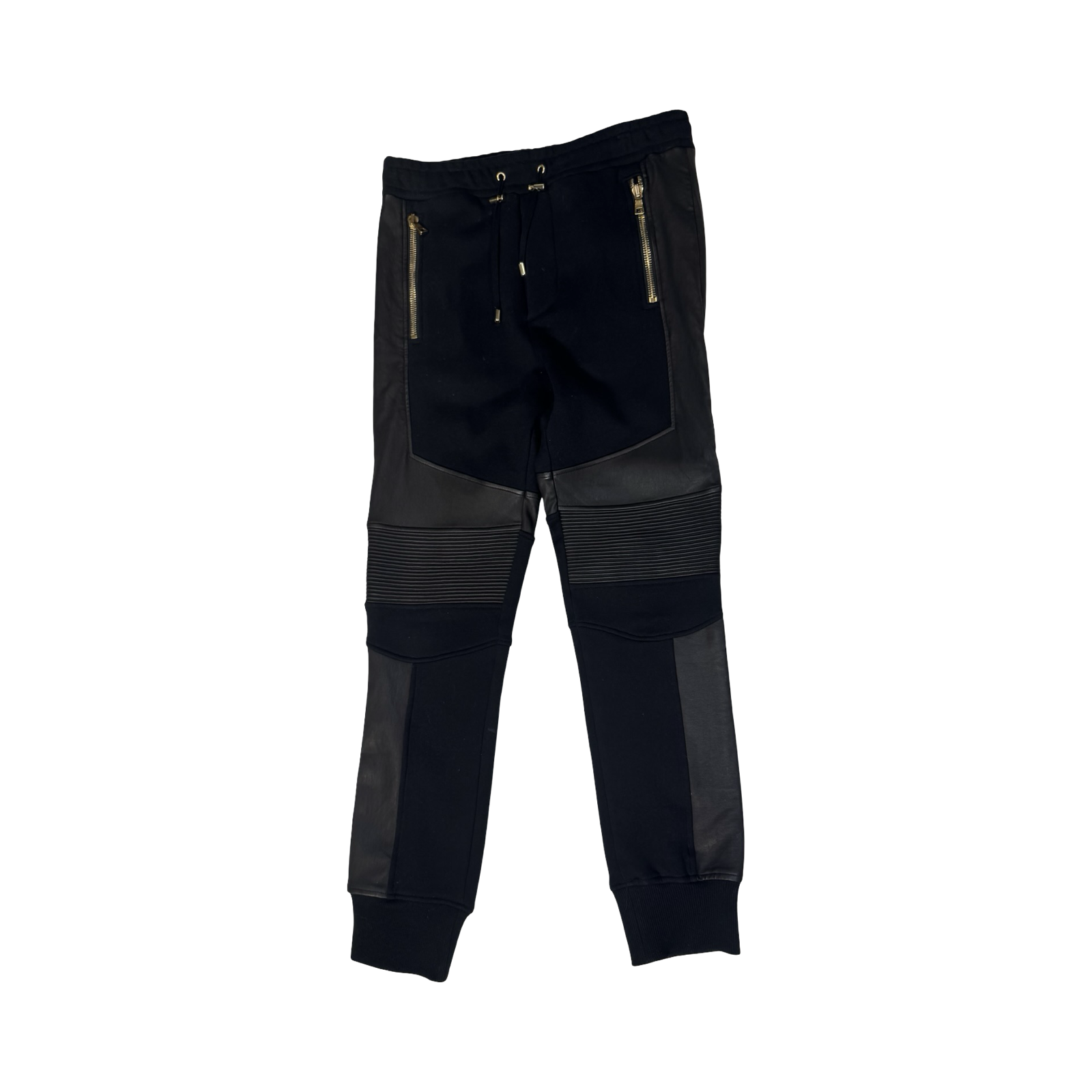 DETAILS: Balmain Joggers in black offer the signature biker design with gold zipper pockets and lamb skin patches, cuffed ankles. SLIM FIT. Made in Portugal.