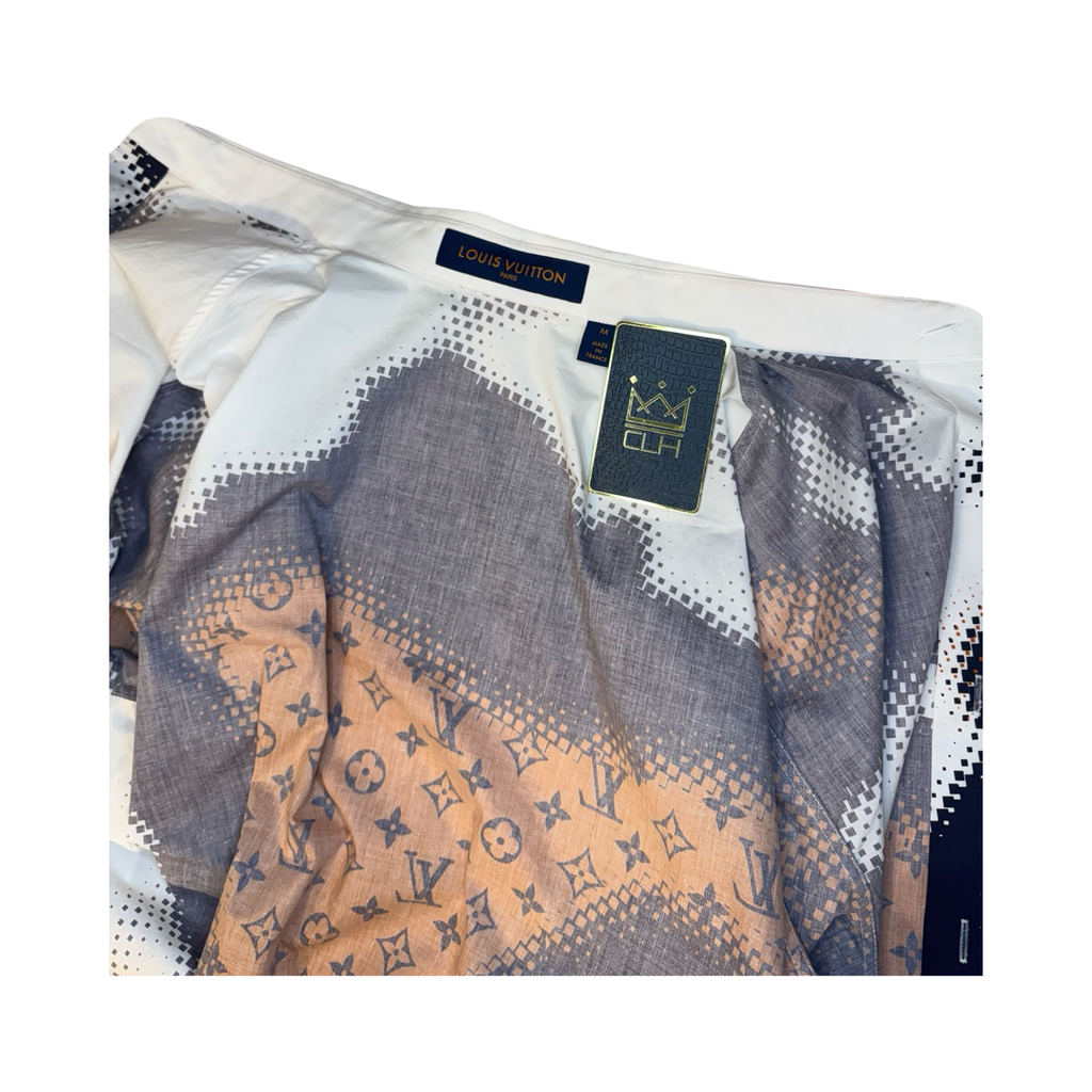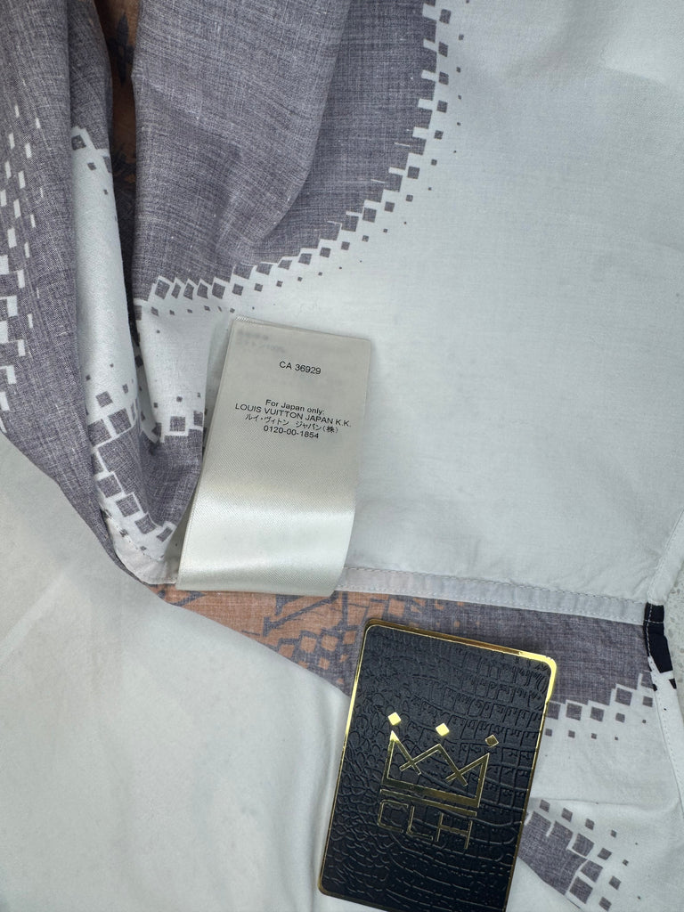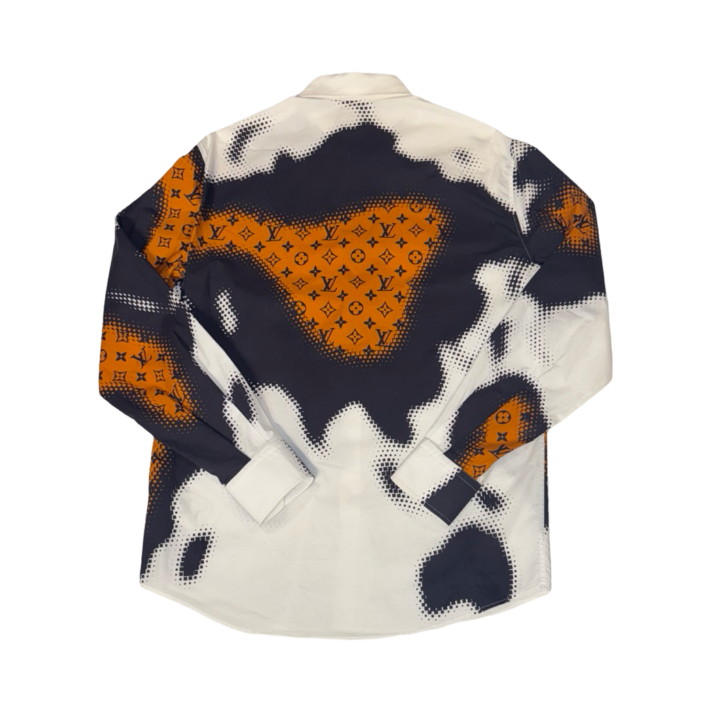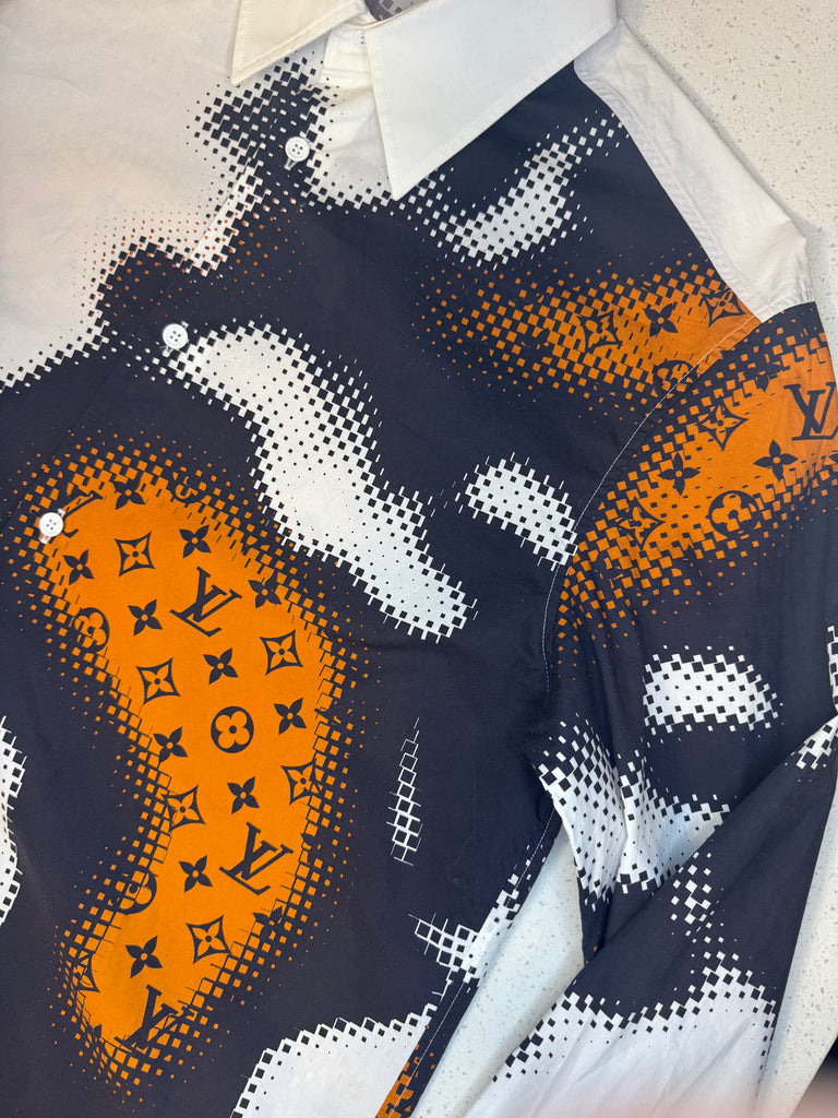 DETAILS: This Louis Vuitton Orange Map Camo White Shirt exemplifies the house’s commitment to innovative prints and refined tailoring. Crafted from crisp white fabric, this shirt is distinguished by its striking orange map camouflage motif, a contemporary reinterpretation of classic utility patterns. The lightweight texture and precise cut deliver structured ease and subtle volume at the shoulders.