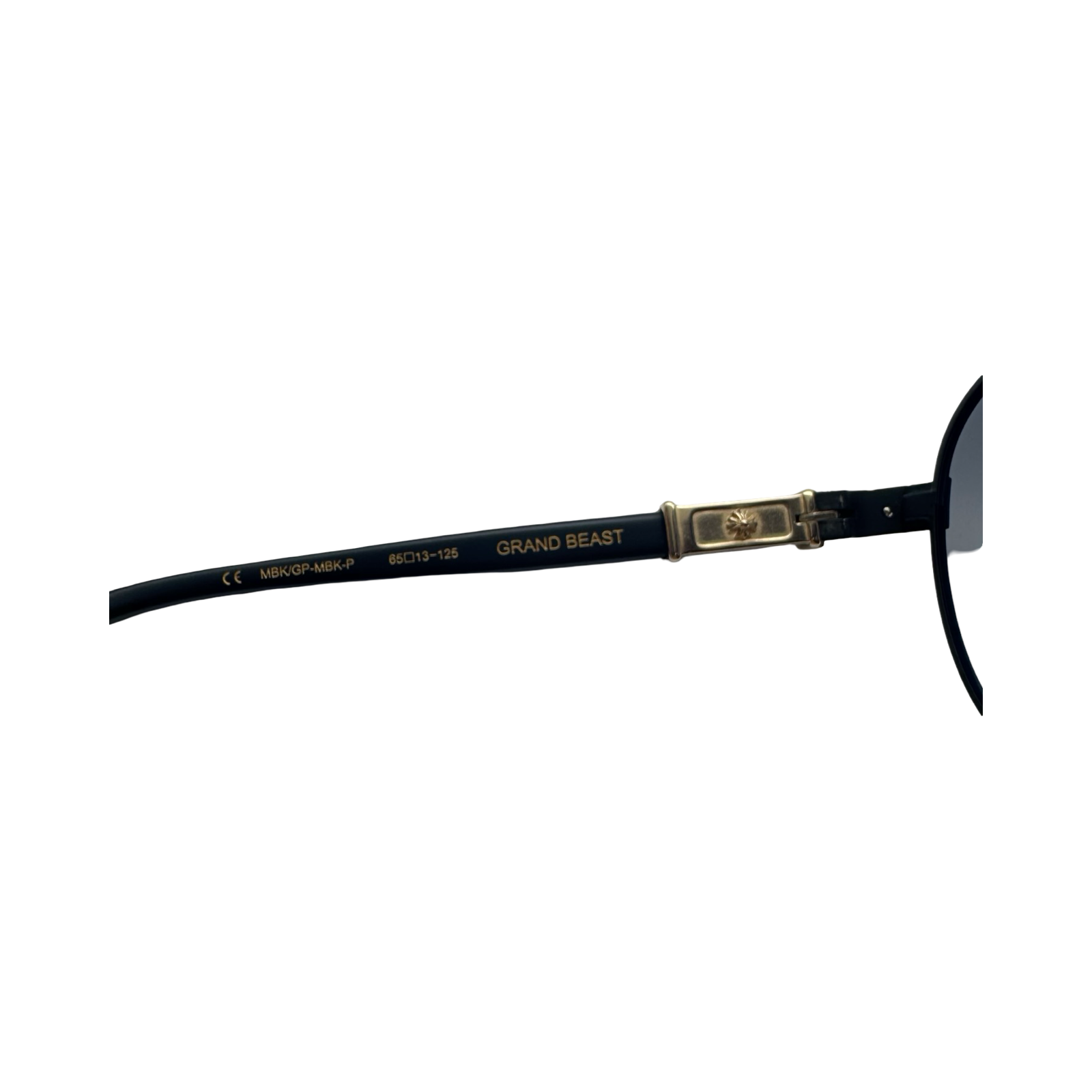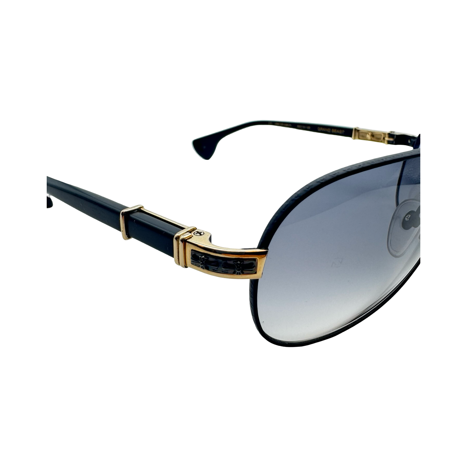 DETAILS: These Chrome Hearts Grand Beast sunglasses feature a black frame with gold signature detail on the side and logo on the ends of the arms. Made in Japan.