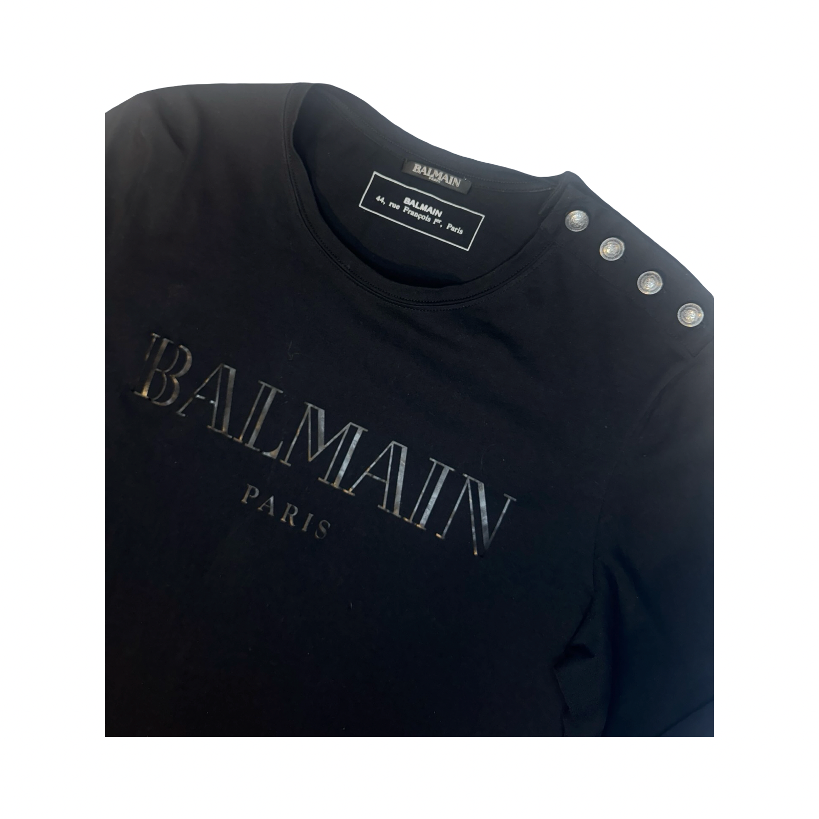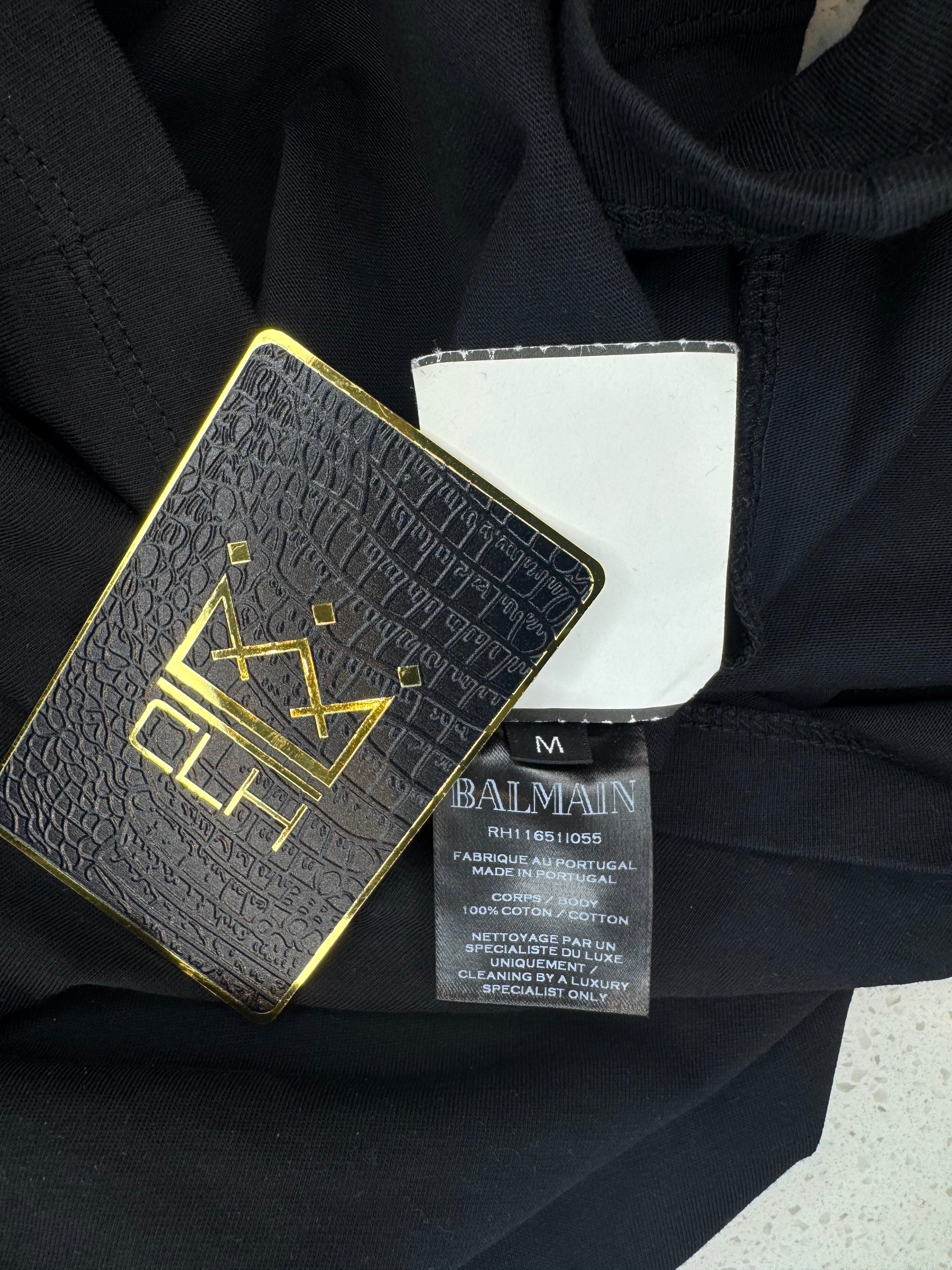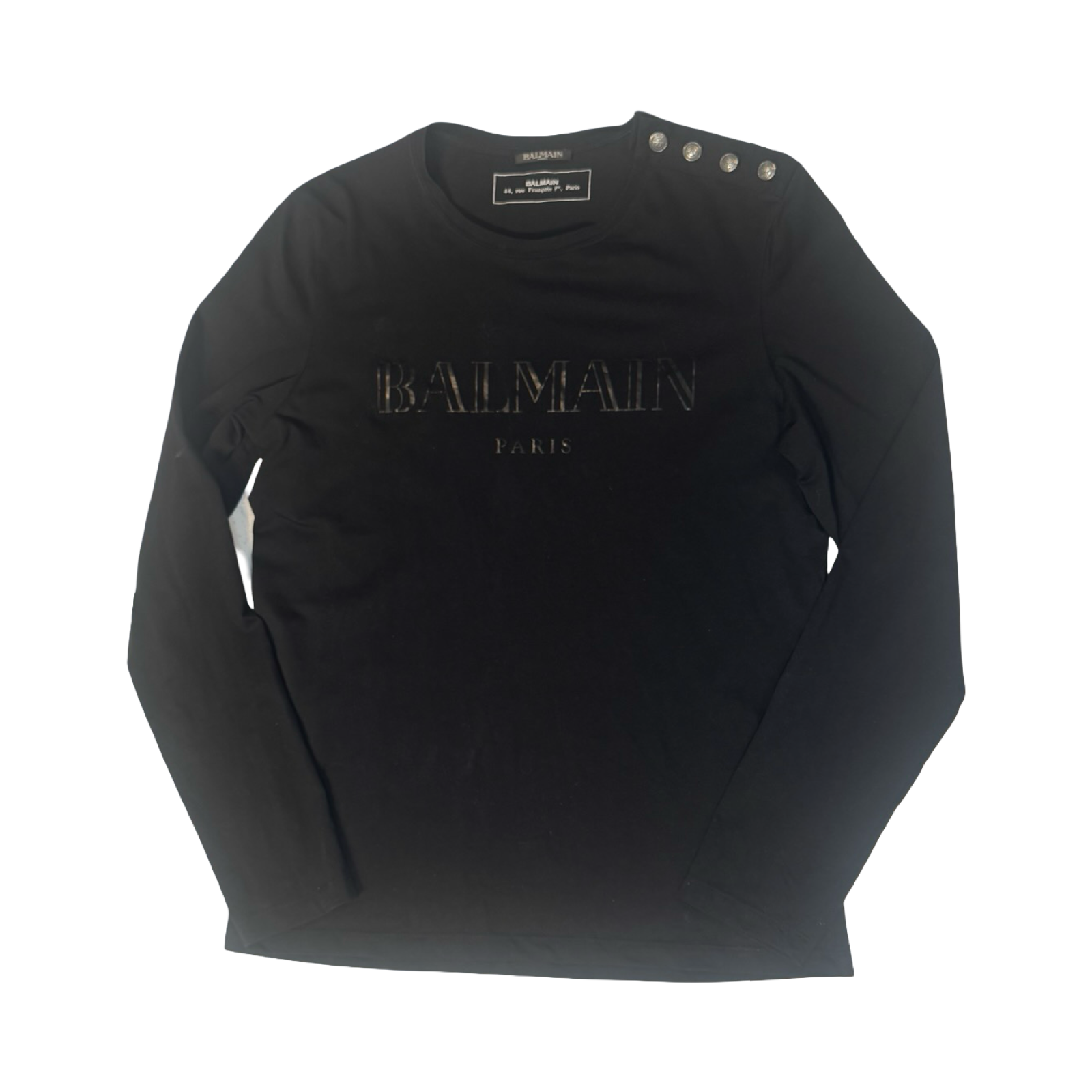 DETAILS: This long sleeve shirt from Balmain features 4 signature buttons on the left shoulder, logo on front.