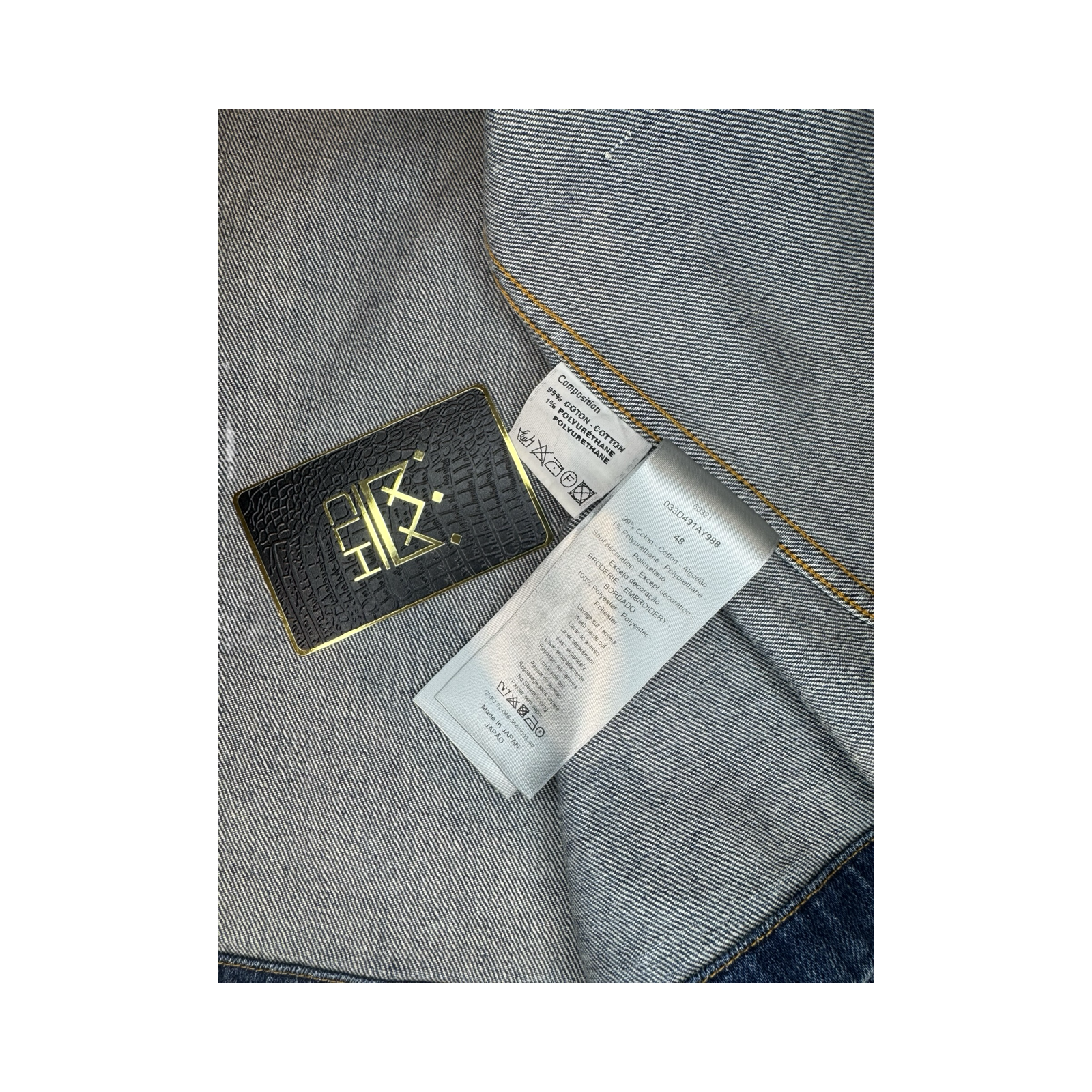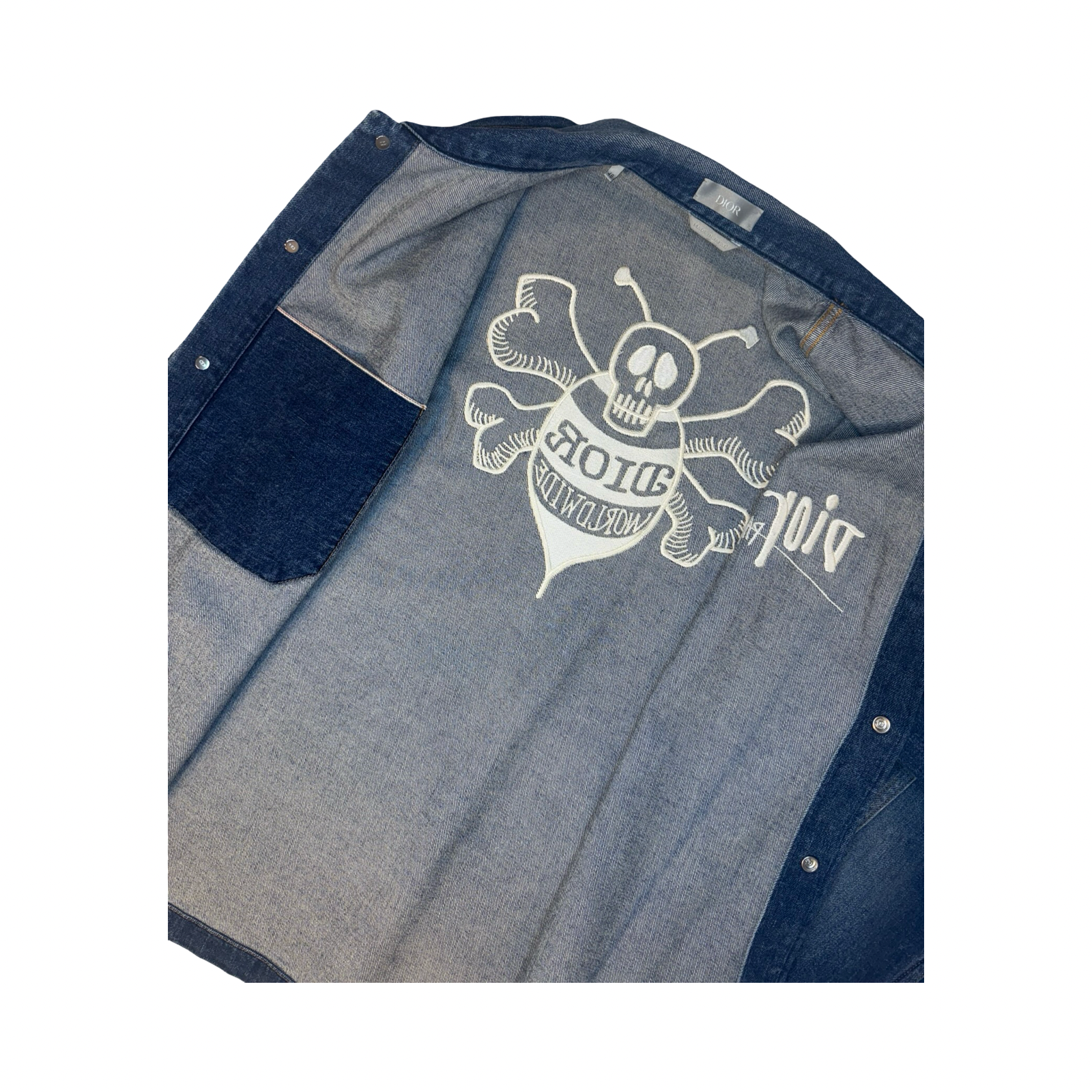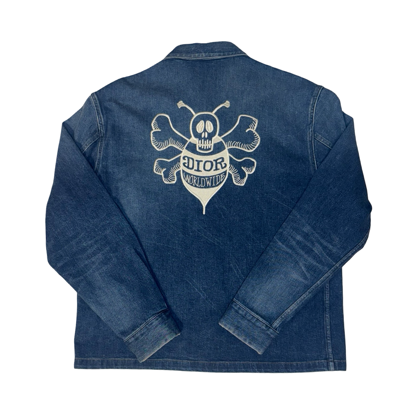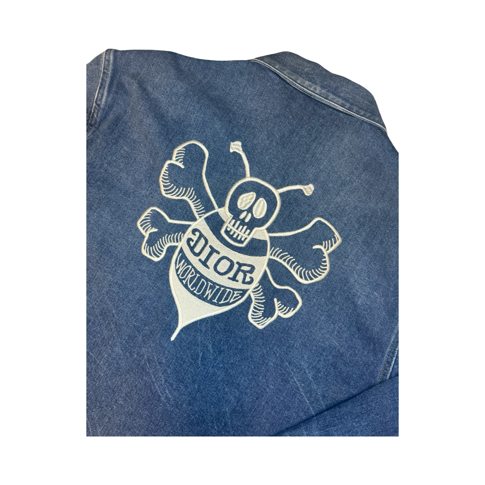 DETAILS: From the Dior x Shawn Stüssy collaboration, this oversized piece features a blue base with a white Dior Stüssy logo embroidered on the chest and a large white Dior bee embroidery on the back.