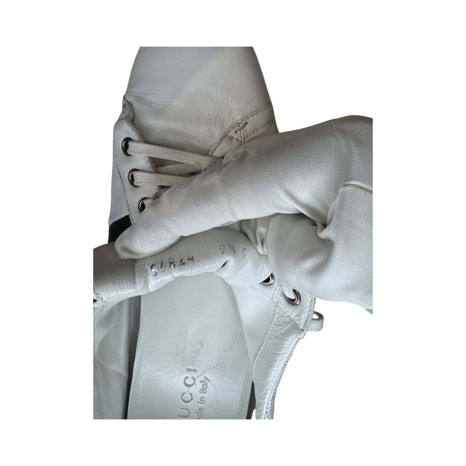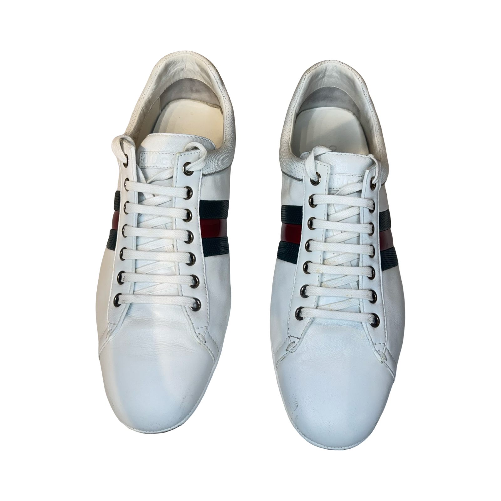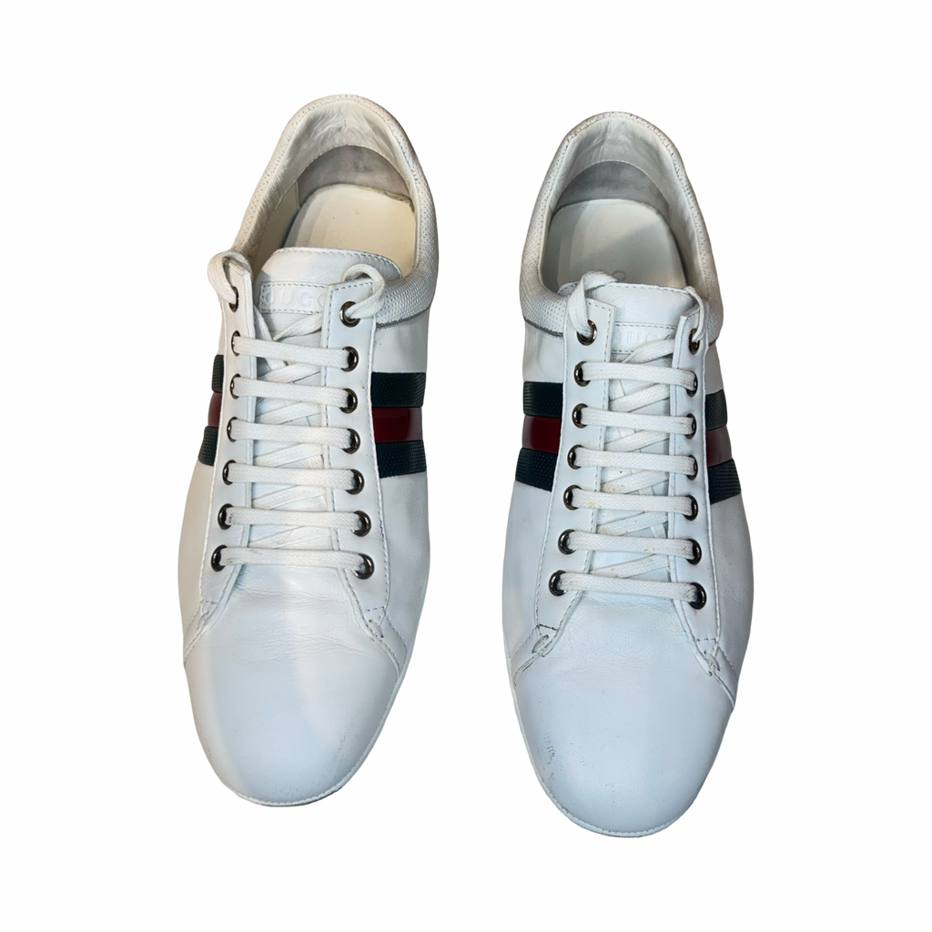 DETAILS: Gucci sneakers made in white leather featuring the supreme web on the side, lace closure and rubber grips that goes beyond the heel. Made in Italy.