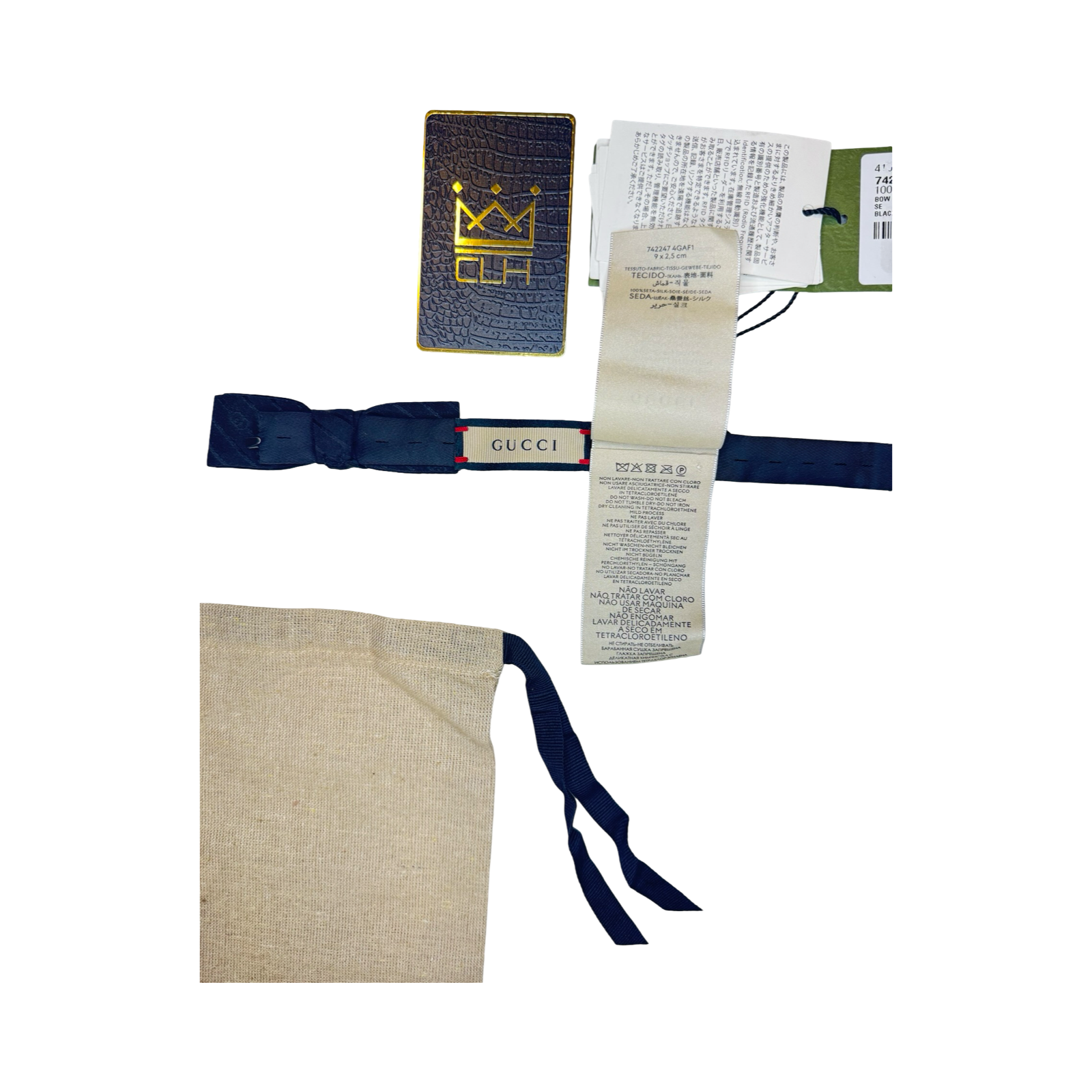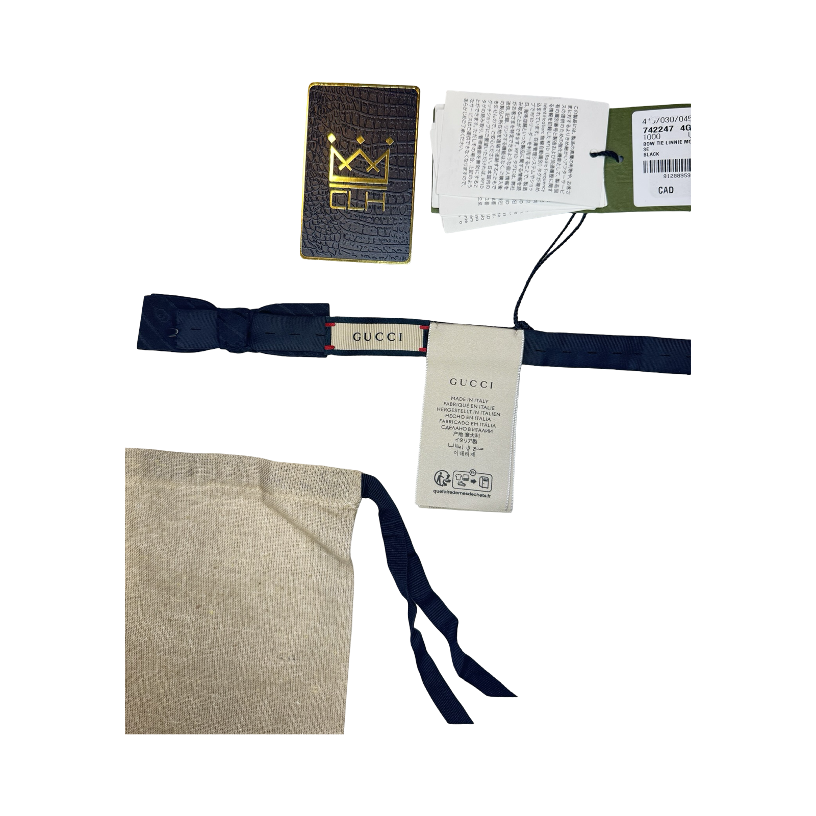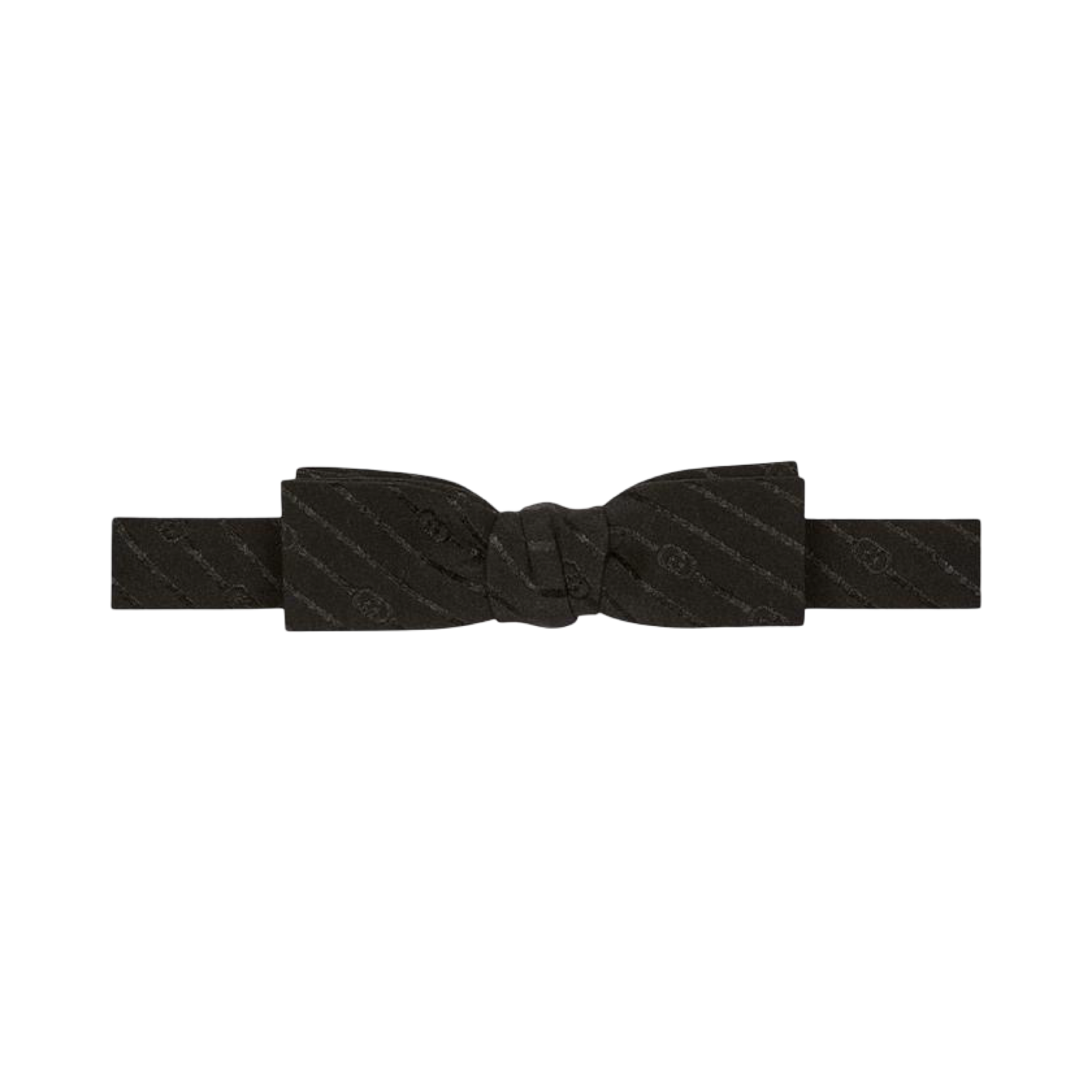DETAILS: Black bow tie from Gucci. Made of silk, this item showcases a monogram motif accompanied by satin pinstripes.