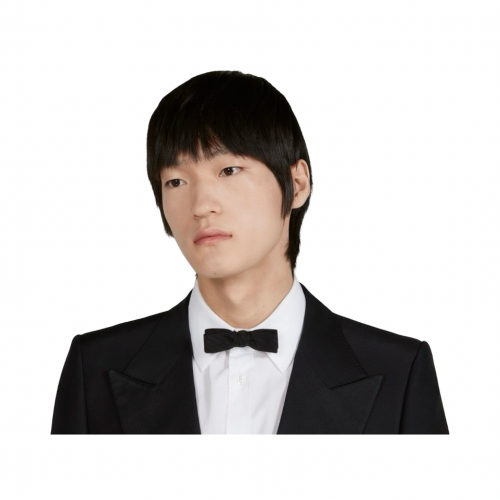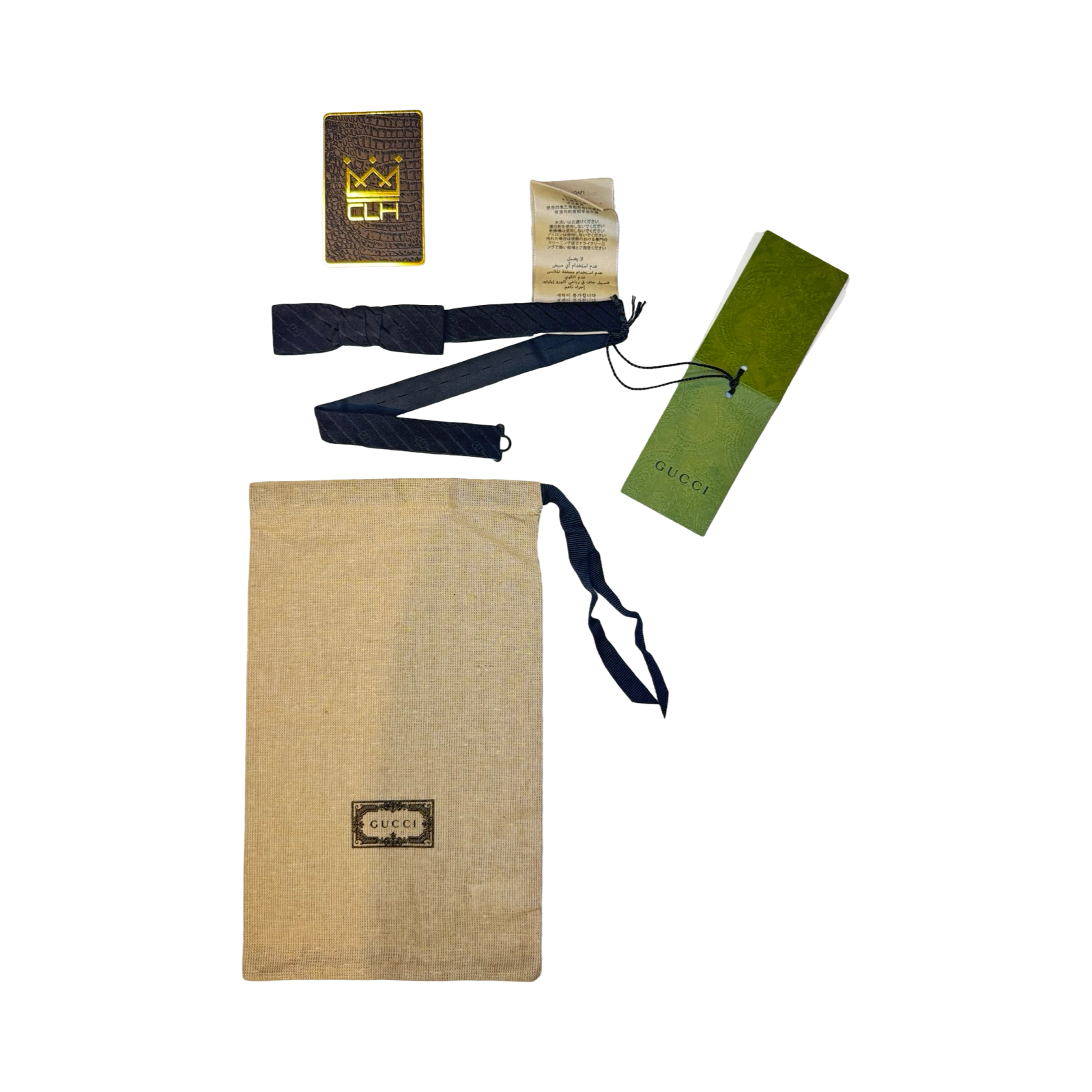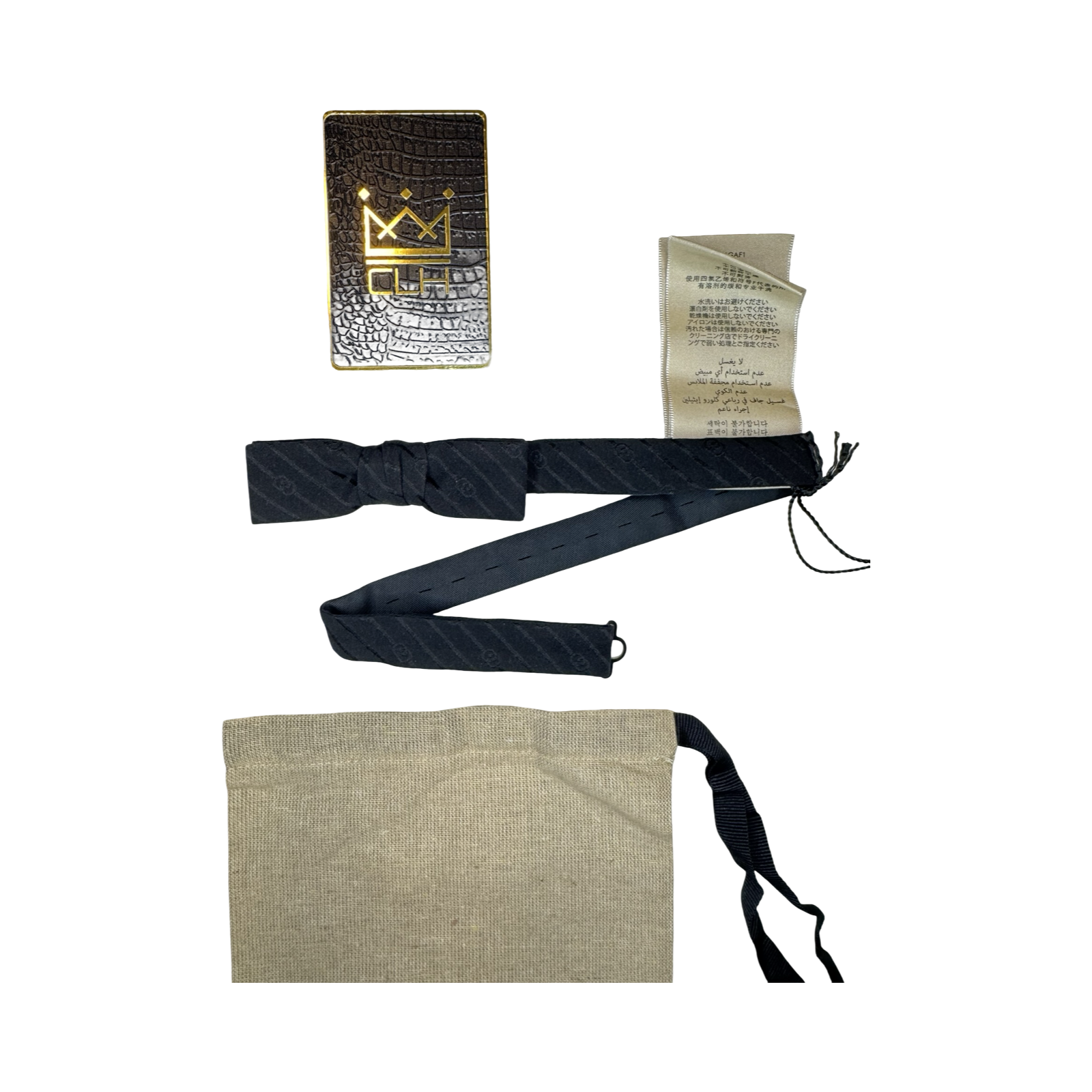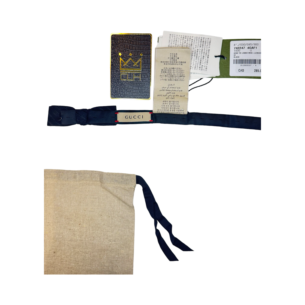 DETAILS: Black bow tie from Gucci. Made of silk, this item showcases a monogram motif accompanied by satin pinstripes.