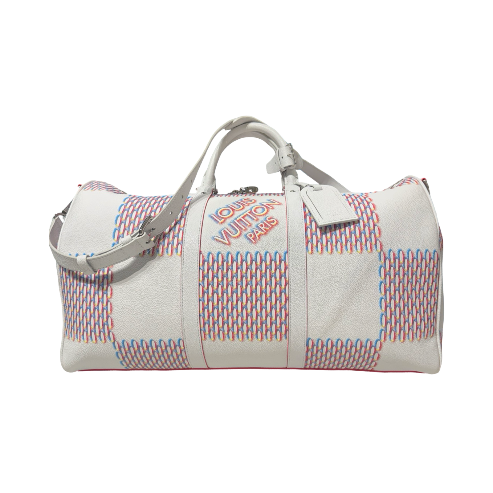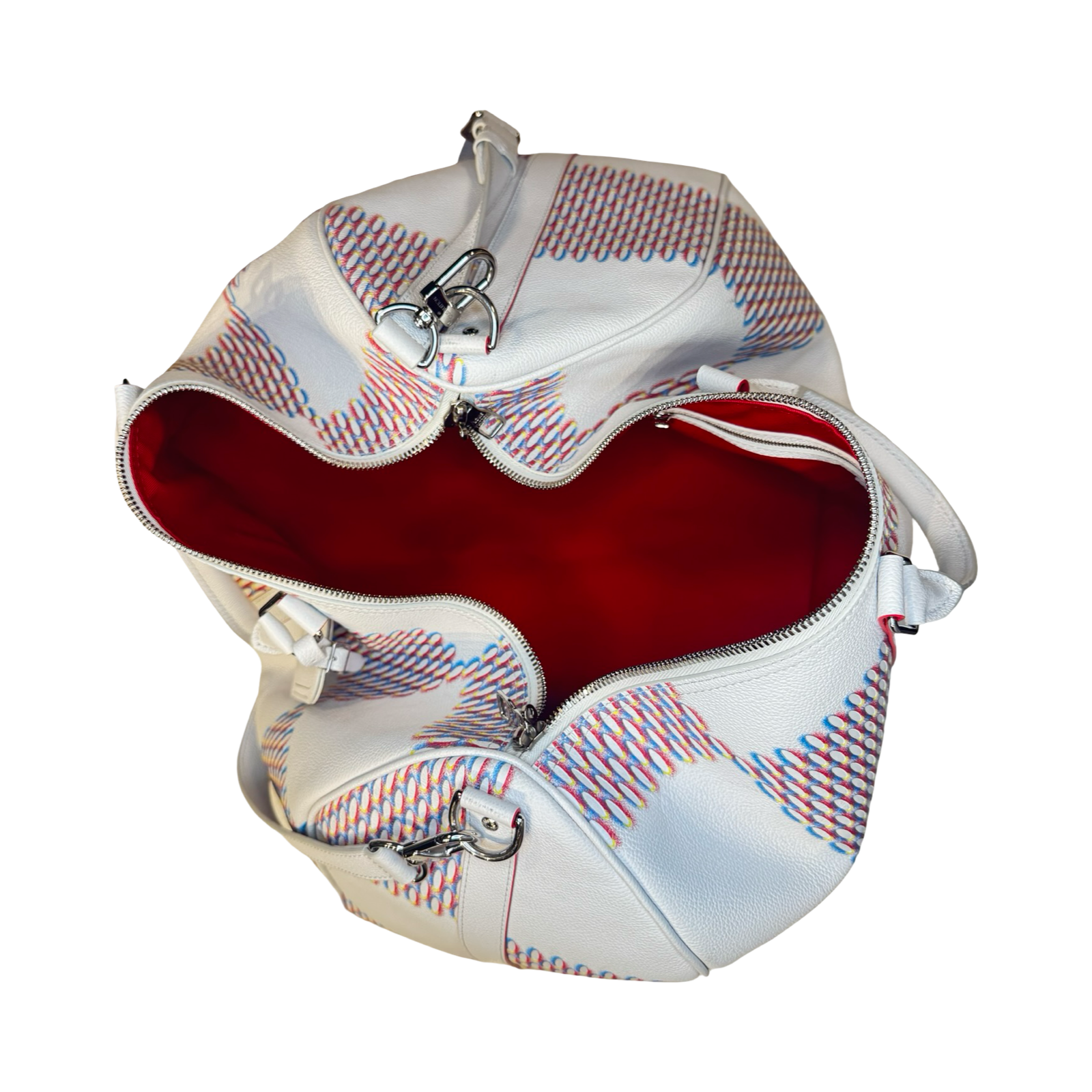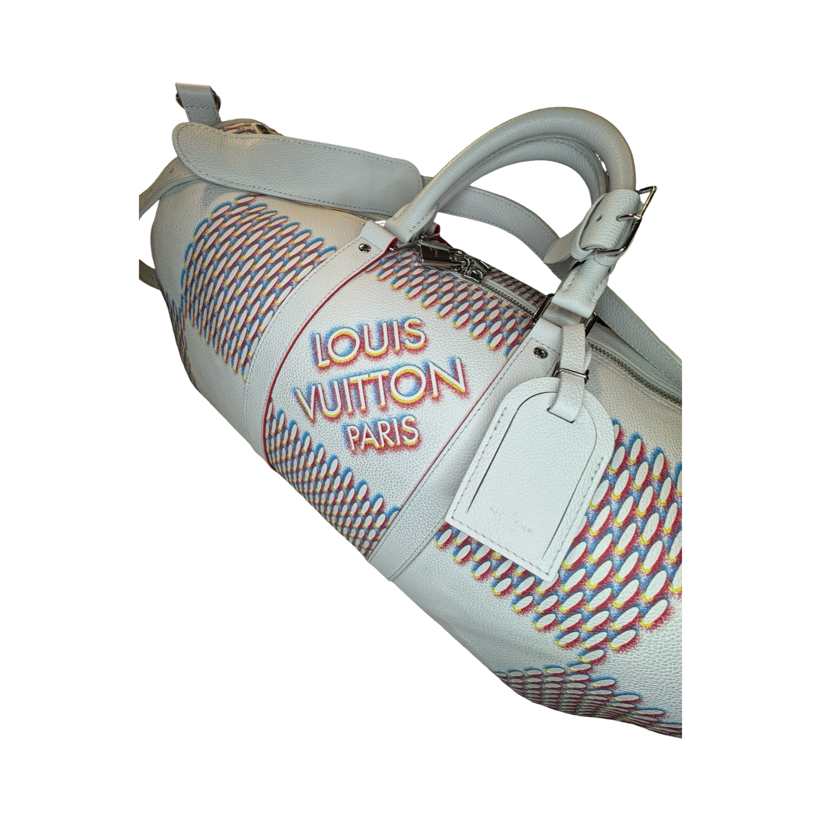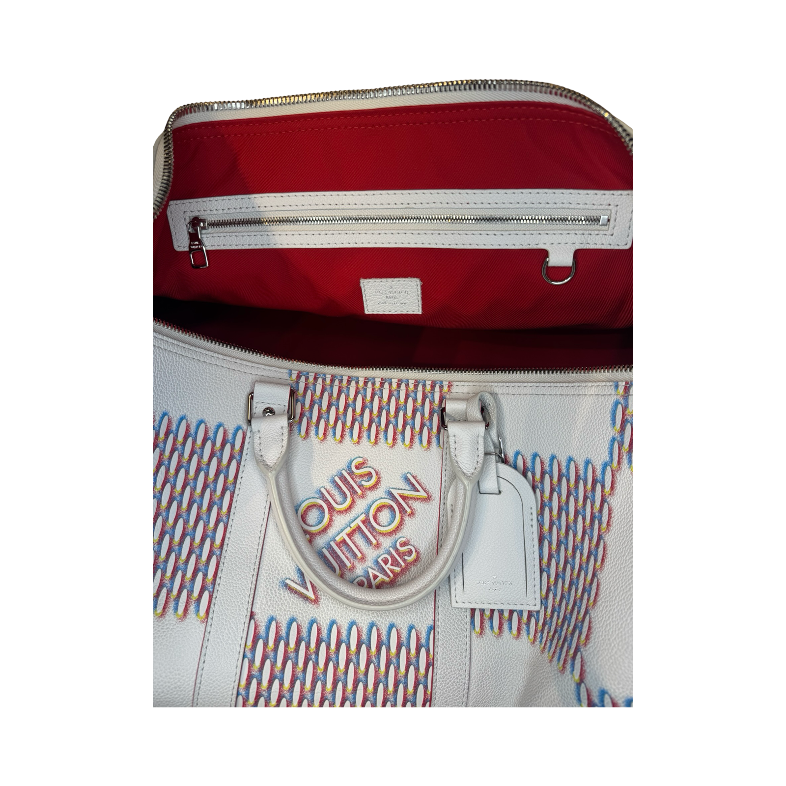 DETAILS: Exclusive Louis Vuitton Keepall from the Virgil Abloh era, featuring the iconic “Spray” collection design. Crafted in all-leather with silver hardware and a bold red interior for a striking, modern finish.
