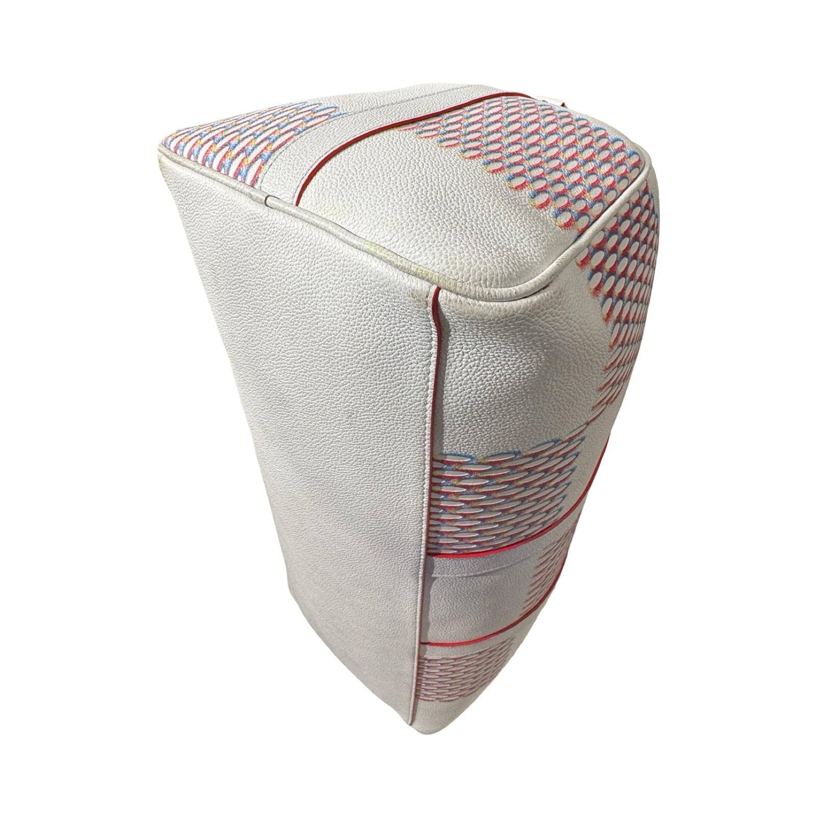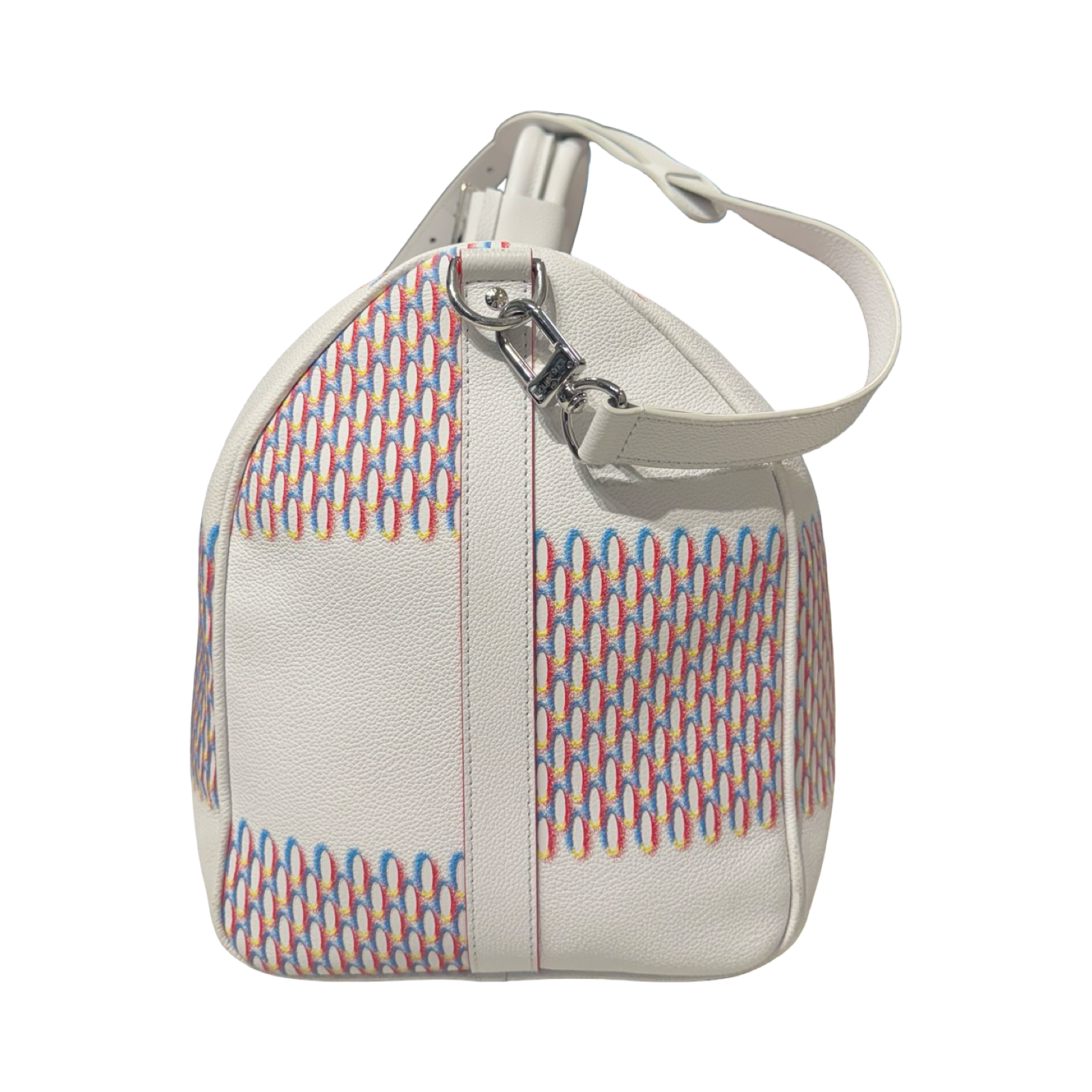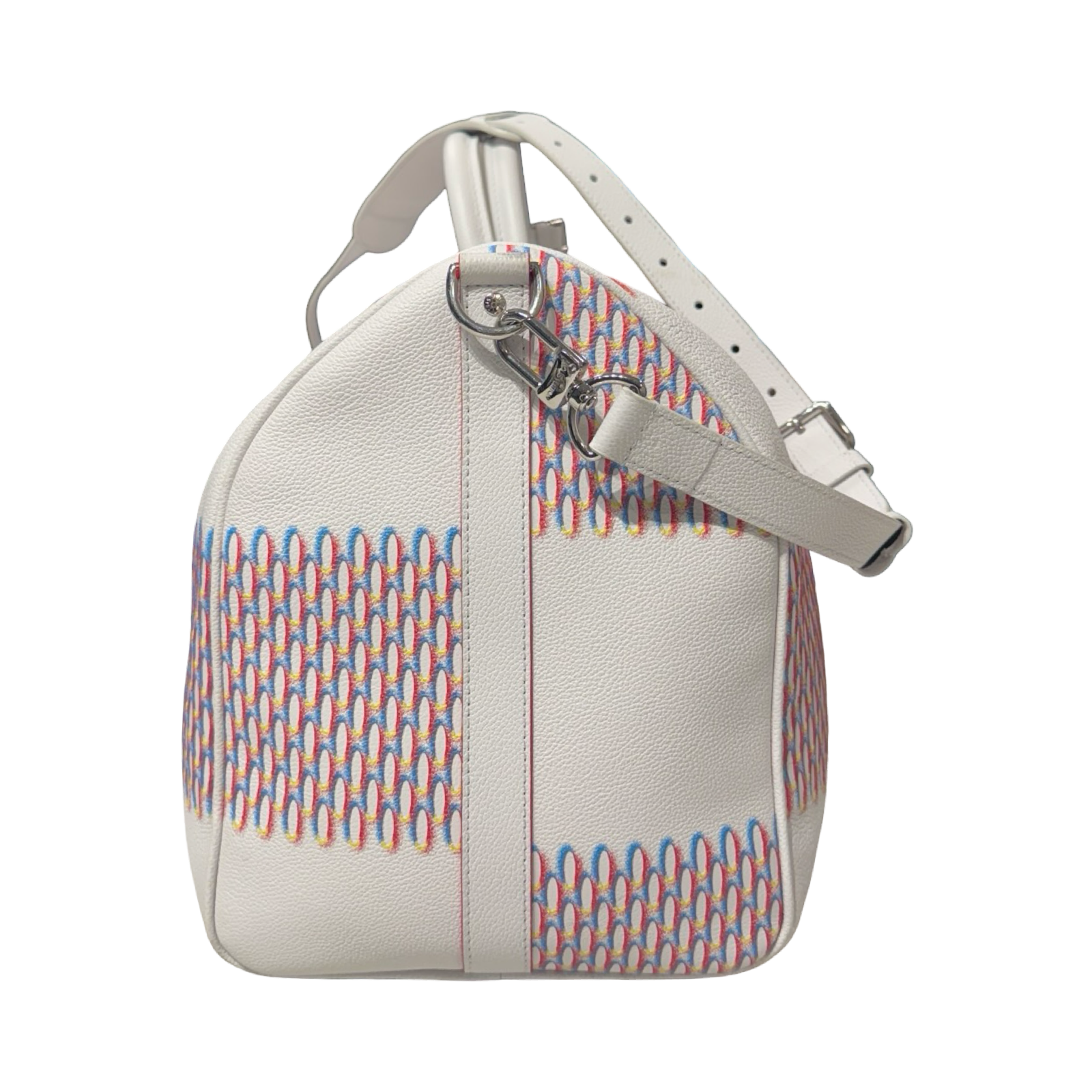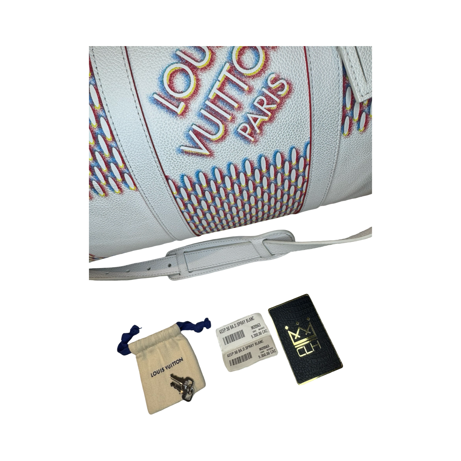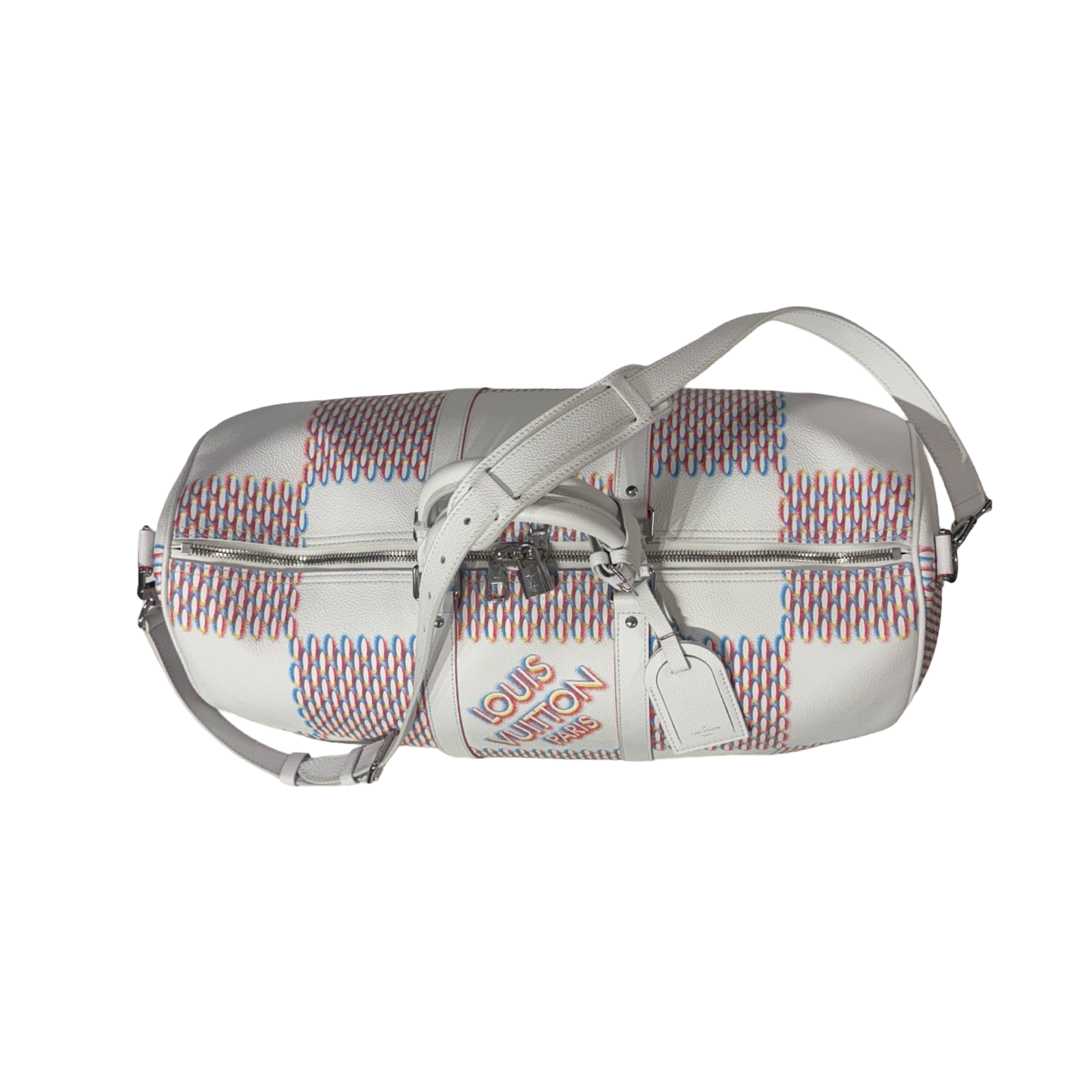 DETAILS: Exclusive Louis Vuitton Keepall from the Virgil Abloh era, featuring the iconic “Spray” collection design. Crafted in all-leather with silver hardware and a bold red interior for a striking, modern finish.