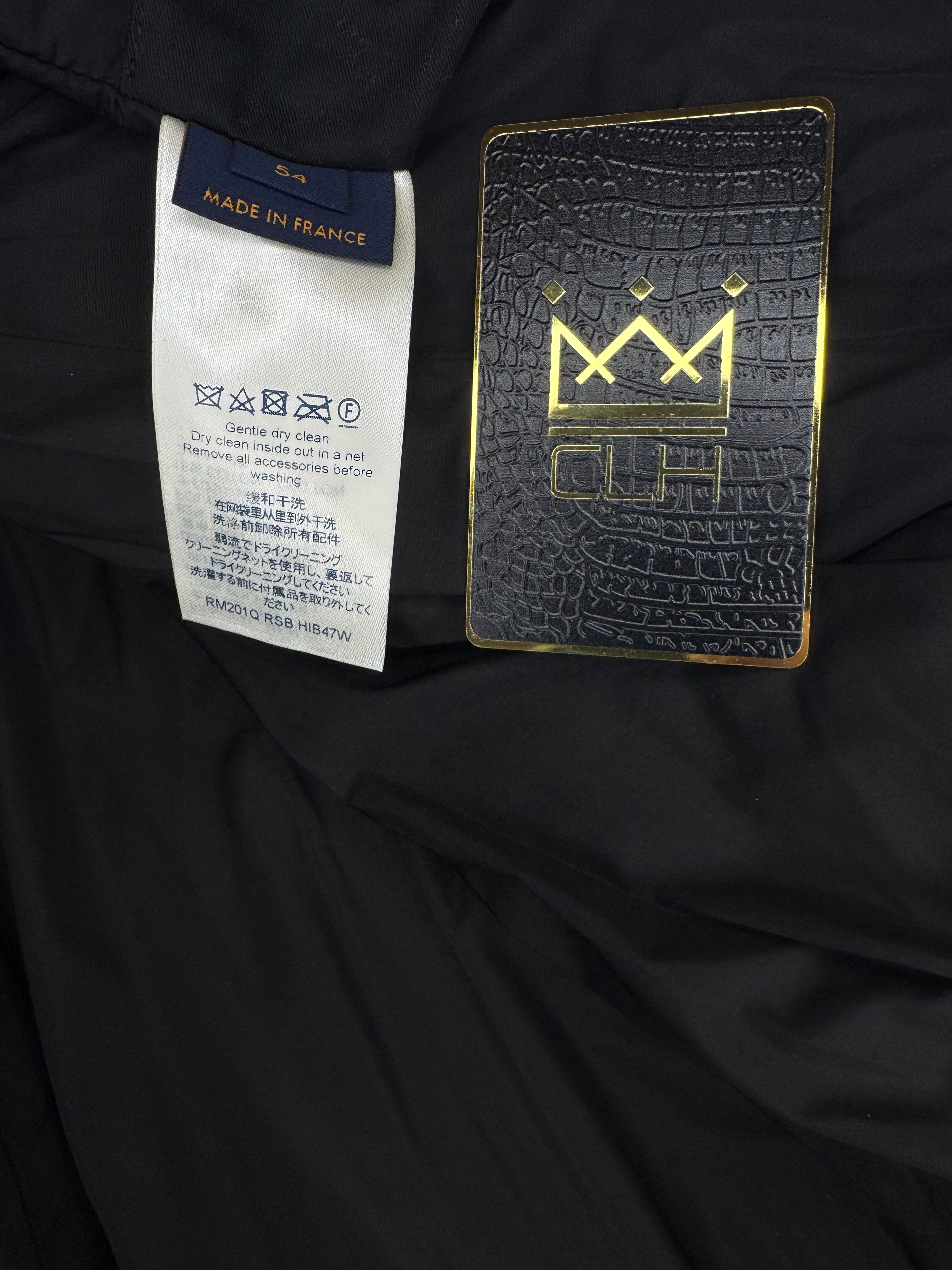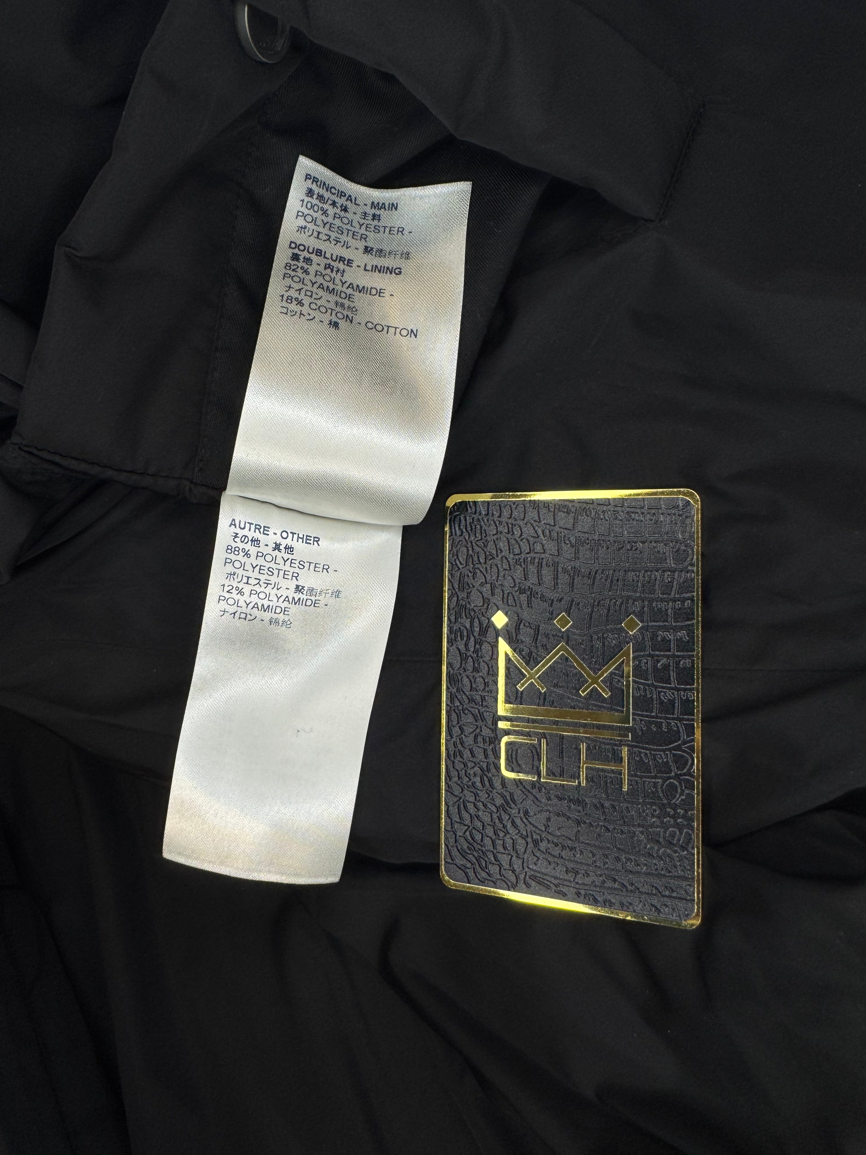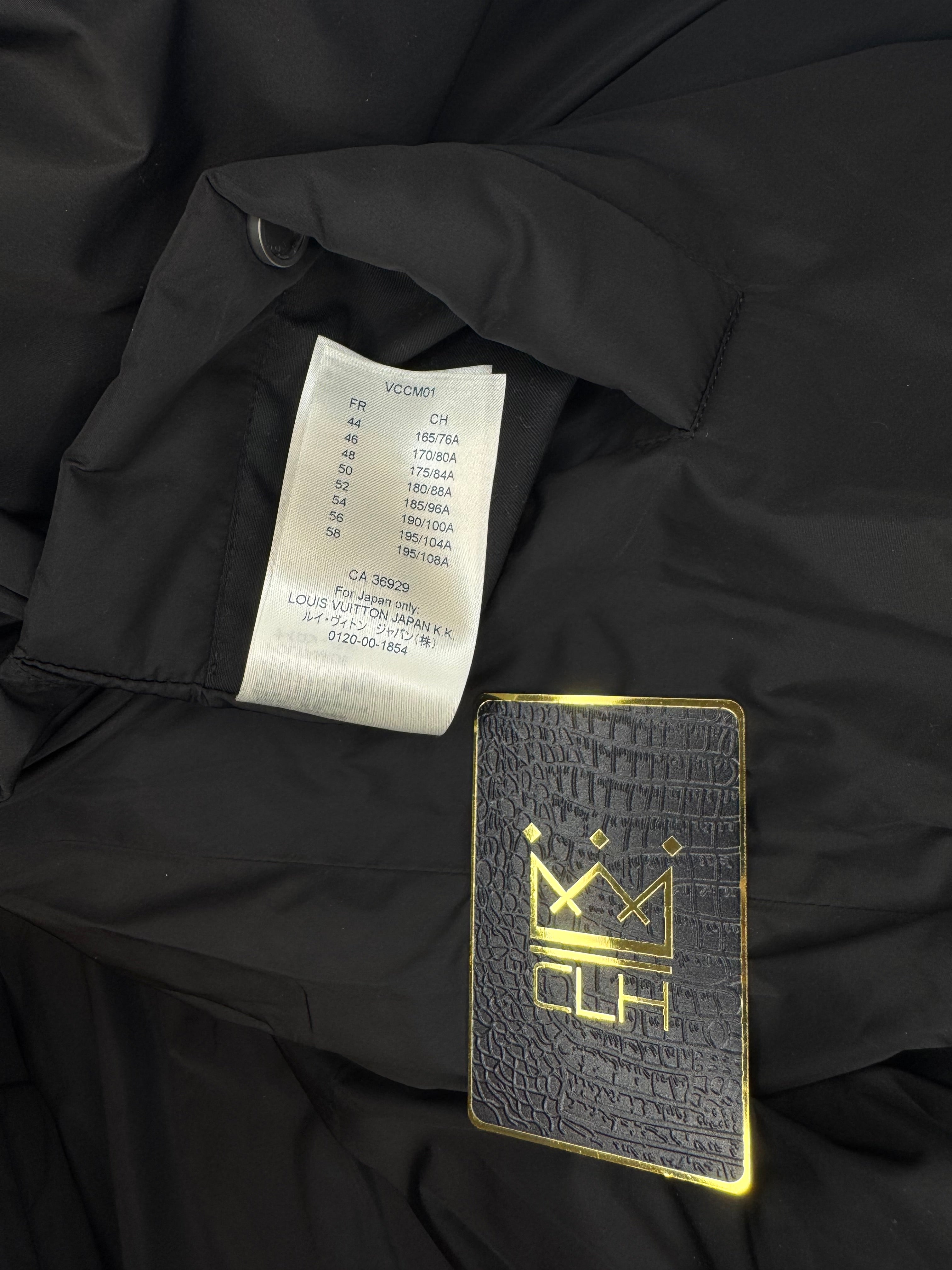 DETAILS: This black lightweight hooded jacket featuring a quilted Monogram Flower motif is an iconic item from the Staples edition. The current iteration is made from matte technical fabric and has two zipped pockets at the front. Finishing touches include an engraved staple signature on the back and a removable carabiner with a tonal Louis Vuitton. Reversible to a an all black side with stitched LV logo on the chest.