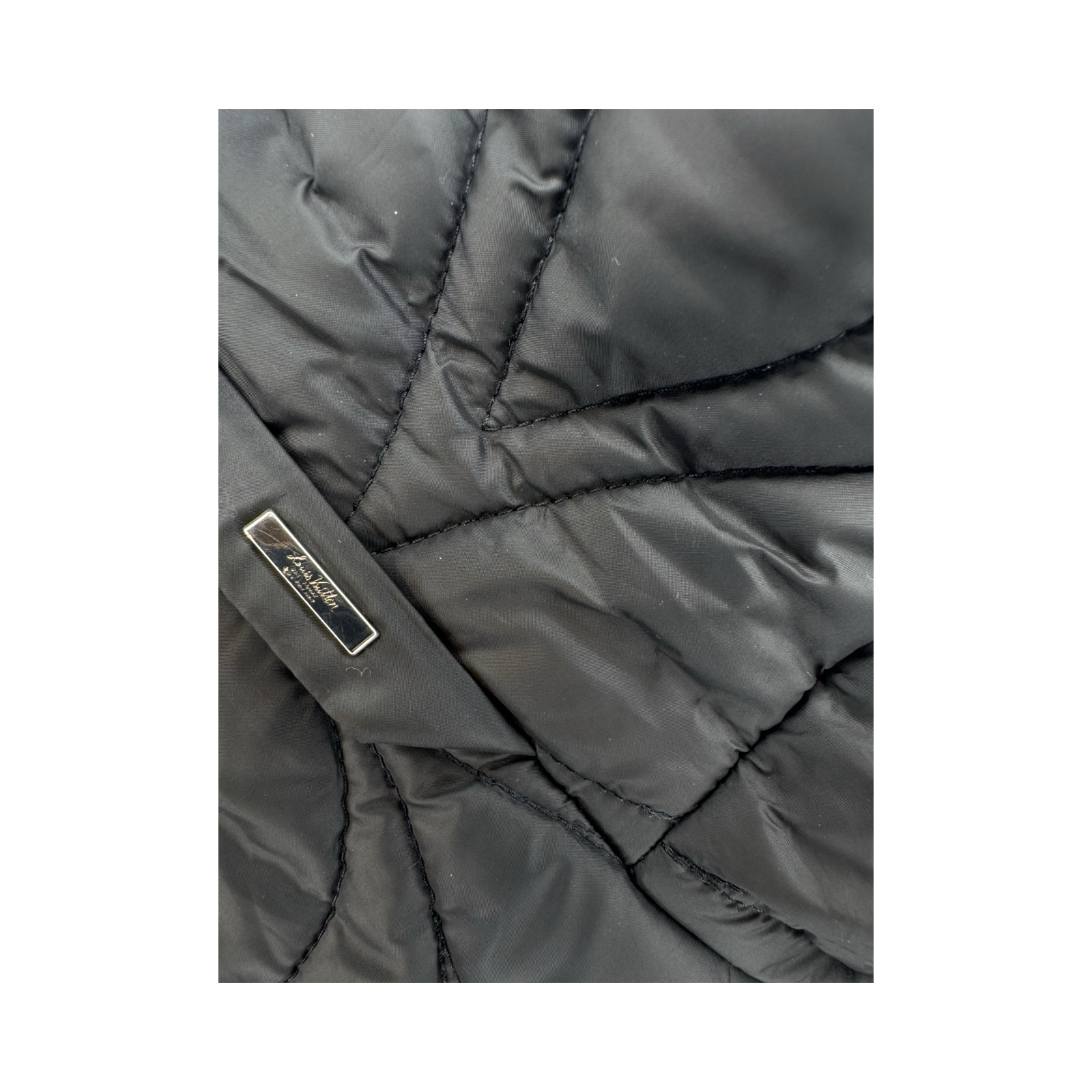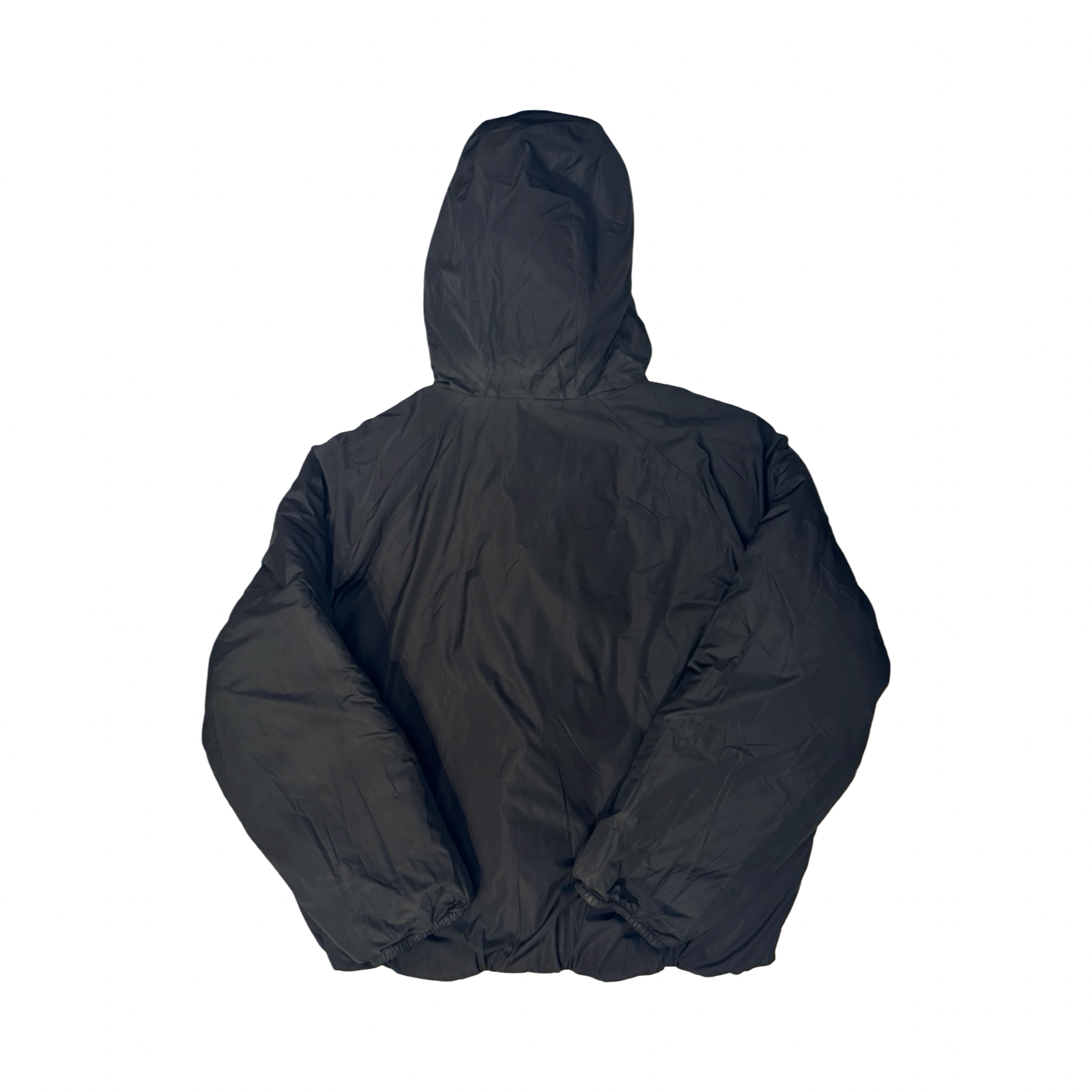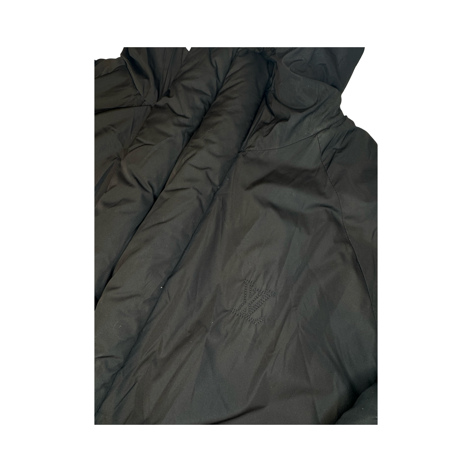 DETAILS: This black lightweight hooded jacket featuring a quilted Monogram Flower motif is an iconic item from the Staples edition. The current iteration is made from matte technical fabric and has two zipped pockets at the front. Finishing touches include an engraved staple signature on the back and a removable carabiner with a tonal Louis Vuitton. Reversible to a an all black side with stitched LV logo on the chest.