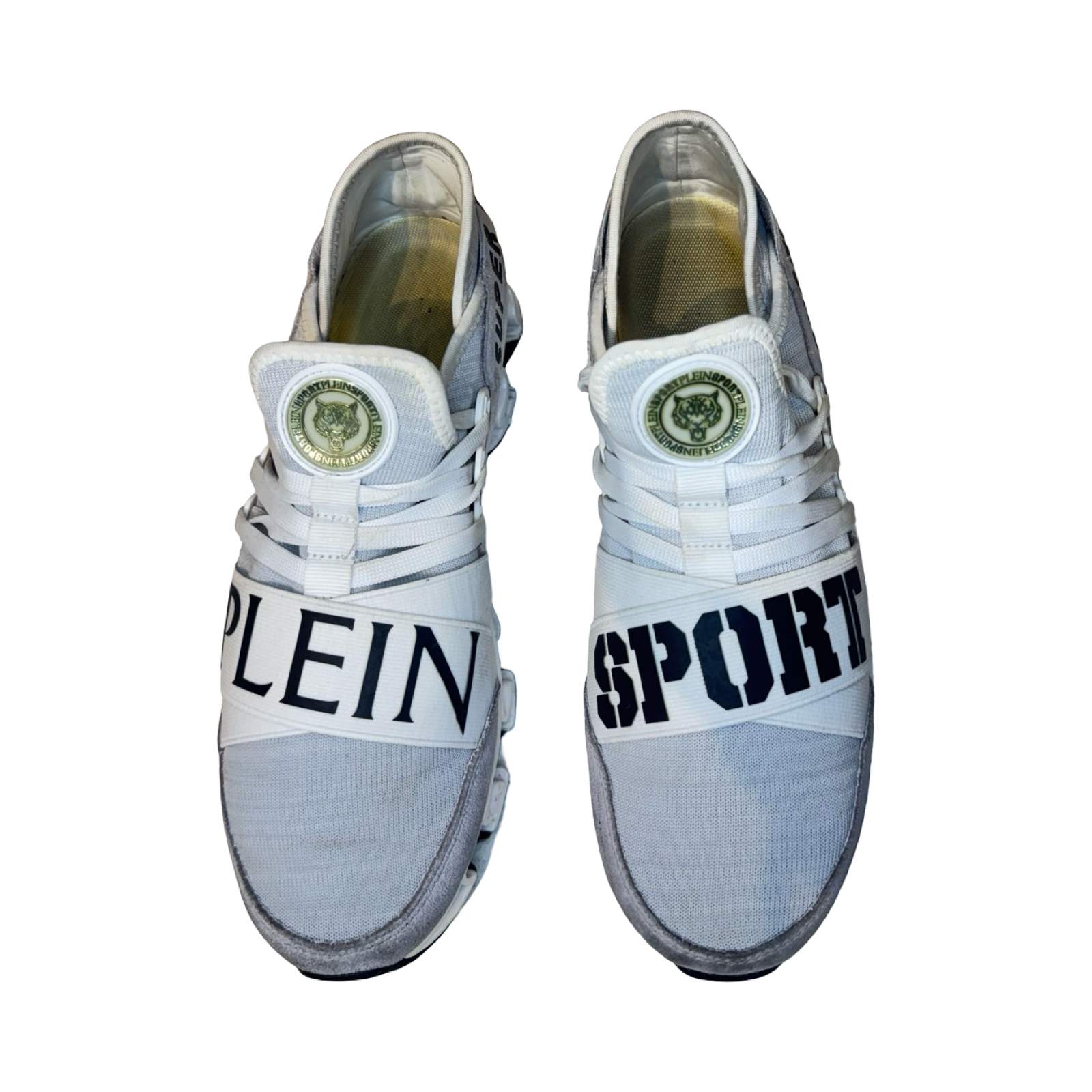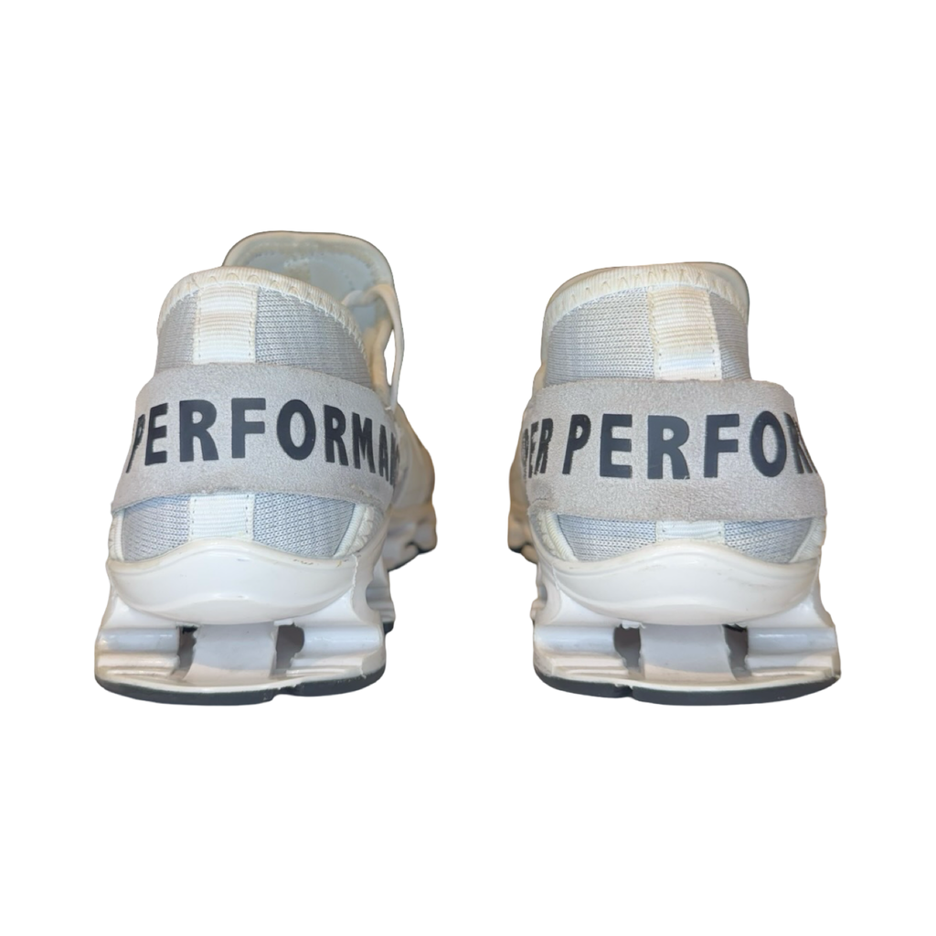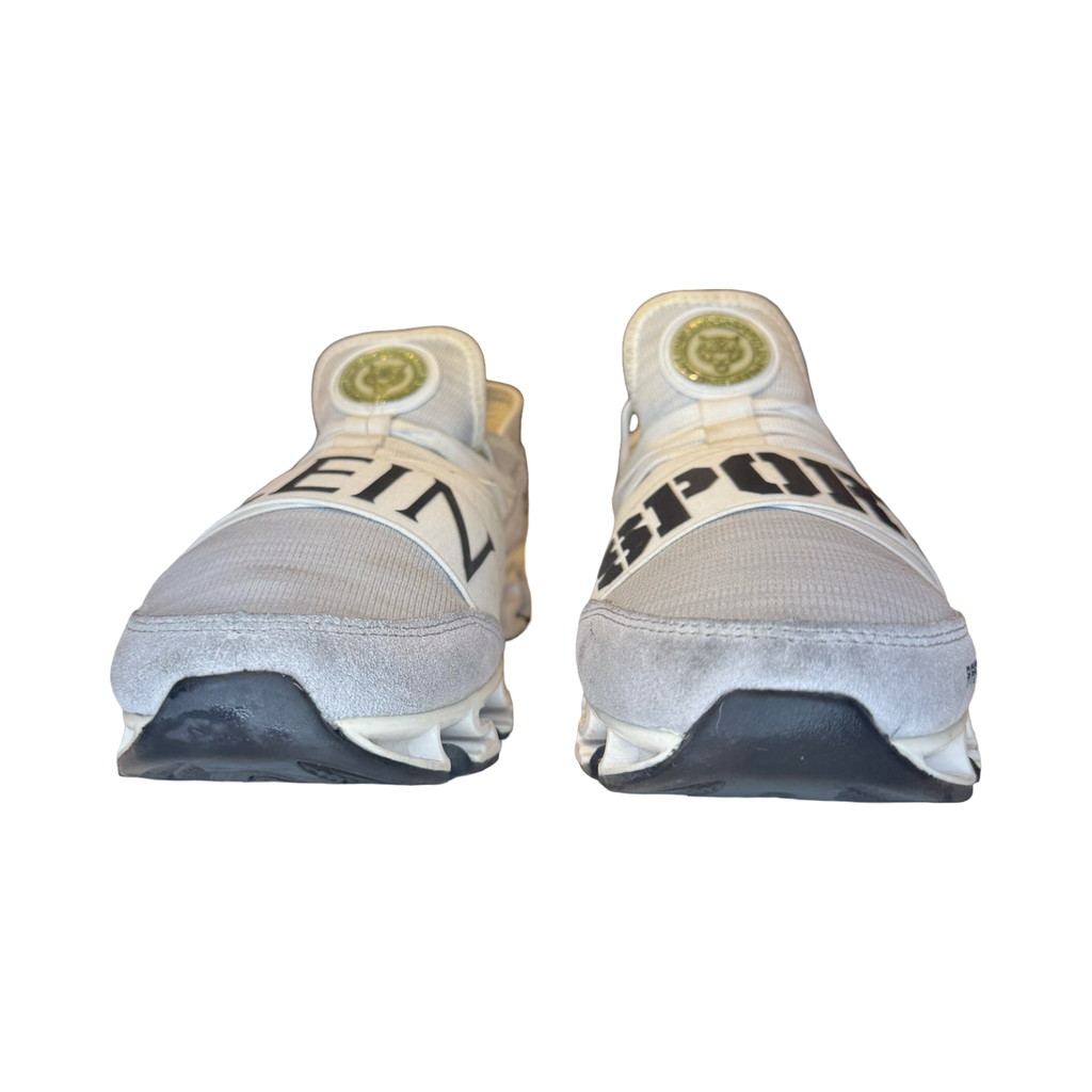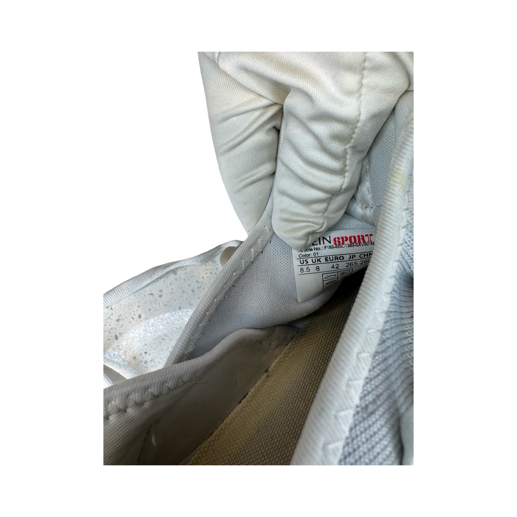 DETAILS: Low-top sport sneakers in white knit material, rubber logo on front, lace-up closure, and treaded rubber sole.