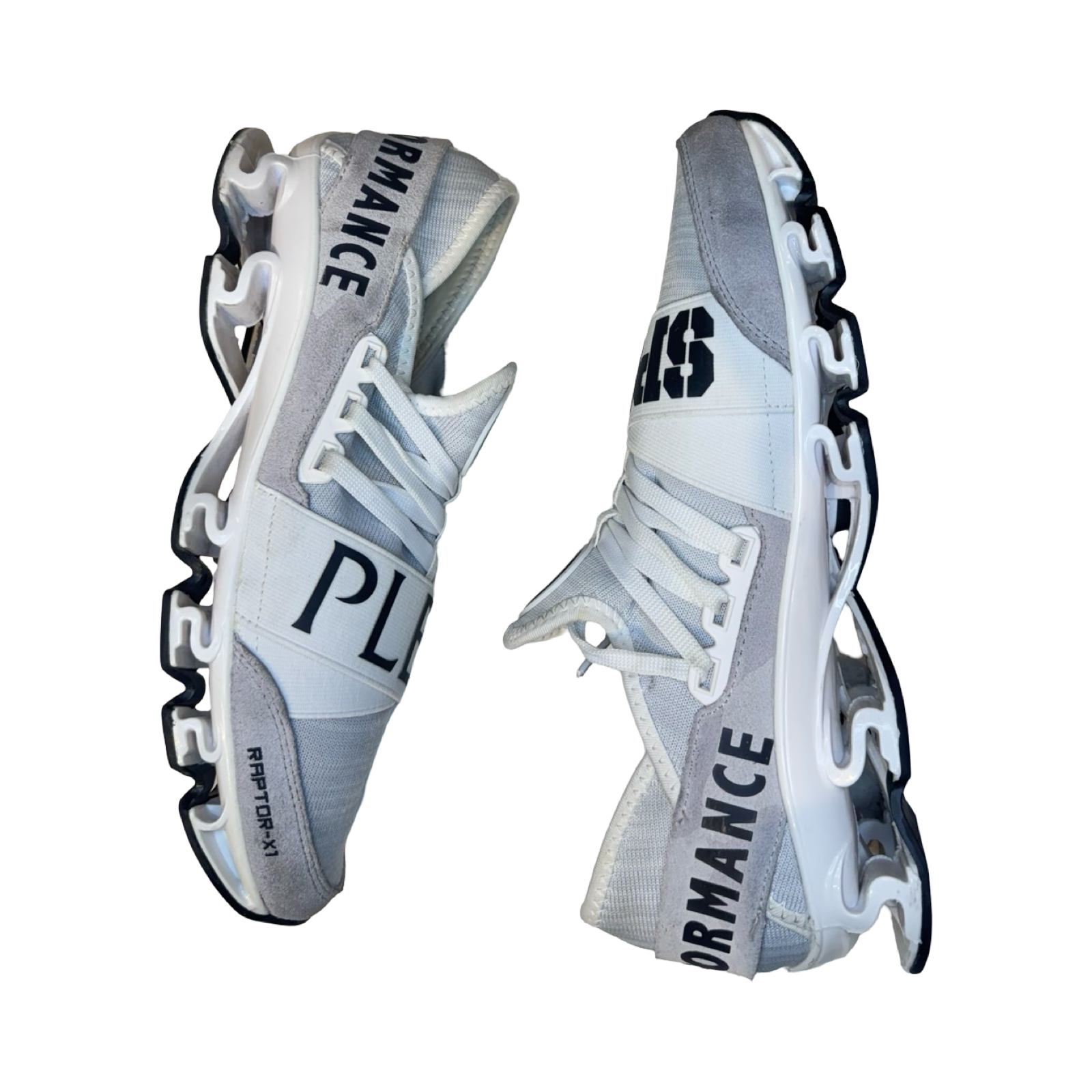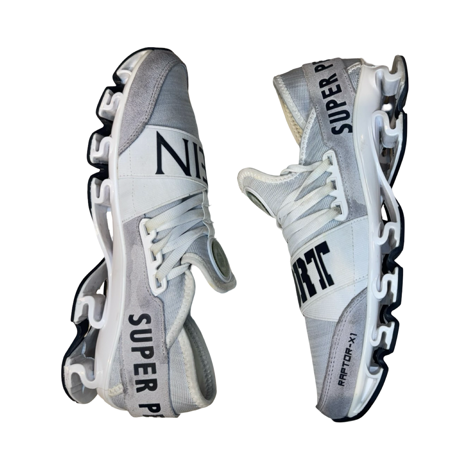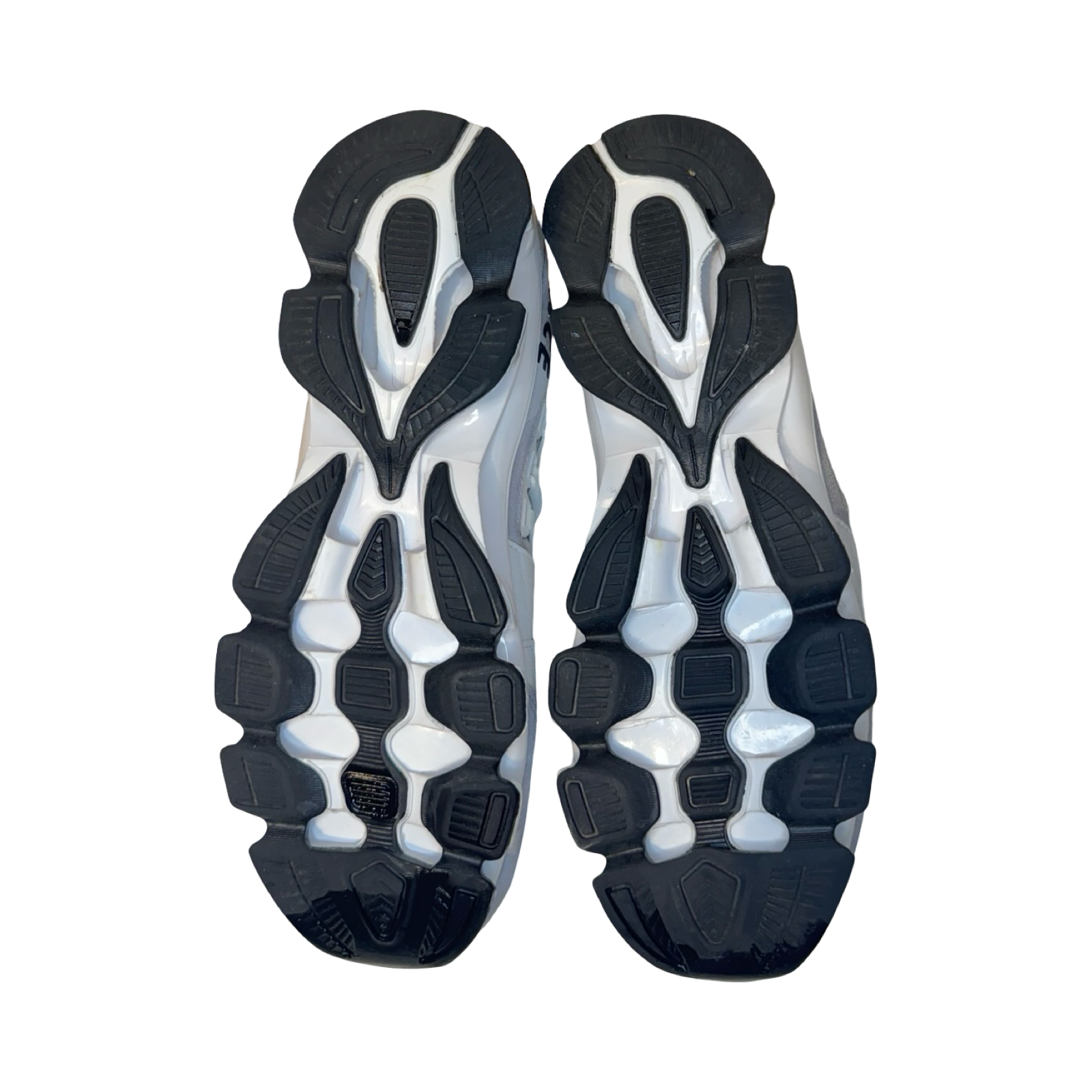 DETAILS: Low-top sport sneakers in white knit material, rubber logo on front, lace-up closure, and treaded rubber sole.