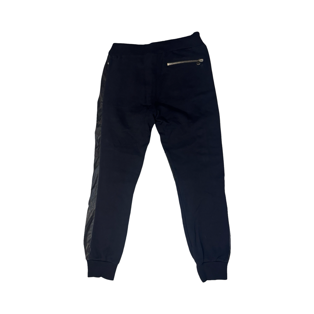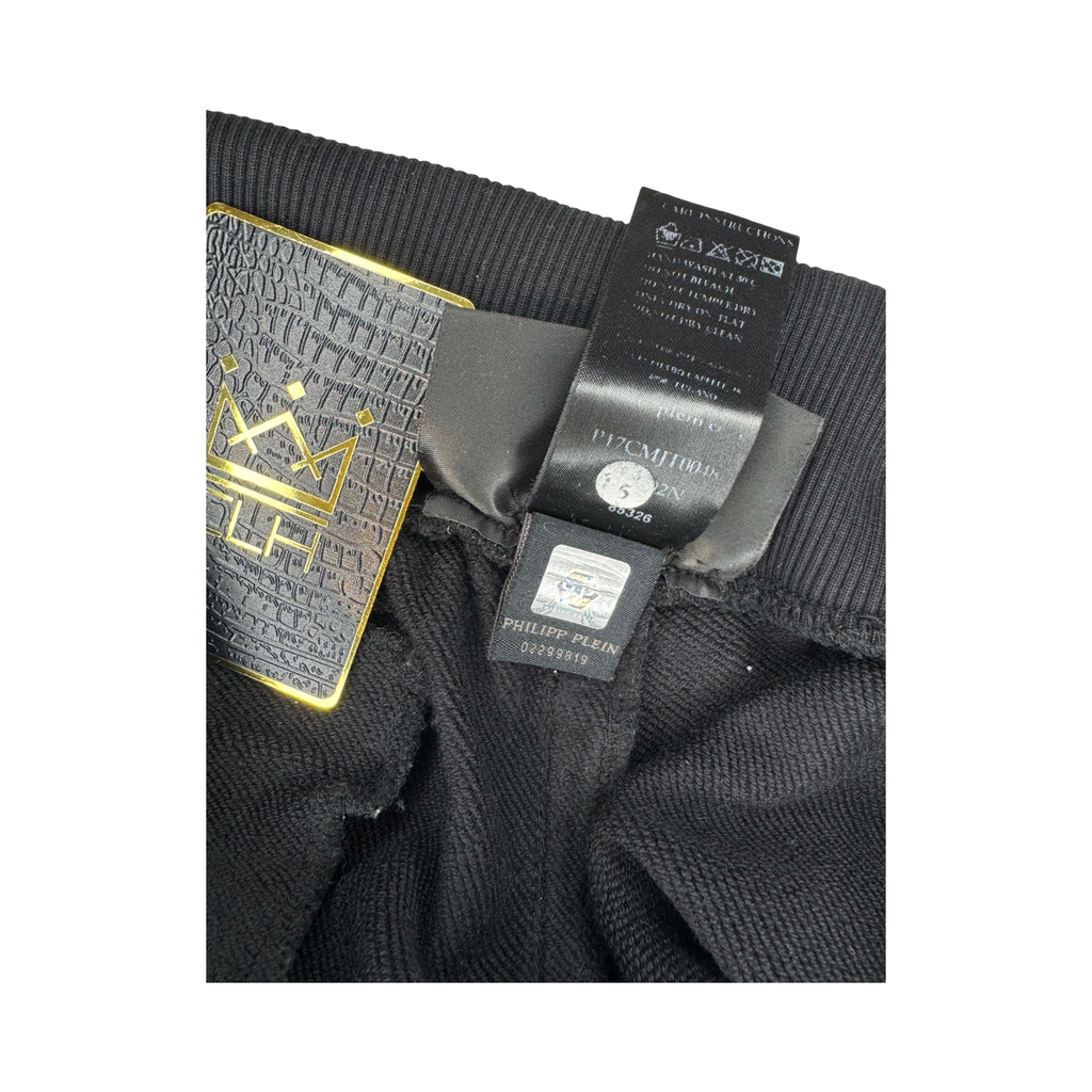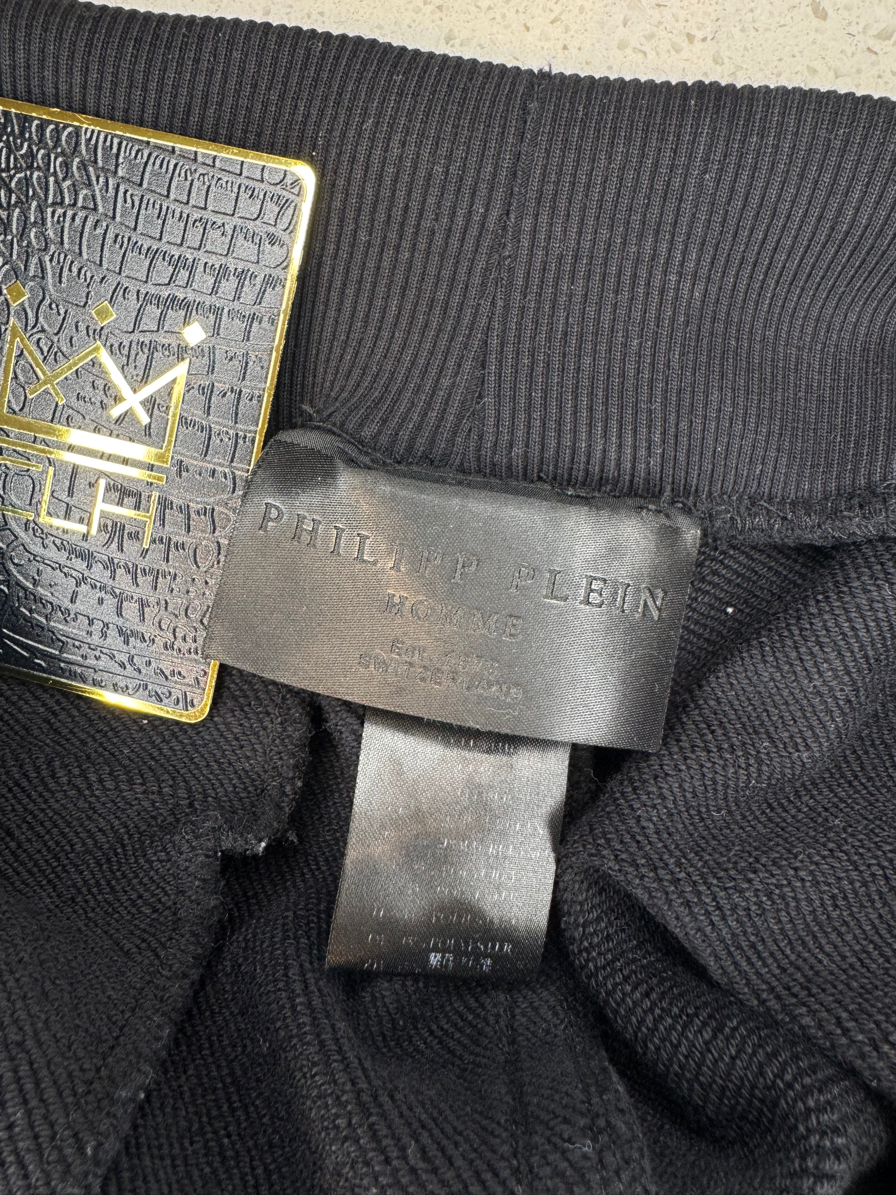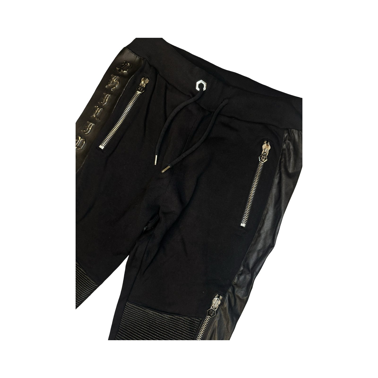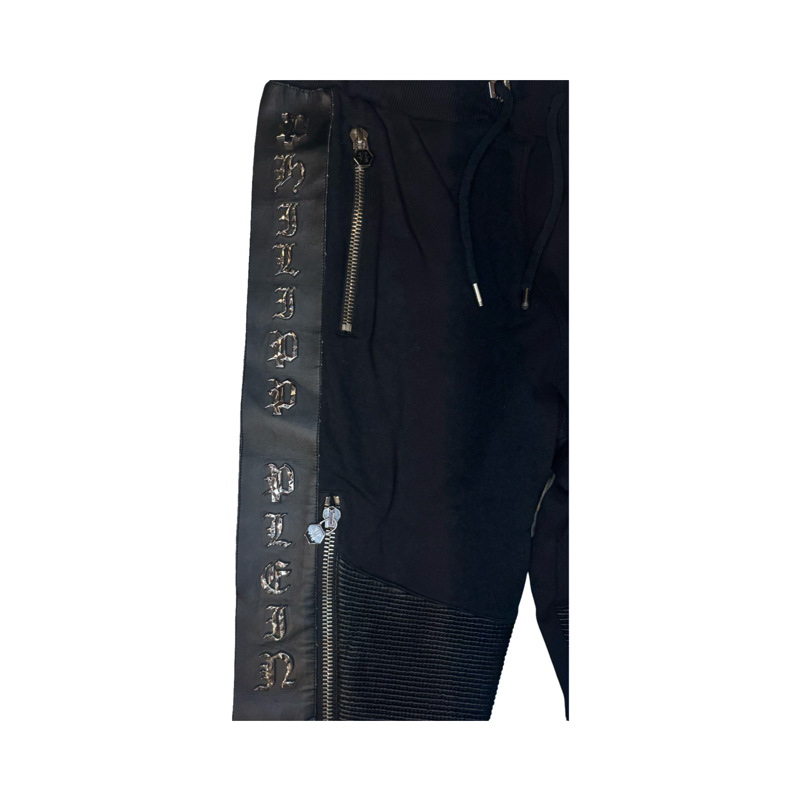 DESCRIPTION: The Philipp Plein sweatpants in biker style featuring ribber knee patches, large zippers, cuffed ankles, large logo along right side on the leg.