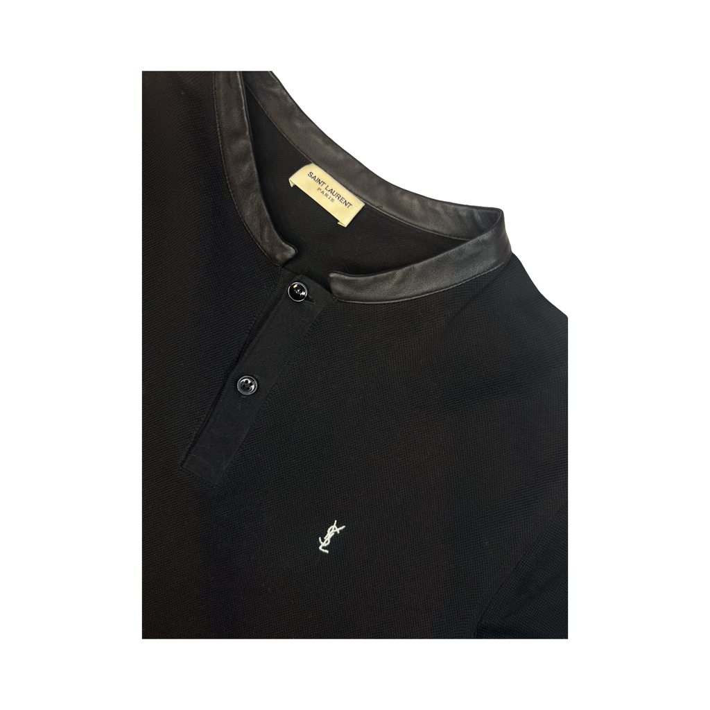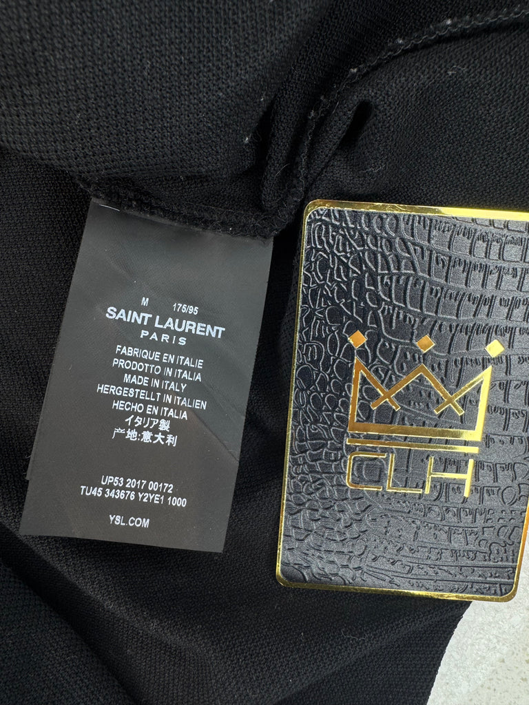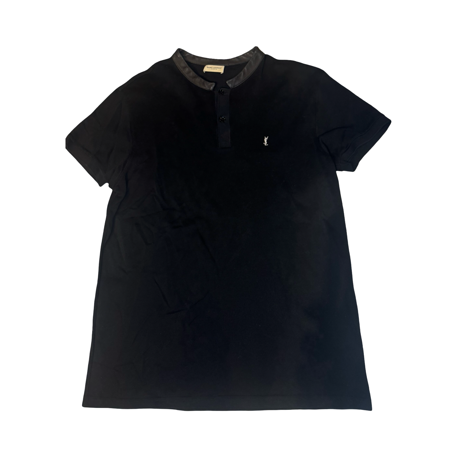 DETAILS: Short sleeve T-shirt in black with YSL embroidered logo on the front. Slim fit. Leather lining on the collar. Made in Italy.