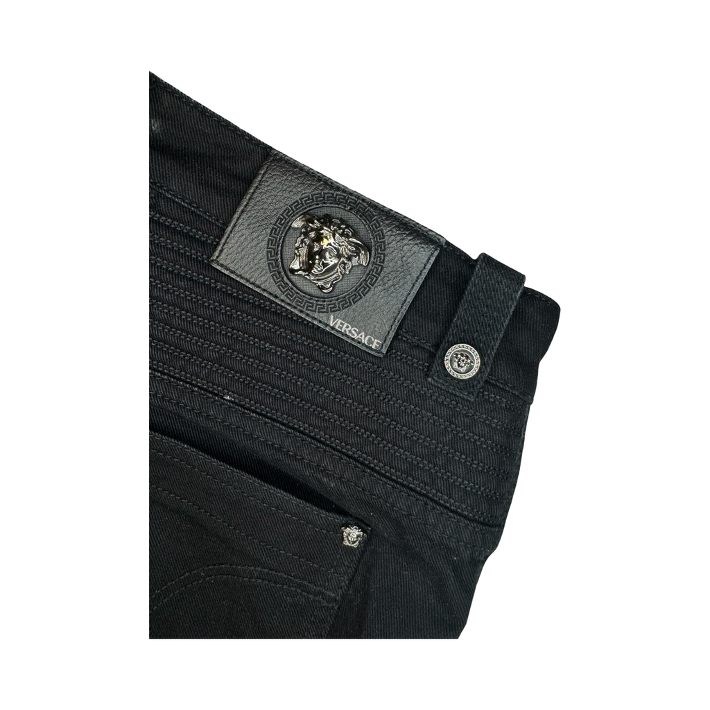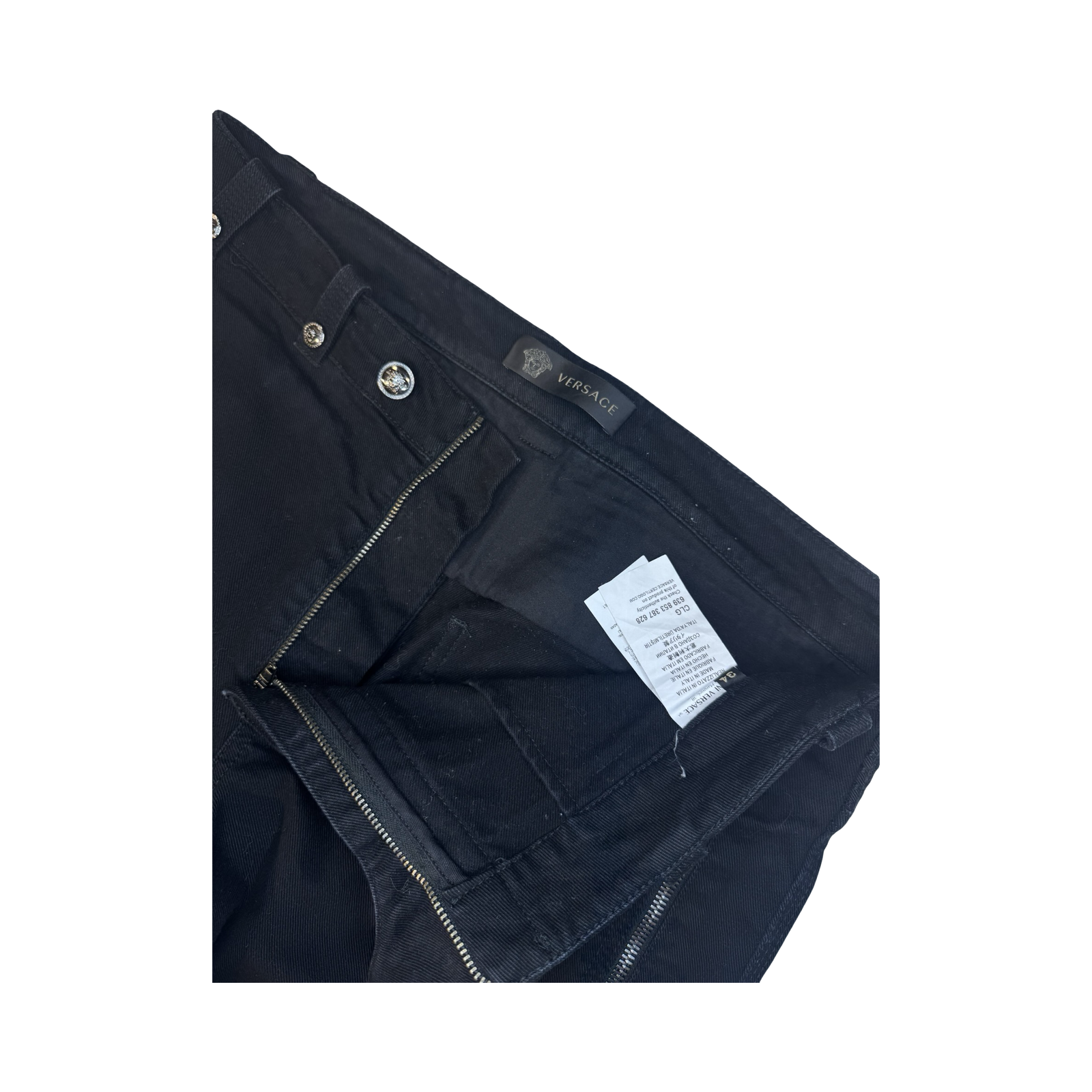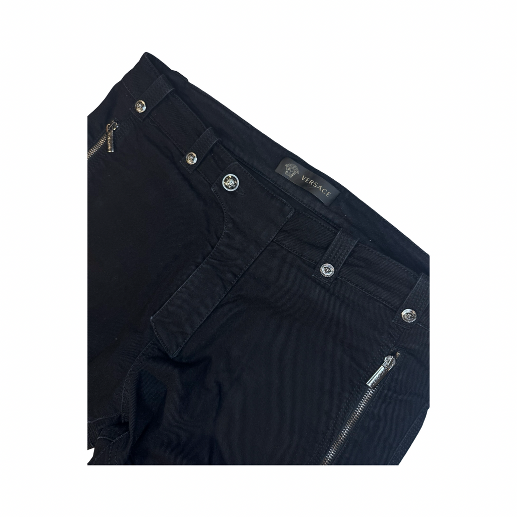DETAILS: Versace denim in black featuring zip pockets, biker ribbed effect on knees and medusa head on buttons. Made in Italy.