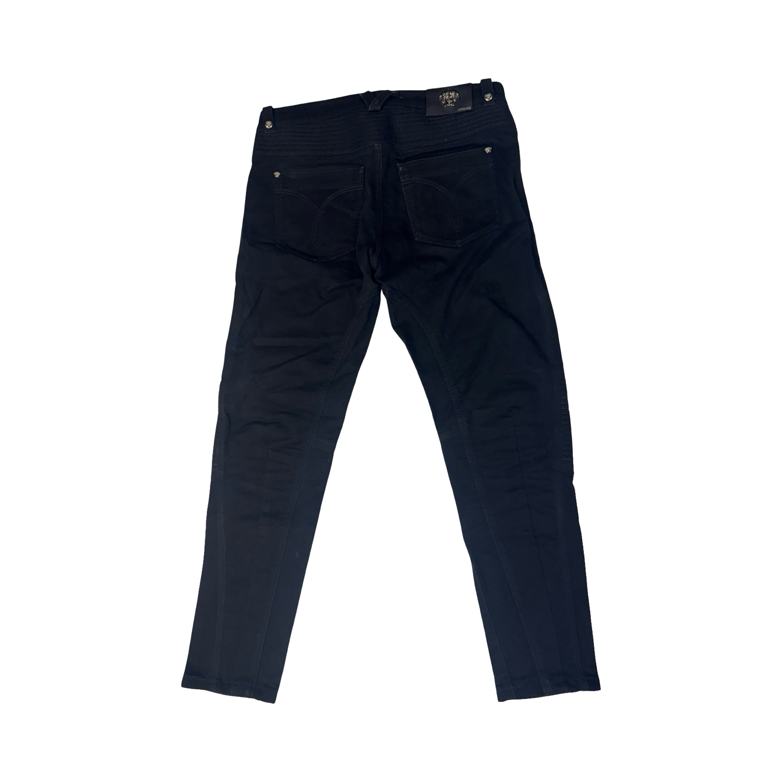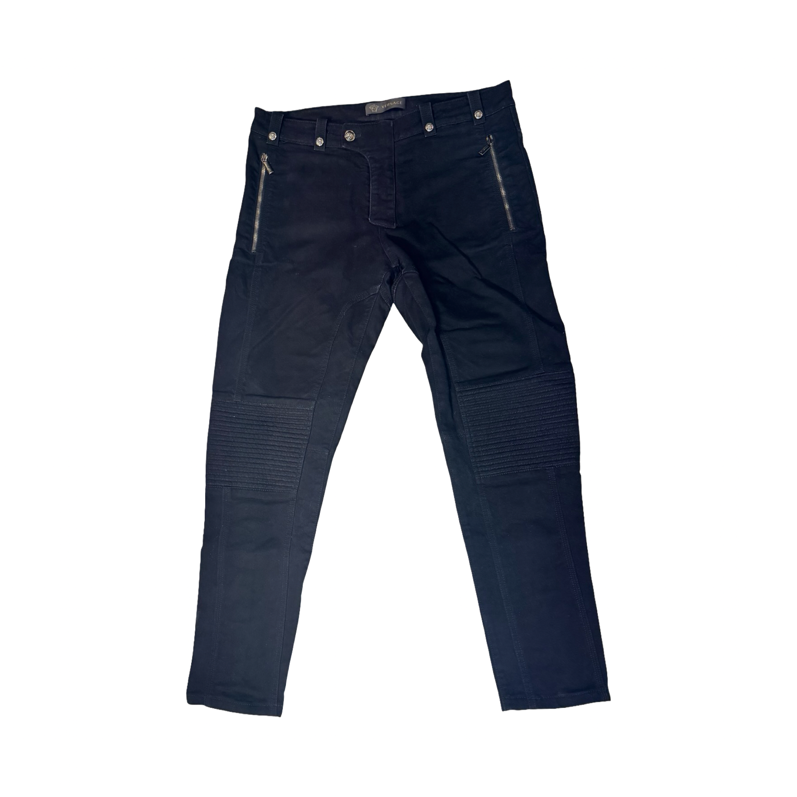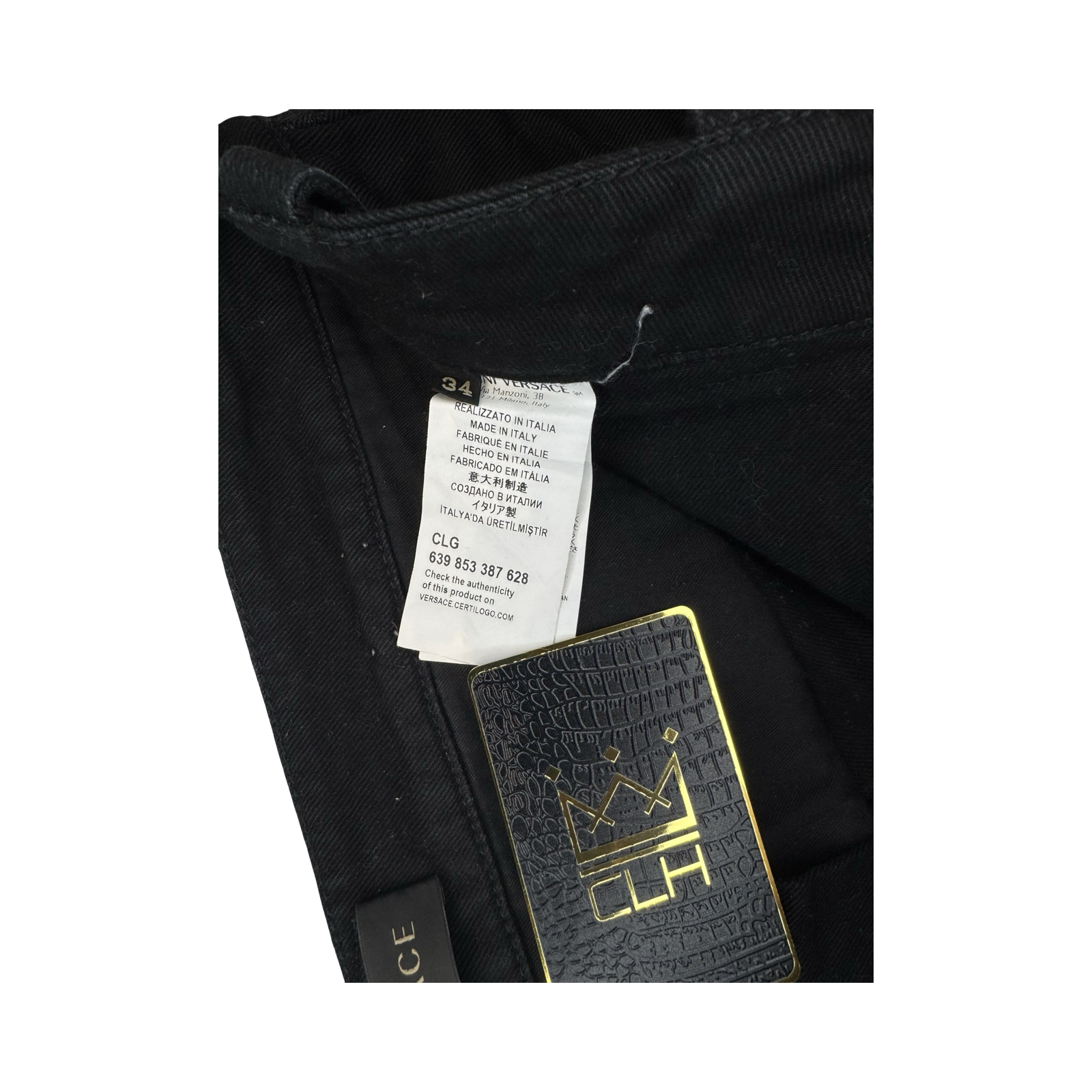 DETAILS: Versace denim in black featuring zip pockets, biker ribbed effect on knees and medusa head on buttons. Made in Italy.